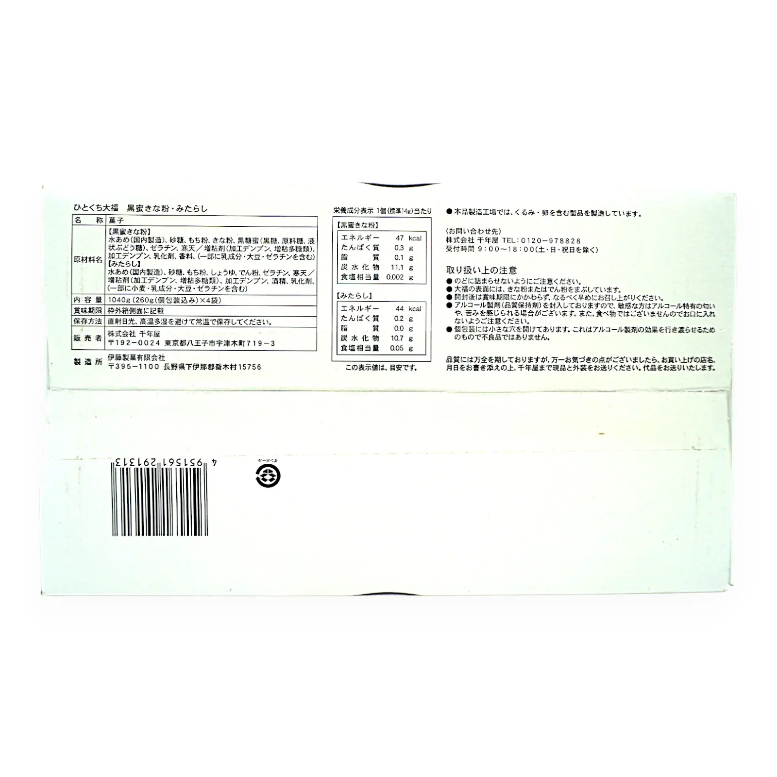 | 原材料名 | 【黒蜜きな粉】水あめ(国内製造)、砂糖、もち粉、きな粉、黒糖蜜(黒糖、原料糖、液状ぶどう糖)、ゼラチン、寒天/増粘剤(加エデンプン、増粘多糖類)、加工デンプン、乳化剤、香料、(一部に乳成分・大豆・ゼラチンを含む) 【みたらし】水あめ(国内製造)、砂糖、もち粉、しょうゆ、でん粉、ゼラチン、寒天/増粘剤(加工デンプン、増粘多糖類)、加工デンプン、酒精、乳化剤、(一部に小麦・乳成分・大豆・ゼラチンを含む) |