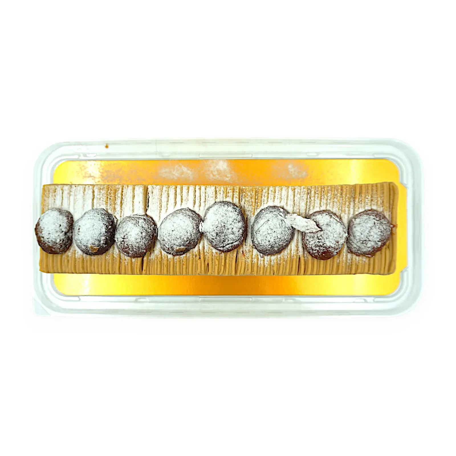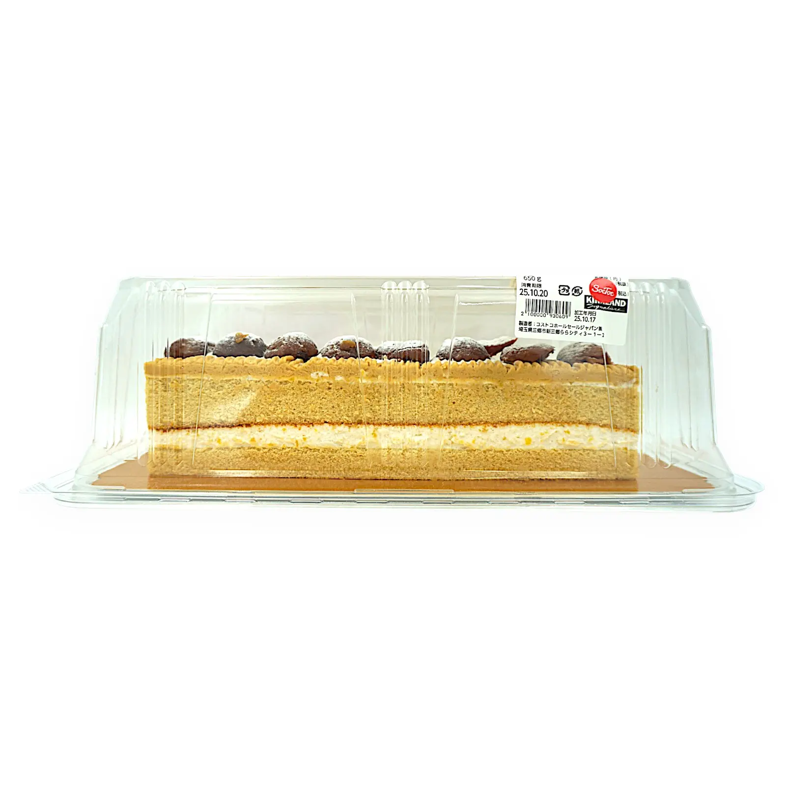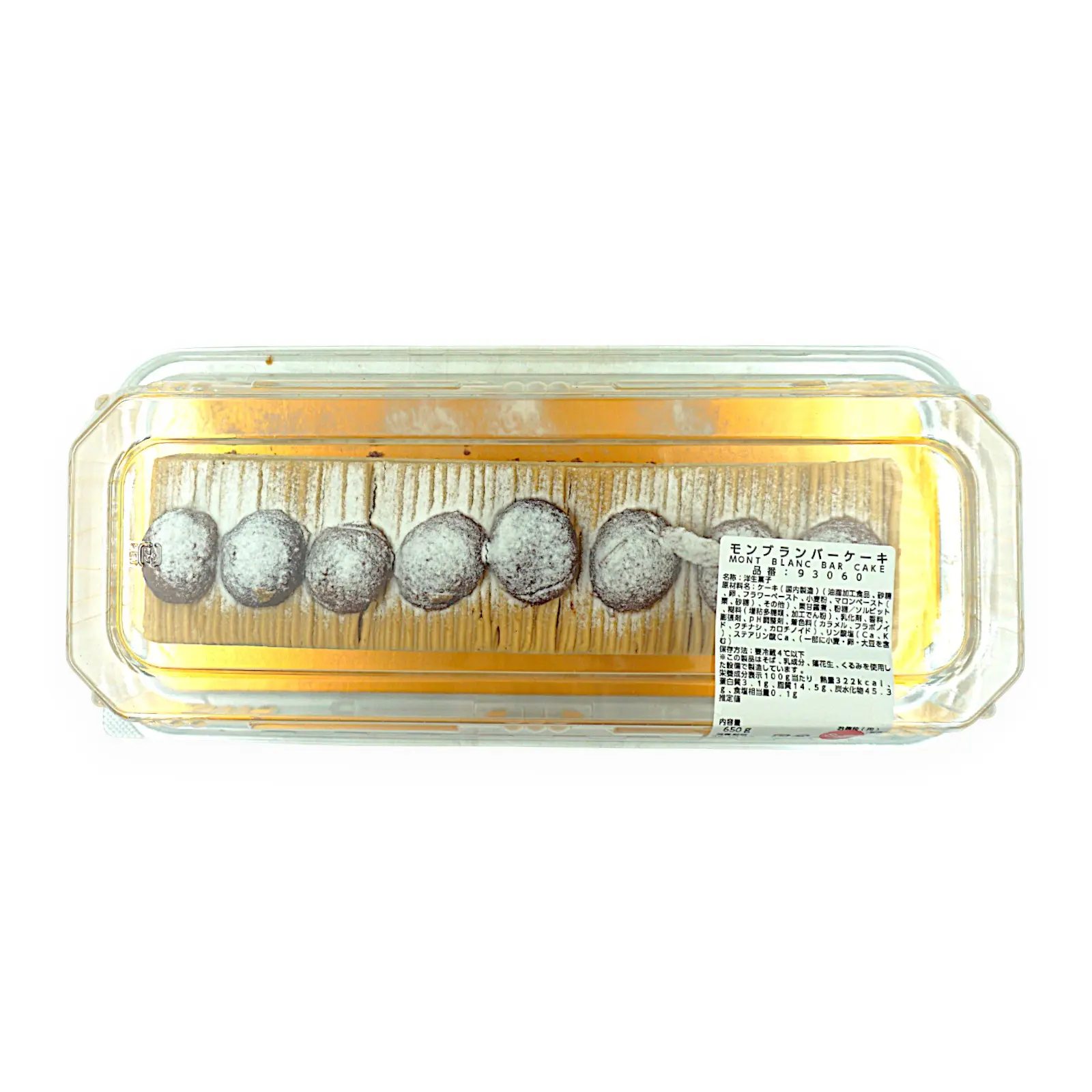 ケーキ(国内製造)(油脂加工食品、砂糖、卵、フラワーペースト、小麦粉、マロンペースト(栗、砂糖)、その他)、栗甘露煮、粉糖/ソルビット、糊料(増粘多糖類、加工でん粉)、乳化剤、香料、膨張剤、pH調整剤、着色料(カラメル、フラボノイド、クチナシ、カロチノイド)、リン酸塩(Ca、K)、ステアリン酸Ca、(一部に小麦・卵・大豆を含む)