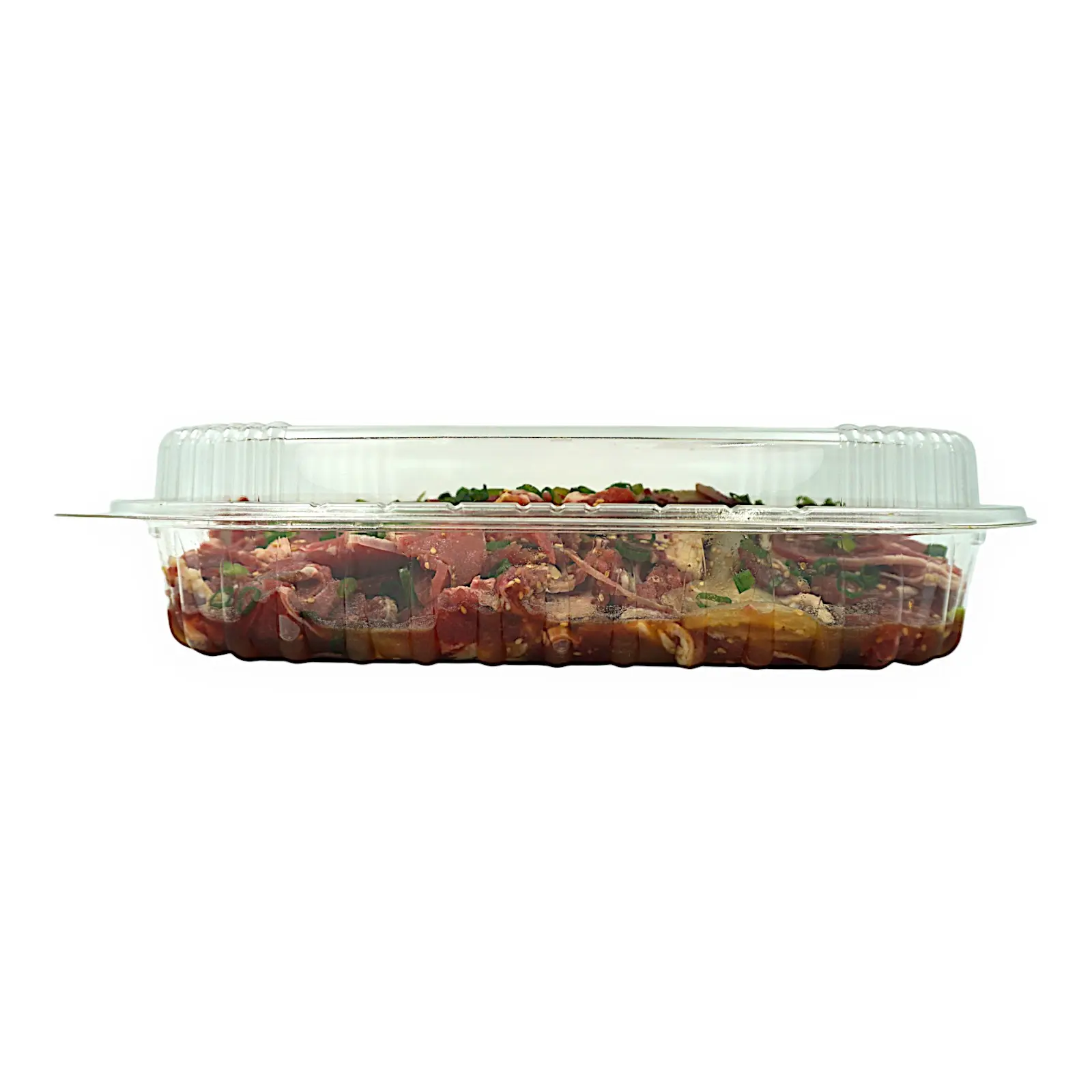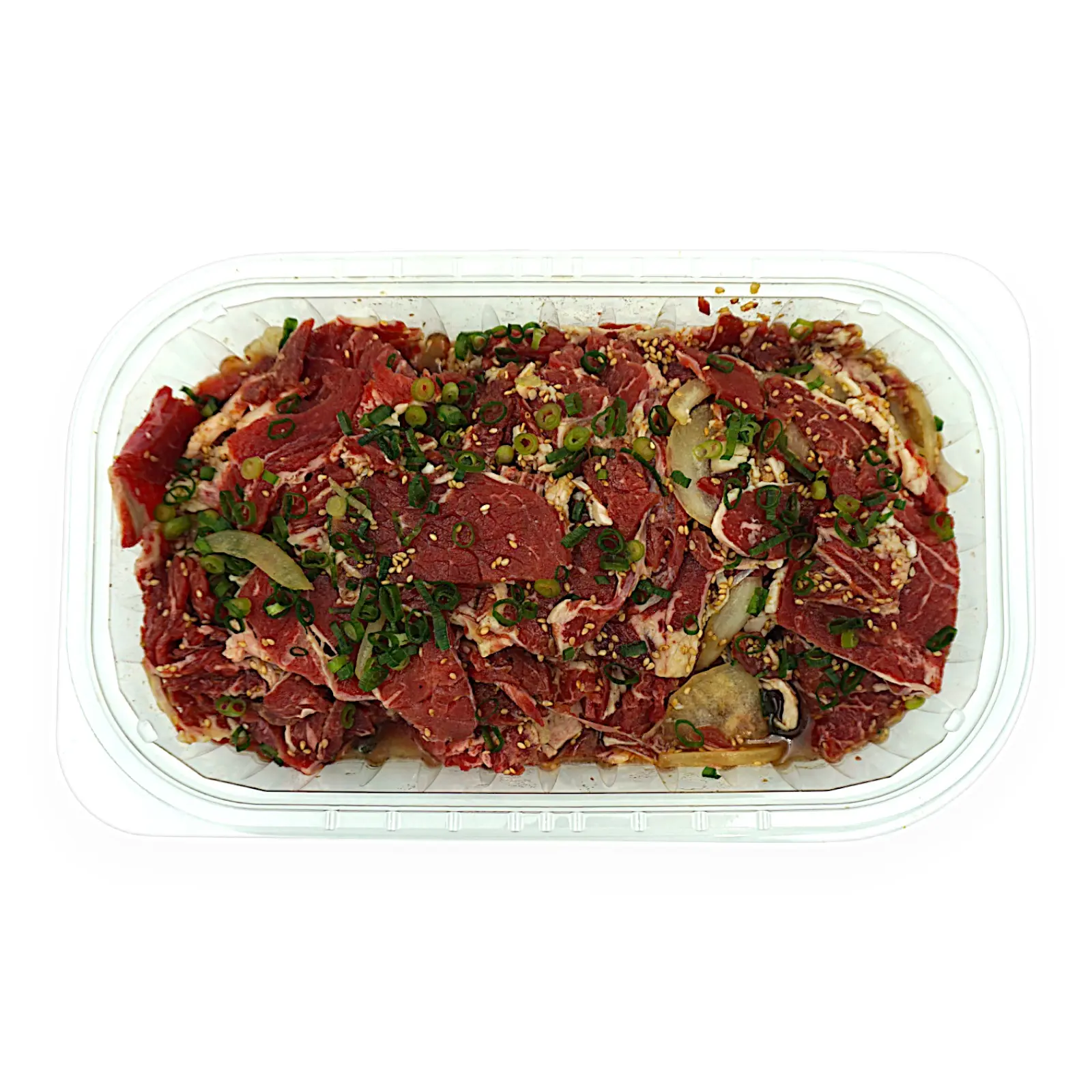 コストコ定番商品の味付け肉です。非加熱のため、お手元で加熱していただいて完成となります。醤油ベースの甘辛ダレに牛肉が漬けられたもので、炒めるだけでメインのおかずとなります。