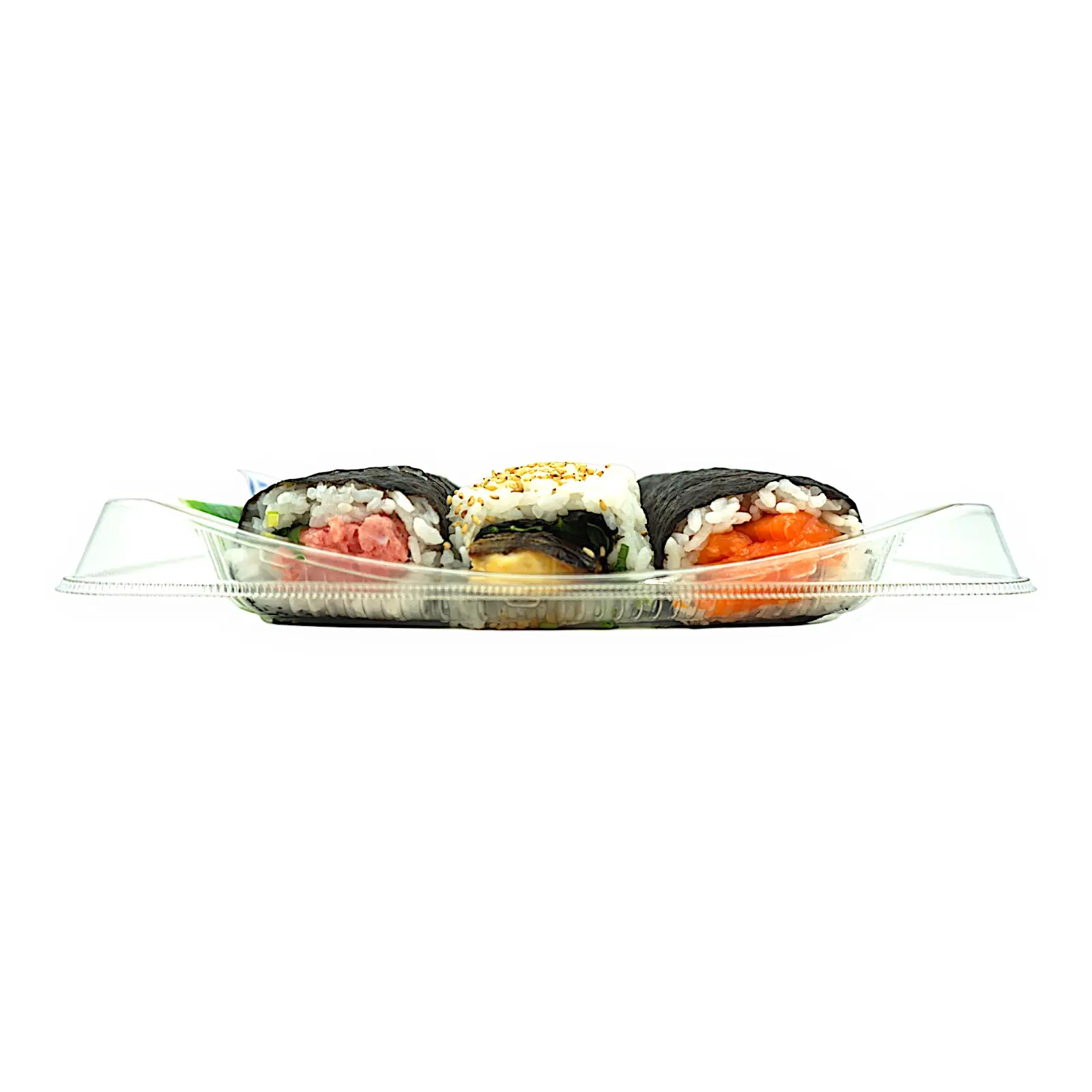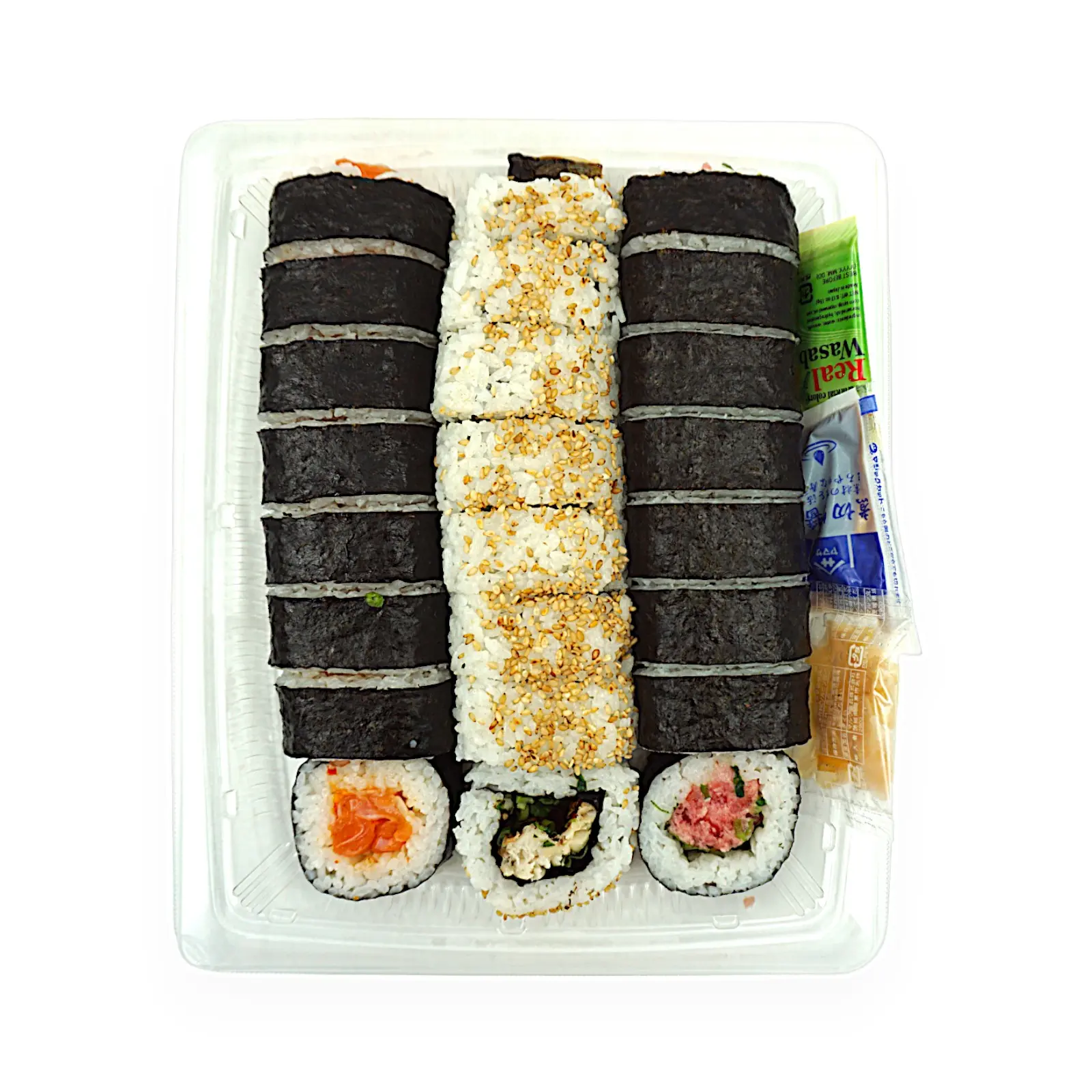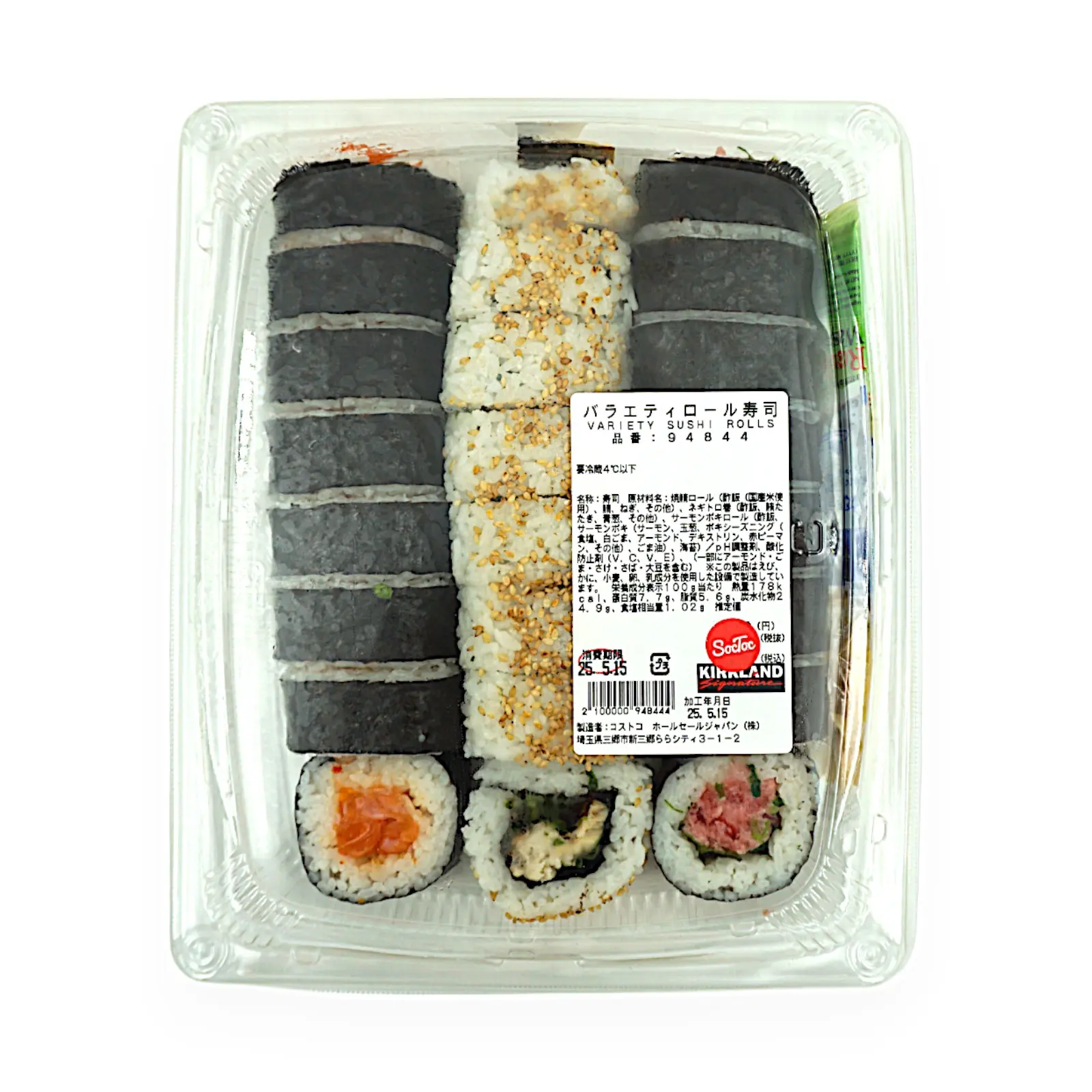 | 原材料名 | 焼鯖ロール(酢飯(国産米使用)、鯖、ねぎ、その他)、ネギトロ巻(酢飯、賄たたき、青葱、その他)、サーモンポキロール(酢飯、サーモンポキ(サーモン、玉葱、ポキシーズニング (食塩、白ごま、アーモンド、デキストリン、赤ピーマン、その他)、ごま油)、海苔)/PH調整剤、酸化防止剤(V.C、V.E)、(一部にアーモンド・こま・さけ・さば・大豆を含む) |