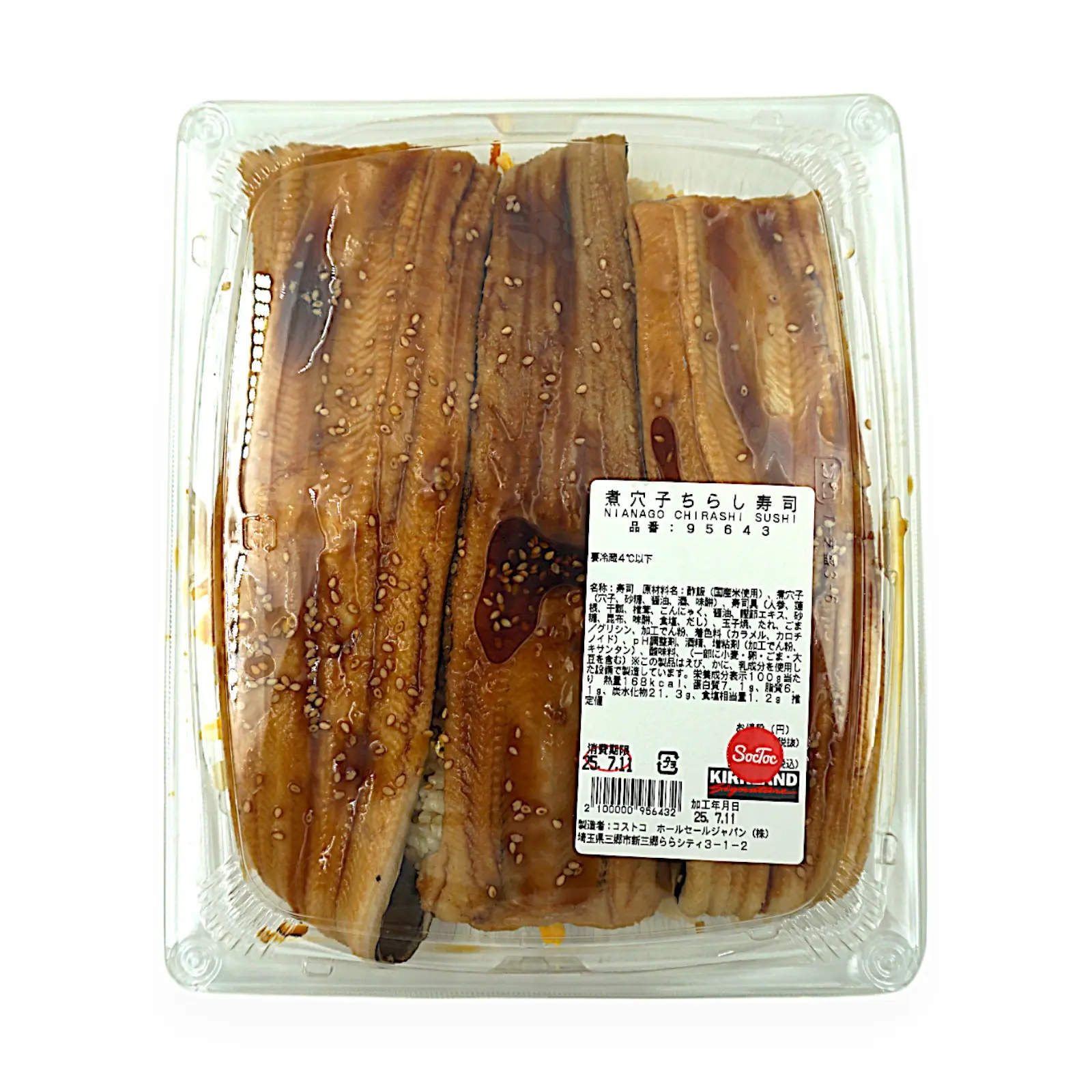 ふっくらと柔らかく煮込まれた穴子と、人参、蓮根、干瓢、椎茸、こんにゃくが入った酢飯のちらし寿司です。※本商品は消費期限が当日のため、午後の配送でのみお届けいたします。