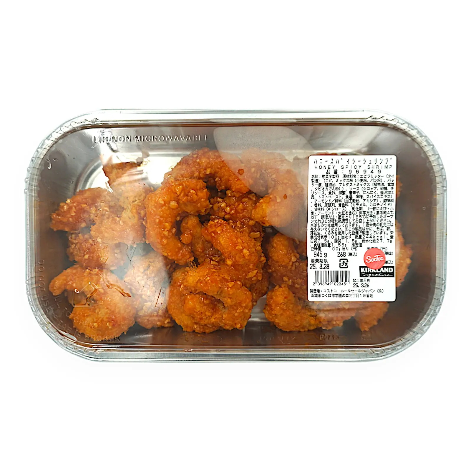 | 原材料名 | エビフリッター(タイ製造)(エビ、ミックス粉(小麦粉、パン粉)、バッター液、植物油、プレダストミックス(植物油、食塩、タピオカでん粉))、ソース(シロップ、砂糖、チリソース、食酢、蜂蜜、唐辛子、にんにく、醤油加工品、トマトペースト、食塩、味噌、スパイスエキス)、アーモンド/粘料(加工澱粉、アカシア)、酸味料、香料、膨張剤、着色料(カラメル、カロチノイド)、甘味料(キシロース)、乳化剤、(一部にえび・小麦・アーモンド・大豆を含む) |