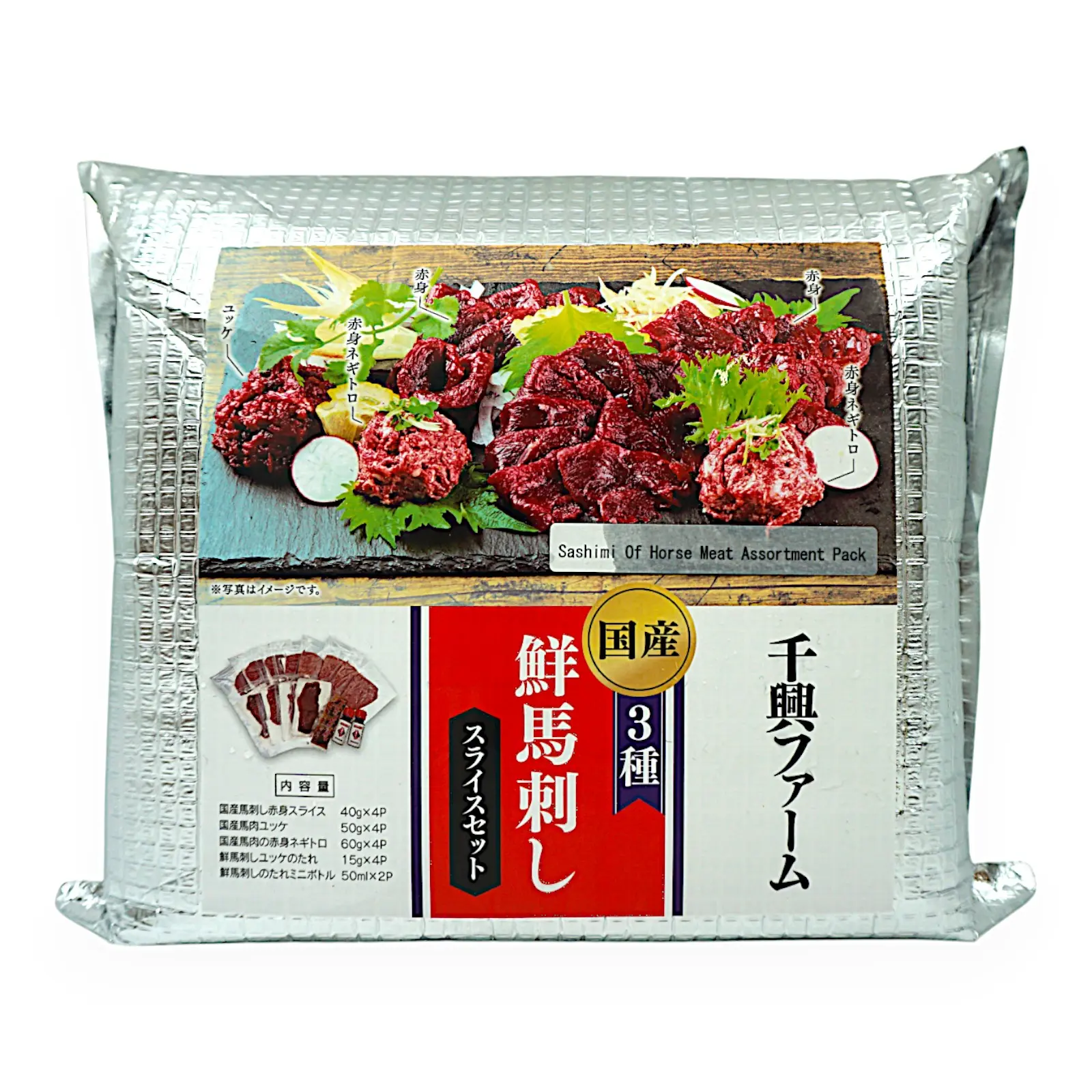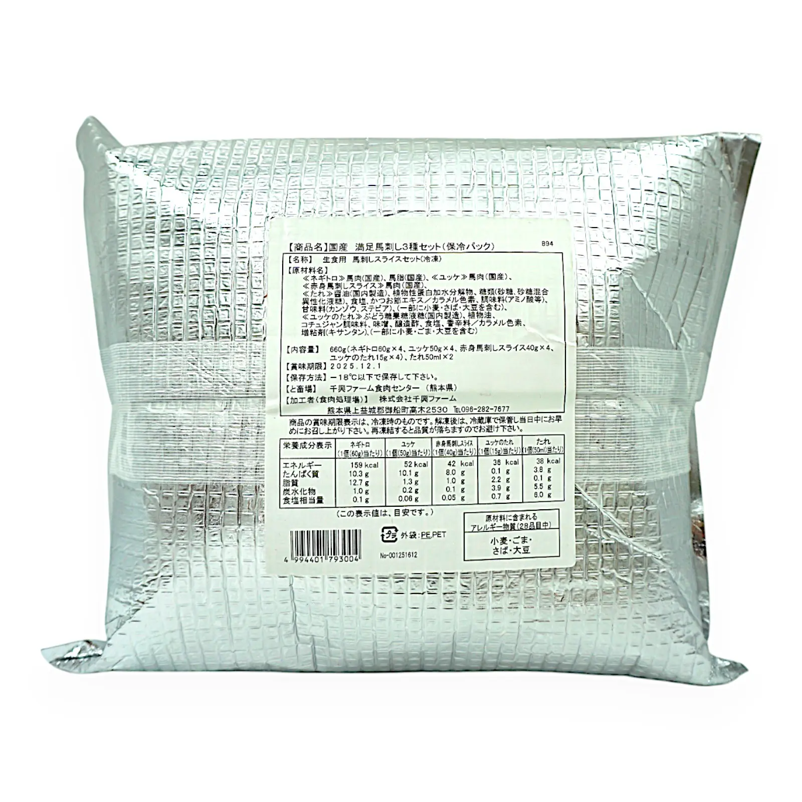 | 原材料名 | <ネギトロ>馬肉(国産)、馬油(国産)、<ユッケ>馬肉(国産)、<赤身馬刺しスライス>馬肉(国産)、 <たれ>醤油(国内製造)、植物性蛋白加水分解物、糖類(砂糖、砂糖合異性化液糖)、食塩、かつお節エキス/カラメル色素、調味料(アミノ酸等)、甘味料(カンゾウ、ステビア)、(一部に小麦・さば・大豆を含む)、<ユッケのたれ>ぶどう糖果糖液糖(国内製造)、植物油、コチュジャン調味料、味噌、醸造酢、食塩、香辛料/カラメル色素、増粘剤(キサンタン)、(一部に小麦・ごま・大豆を含む) |