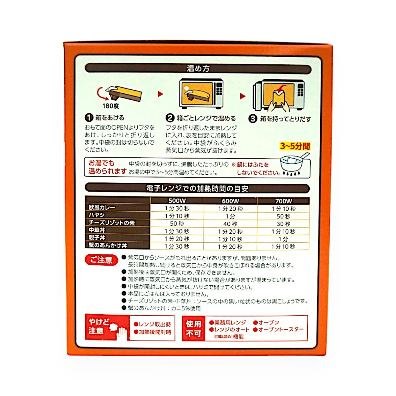 | 原材料名 | 【欧風カレー】りんごパルプ(国内製造)、ソテーオニオン、小麦粉、牛肉、砂糖、食用油脂、チャツネ、カレー粉、ビーフエキス調味料、食塩、トマトペースト、濃縮乳、クリーミングパウダー、フォンドヴォー、おろししょうが、おろしにんにく、赤ワイン、香辛料、酵母エキス/増粘剤(加エデンプン)、調味料(アミノ酸等)、カラメル色素、酸味料、香料、リンゴ抽出物、(一部に小麦・乳成分・牛肉・ごま・大豆・鶏肉・豚肉・りんごを含む) 【ハヤシ】たまねぎ(国産)、マッシュルーム、牛肉、小麦粉、砂糖、豚脂、トマトペースト、デミグラス風ソース、トマトケチャップ、ウスターソース、食塩、赤ワイン、ビーフエキス調味料、チャツネ、デミグラスソース、酵母エキス/増粘剤(加工デンプン)、調味料(アミノ酸等)、カラメル色素、パプリカ色素、酸味料、リンゴ抽出物、香料、(一部に小麦・乳成分・牛肉・大豆・鶏肉・バナナ・豚肉・りんご・ゼラチンを含む) 【チーズリゾットの素】ソテーオニオン(たまねぎ(国産))、マッシュルーム、豚脂、ナチュラルチーズ、小麦粉、チーズフード、肉エキス(ポーク、チキン)、砂糖、クリーム、食塩、白ワイン、トリュフオイル(米油、トリュフ)、チキンブイヨン、野菜エキス、おろしにんにく、クリーミングパウダー、黒こしょう/増粘剤(加エデンプン)、調味料(アミノ酸等)、セルロース、乳化剤、リンゴ抽出物、香料、(一部に小麦・乳成分・鶏肉・豚肉・りんごを含む) 【中華丼】野菜(たまねぎ(国産)、白菜、たけのこ、にんじん)、豚脂、きくらげ、肉エキス(ポーク、チキン)、砂糖、鶏肉、食塩、ごま油、チキンブイヨン、香味油、おろししょうが、穀物酢、ホタテエキス、カキエキス、白こしょう、フライドガーリック、黒こしょう/増粘剤(加エデンプン)、調味料(アミノ酸等)、リンゴ抽出物、(一部に小麦・ごま・大豆・鶏肉・豚肉・りんごを含む) 【親子丼】野菜(たまねぎ(国産)、にんじん)、卵白、鶏肉、卵黄、でんぷん、しょうゆ、砂糖、なたね油、チキンプイヨン、粉末かつおだし、かつお風味エキス、チキンエキス、こんぶエキス、かつおぶし粉末、本みりん、粉末卵白、食塩/調味料(アミノ酸等)、増粘剤(加工デンプン)、pH調整剤、リンゴ抽出物、カロチン色素、(一部に小麦・卵・大豆・鶏肉・りんごを含む) 【蟹のあんかけ丼】凍結卵白(国内製造)、山せり、ポークエキス(ポークエキス、動物油脂、還元水飴、食塩、野菜エキス)、でんぷん、かに、豚脂、砂糖、香味油、チキンエキス調味料、ごま油、チキンブイヨン、おろししょうが、白だしつゆ、粉末卵白、食塩、白こしょう/増粘剤(加工デンプン)、調味料(アミノ酸等)、pH調整剤、乳酸Ca、リンゴ抽出物、(一部にかに・小麦・卵・ごま・大豆・鶏肉・豚肉・りんごを含む) |