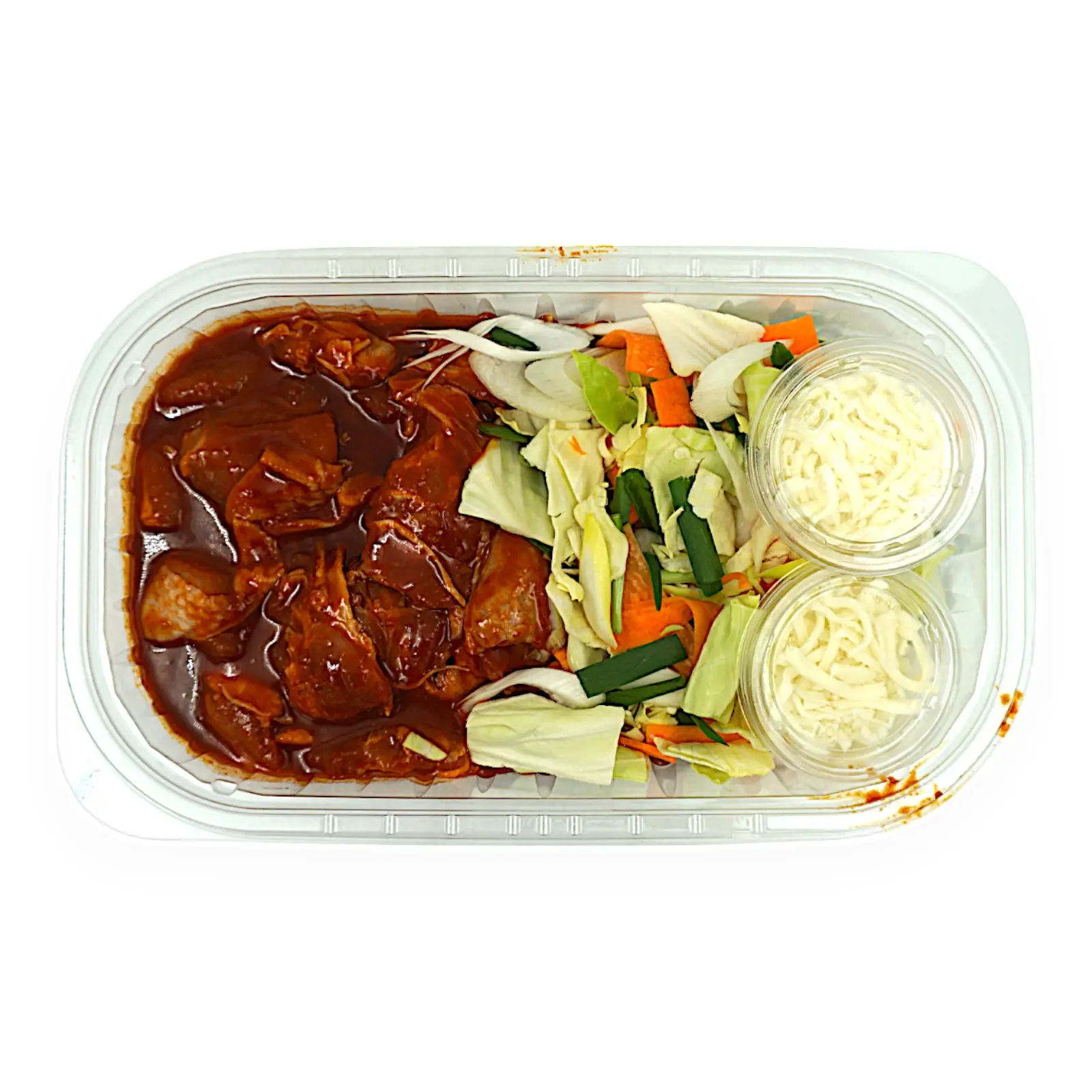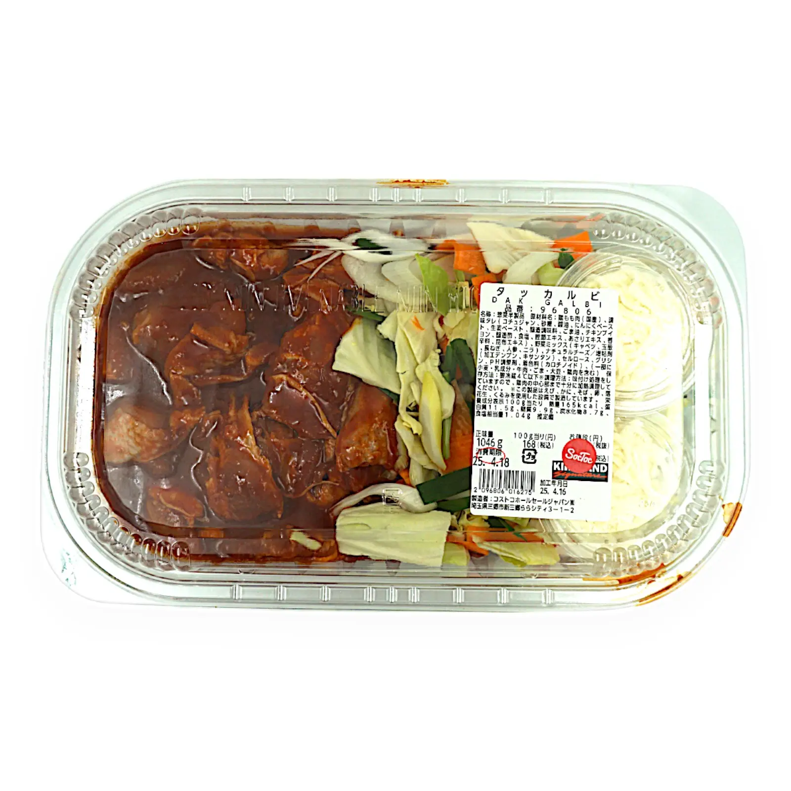 | 原材料名 | 鶏もも肉(国産)、調味タレ(コチュジャン、砂糖、醤油、にんにくペースト、生姜ペースト、醸造調味料、ごま油、チキンブイヨン、醸造酢、食塩、鰹節エキス、あさりエキス、香辛料、昆布エキス)、野菜ミックス (キャベツ、玉葱、長ねぎ、人参、ニラ)、ナチュラルチーズ/増粘剤(加エデンプン、キサンタン)、セルロース、グリシン、pH調整剤、着色料(カロチノイド)、(一部に小麦・乳成分・牛肉・ごま・大豆・鶏肉を含む) |