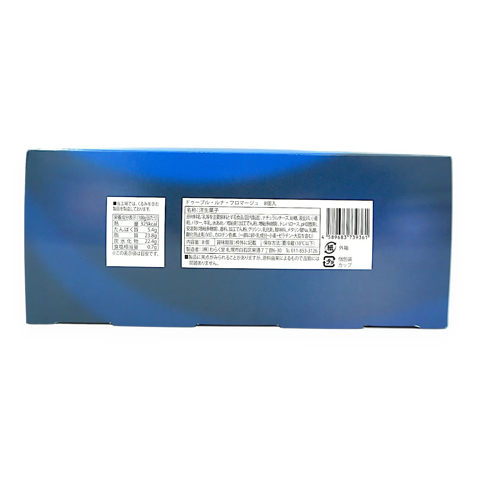 | 原材料名 | 乳等を主要原料とする食品(国内製造)、ナチュラルチーズ、砂糖、液全卵、小麦粉、バター、牛乳、水あめ/増粘剤(加工でん粉、増粘多糖類)、トレハロース、pH調整剤、安定剤(増粘多糖類、香料、加工でん粉、グリシン、乳化割、酸味料、メタリン酸Na、乳酸、酸化防止剤(V.E)、カロチン色素、(一部に卵・乳成分・小麦・ゼラチン・大豆を含む) |