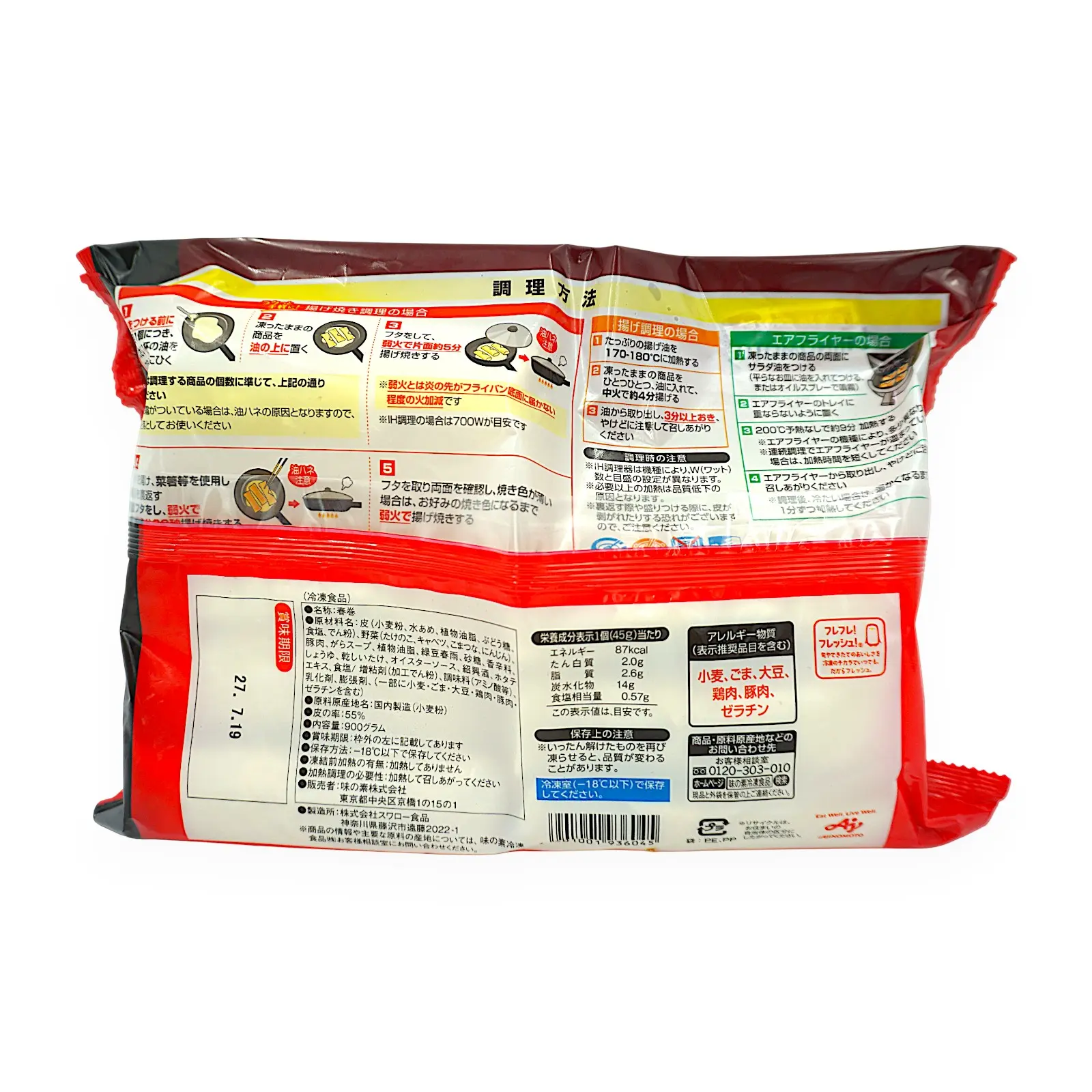 | 原材料名 | 皮(小麦粉、水あめ、植物油脂、ぶどう糖、食塩、でん粉)、野菜(たけのこ、キャベツ、こまつな、にんじん)豚肉、がらスープ、植物油脂、緑豆春雨、砂糖、香辛料、しょうゆ、乾しいたけ、オイスターソース、紹興酒、ホタテエキス、食塩/増粘剤(加工でん粉)、調味料(アミノ酸等)、乳化部、膨張、(一部に小麦・ごま・大豆・鶏肉・豚肉・ゼラチンを含む) |