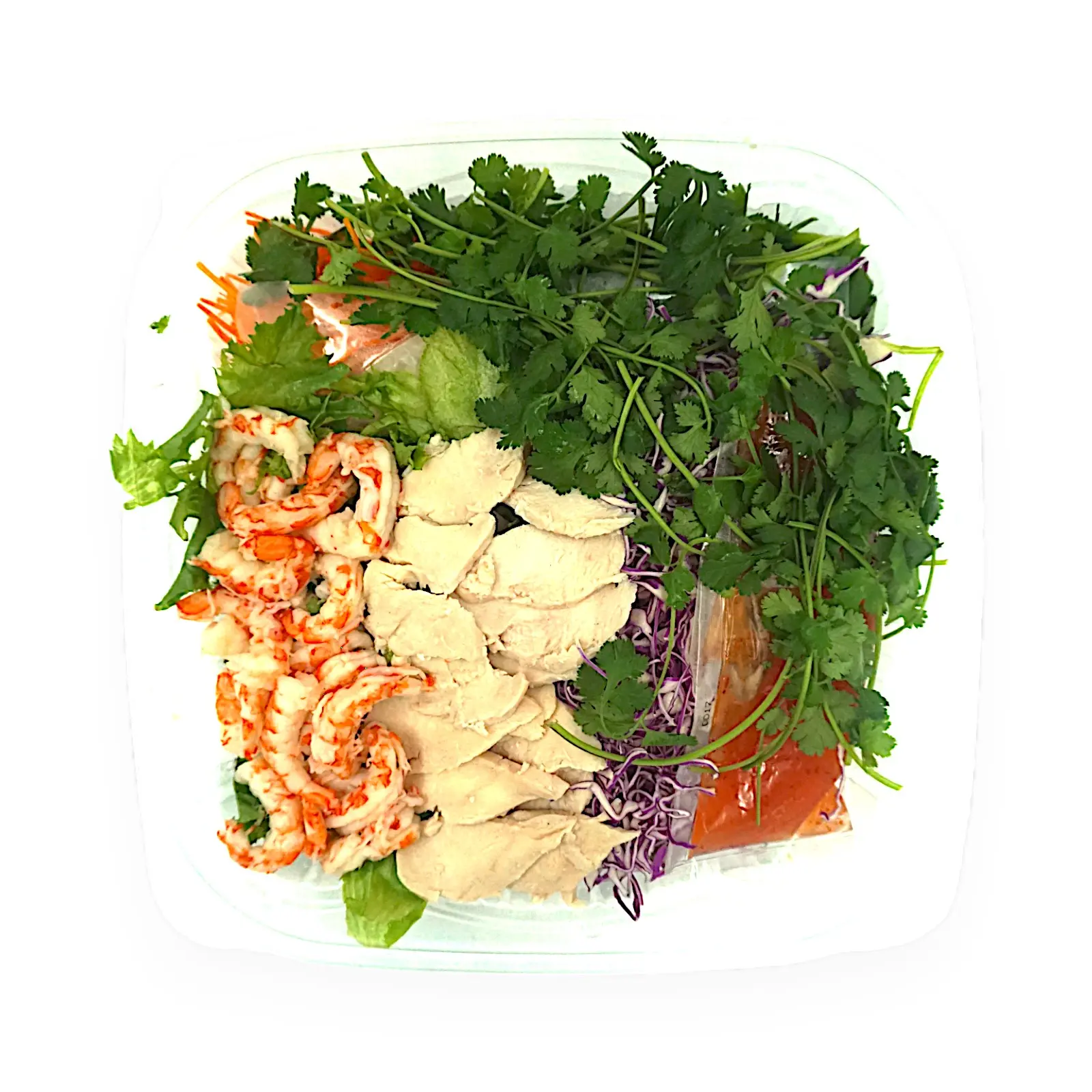 ボイルえび(ベトナム製造)、蒸し鶏(国内製造)、スイートチリソース(果糖ぶとう糖液糖、砂糖、醸造酢、食塩、ガーリックペースト、魚醤パウダー、唐辛子)、紫キャベツ、ニンジン、万能ねぎ、フリルレタス、ライスペーパー(タピオカでん粉、米、食塩)、パクチー/pH調整剤、調味料(無機塩)、増粘剤(キサンタン)、着色料(カロチノイド)、(一部にえび・大豆・鶏肉を含む)