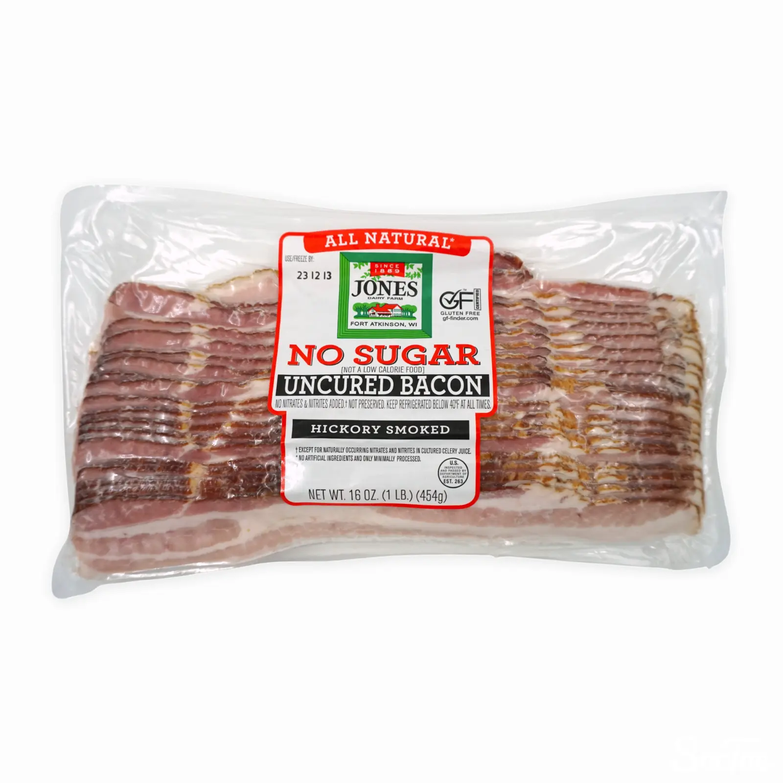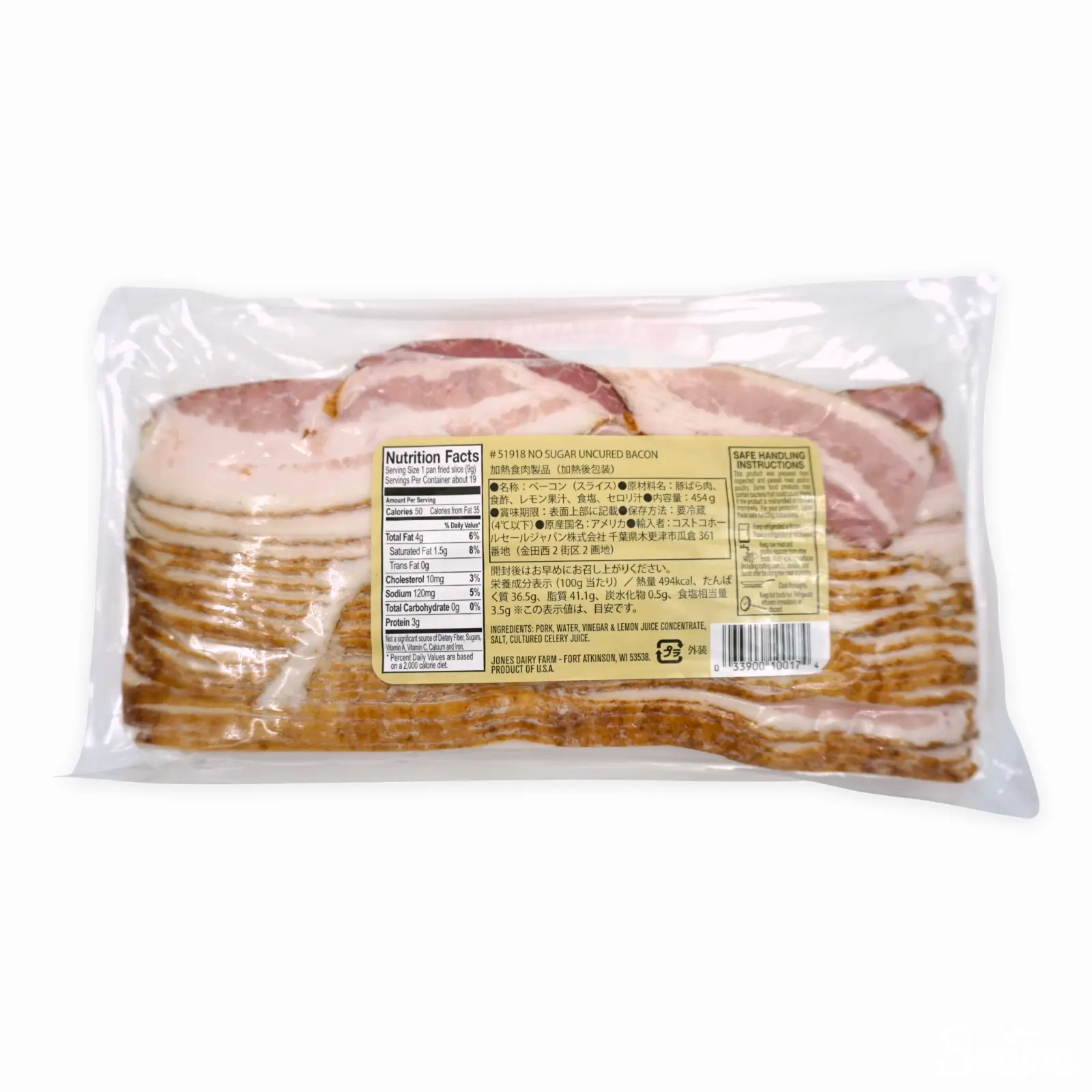 JONESより、砂糖を使わずヒッコリーのチップで燻したベーコン454g入りのパックです。ベーコンはスライス済みで、20枚ほど入っています。