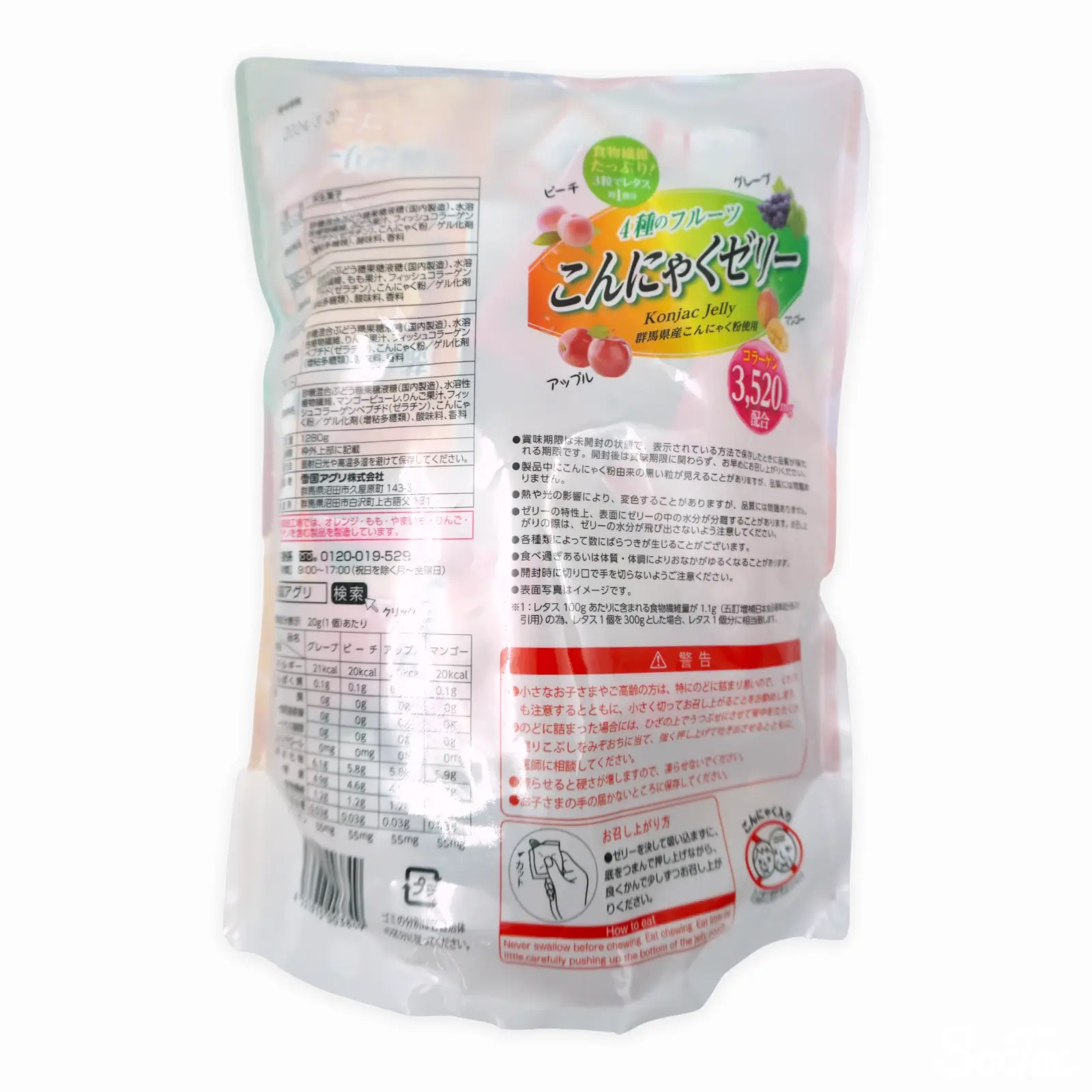 雪国アグリより、小さなパウチに入った一口タイプの蒟蒻ゼリーです。ピーチ、グレープ、アップル、マンゴーの4フレーバーのゼリーがおよそ64個、1280g分入っています。食物繊維、コラーゲンが豊富に含まれています。