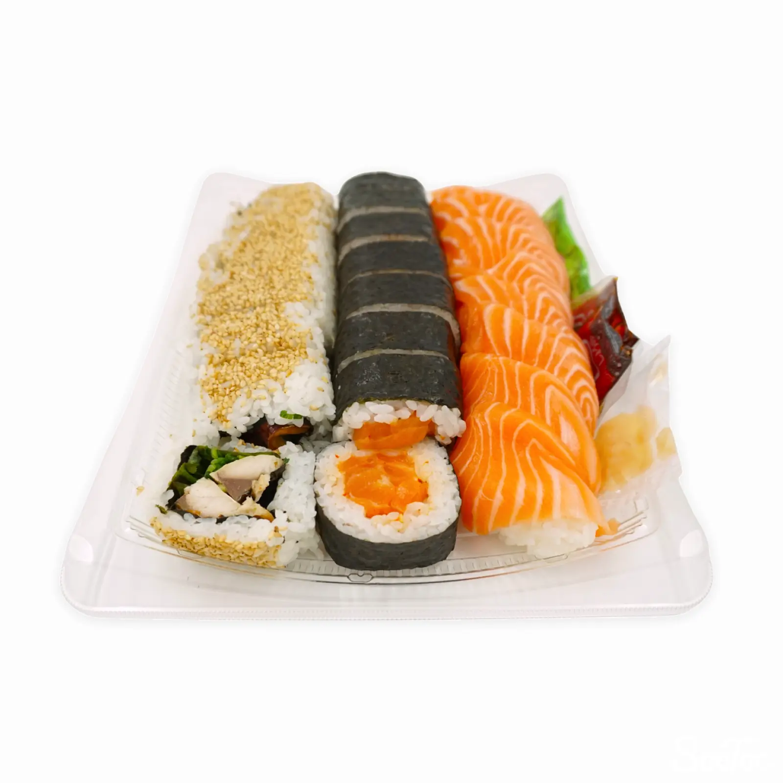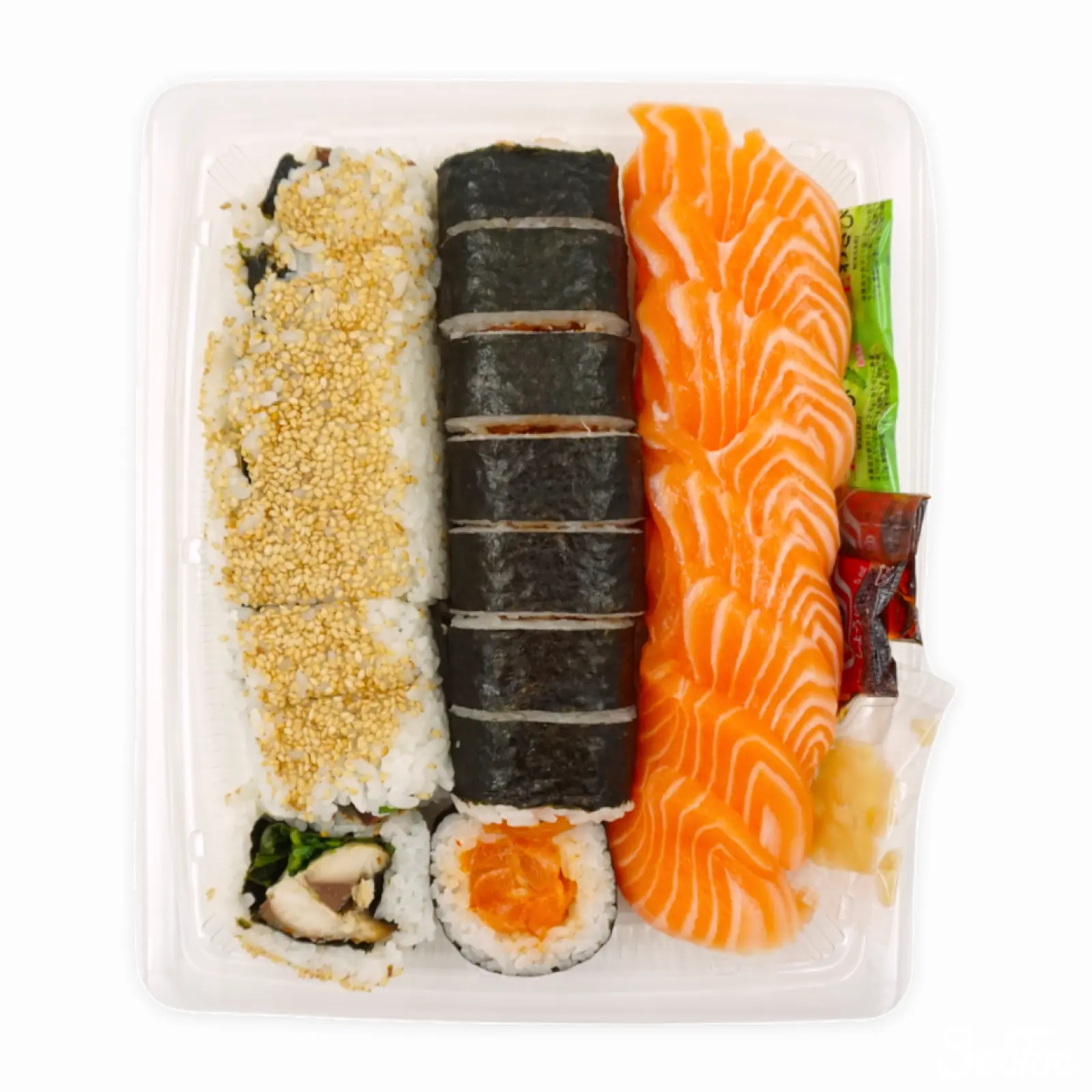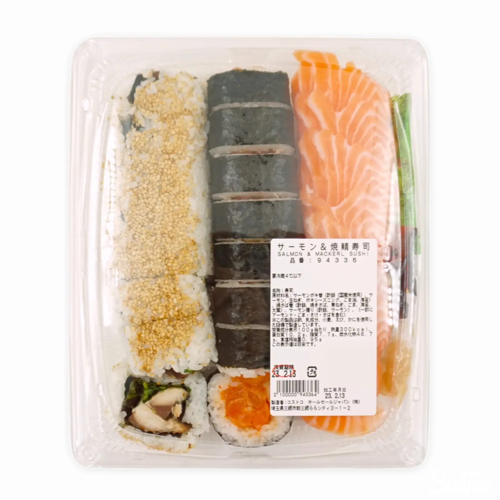 デリカコーナーにある寿司メニューの一つで、辛口のポキロール、焼きサバロール、サーモンの握りをそれぞれ8つずつ詰めたセットになります。ポキはピリ辛程度の辛さになっています。※本商品は消費期限が当日のため、午後の配送でのみお届けいたします。
