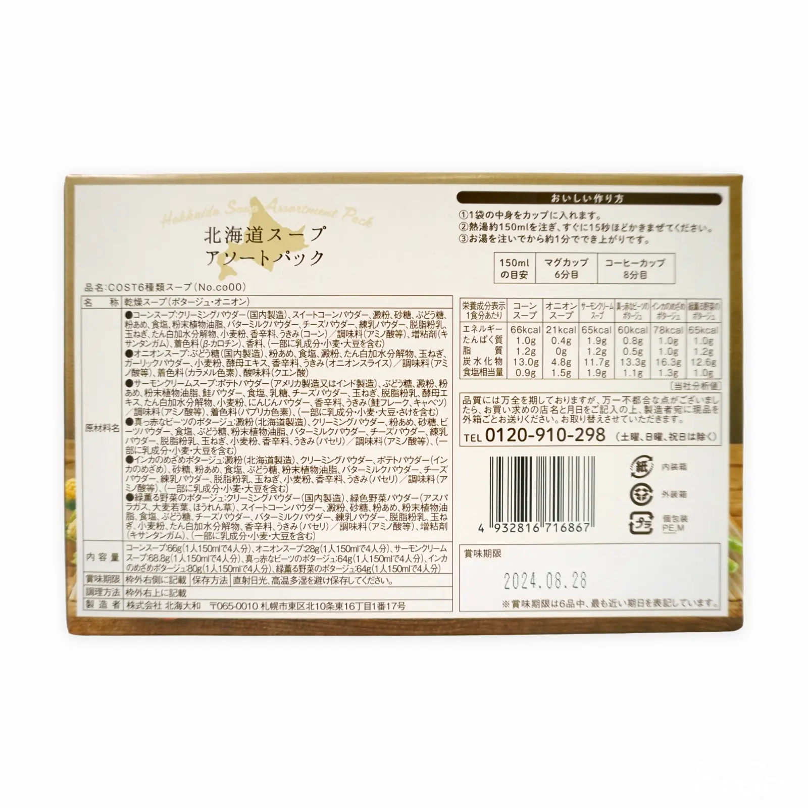 | 原材料名 | ●コーンスープ:クリーミングパウダー(国内製造)、スイートコーンパウダー、澱粉、砂糖、ぶどう糖、粉あめ、食塩、粉末植物油脂、バターミルクパウダー、チーズパウダー、練乳パウダー、脱脂粉乳、玉ねぎ、たん白加水分解物、小麦粉、香辛料、うきみ(コーン)/調味料(アミノ酸等)、増粘剤(サンタンガム)、着色料(β-カロチン)、香料、(一部に乳成分・小麦・大豆を含む) ●オニオンスープ:ぶどう糖(国内製造)、粉あめ、食塩、澱粉、たん白加水分解物、玉ねぎ、カーリックパウダー、小麦粉、酵母エキス、香辛料、うきみ(オニオンスライス)/調味料(アミノ酸等)、着色料(カラメル色素)、酸味料(クエン酸) ●サーモンクリームスープ:ポテトパウダー(アメリカ製造又はインド製造)、ぶどう糖、澱粉、粉あめ、粉末植物油脂、鮭パウダー、食塩、乳糖、チーズパウダー、玉ねぎ、脱脂粉乳、酵母エキス、たん自加水分解物、小麦粉、にんじんパウダー、香辛料、うきみ(鮭フレーク、キャベツ)/調味料(アミノ酸等)、着色料(パプリカ色素)、(一部に乳成分・小麦・大豆・さけを含む) ●真っ赤なビーツのポタージュ:澱粉(北海道製造)、クリーミングパウダー、粉あめ、砂糖、ビーツパウダー、食塩、ぶどう糖、粉末植物油脂、バターミルクパウダー、チーズパウダー、練乳パウダー、脱脂粉乳、玉ねぎ、小麦粉、香辛料、うきみ(パセリ)/調味料(アミノ酸等)、(一部に乳成分・小麦・大豆・を含む) ●インカのめぎめポタージュ:澱粉(北海道製造)、クリーミングパウダー、ポテトパウダー(インカのめざめ)砂糖、粉あめ、食塩、ぶどう糖、粉末植物油脂、バターミルクパウダー、チーズパウダー、練乳パウダー、脱脂粉乳、玉ねぎ、小麦粉、香辛料、うきみ(パセリ)/調味料(アミノ酸等)、(一部に乳成分・小麦・大豆・を含む) ●緑薫る野菜のポタージュ:クリーミングパウダー(国内製造)、緑色野菜パウダー(アスパラガス、大麦若葉、ほうれん草)、スイートコーンパウダー、澱粉、砂糖、粉あめ、粉末植物油脂、食塩、ぶどう糖、チーズパウダー、バターミルクパウダー、練乳パウダー、脱脂粉乳、玉ねぎ、小麦粉、たん白加水分解物、香辛料、うきみ(パセリ)/調味料(アミノ酸等)、増粘剤(サンタンガム)、(一部に乳成分・小麦・大豆・を含む) |