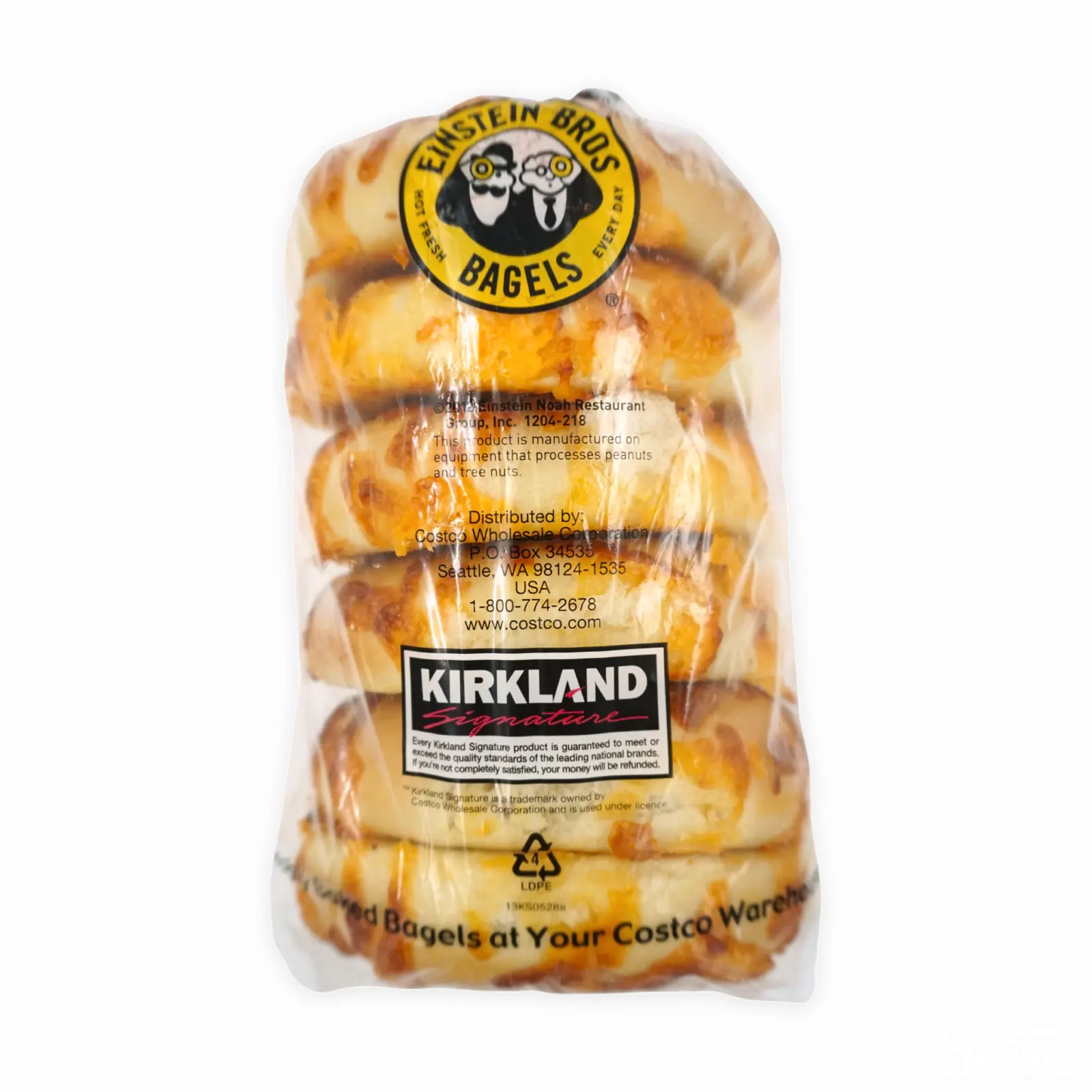 ベーグル(アメリカ製造)(小麦粉、砂糖、食塩、イースト、モルトパウダー、大麦麦芽粉、小麦グルテン)、ナチュラルチーズ、オリーブ油/セルロース、V.C、アナトー色素、(一部に小麦・乳成分を含む)