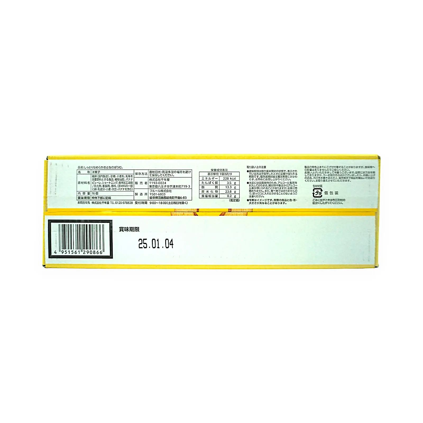鶏卵(国内製造)、砂糖、小麦粉、乳等を主要原料とする食品、植物油脂、バナナピューレ、ショートニング、食用加工油脂/乳化剤、膨張剤、香料、(原材料の一部に卵・乳成分・小麦・大豆・バナナを含む