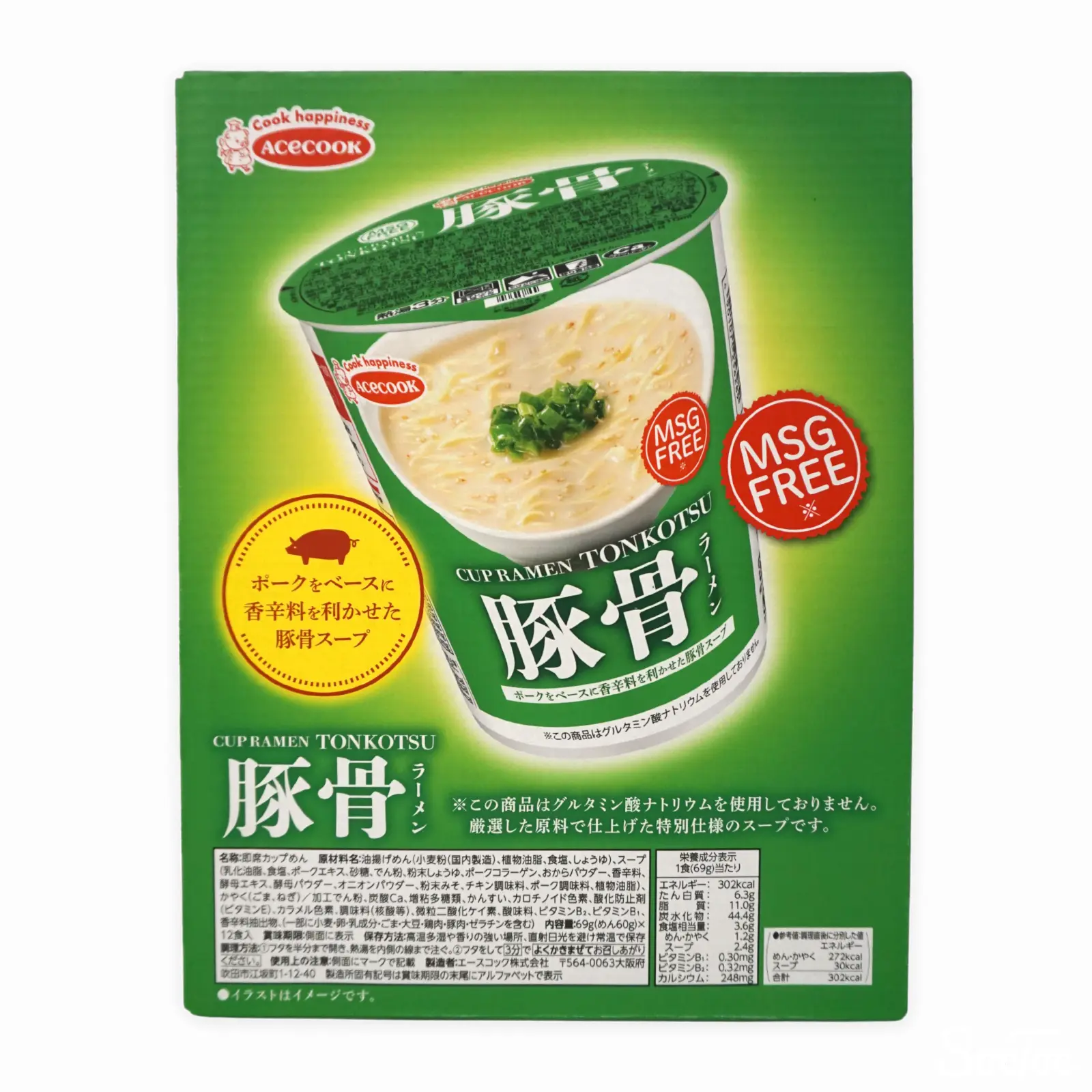 エースコック MSG FREE カップラーメン豚骨 化学調味料不使用 12p