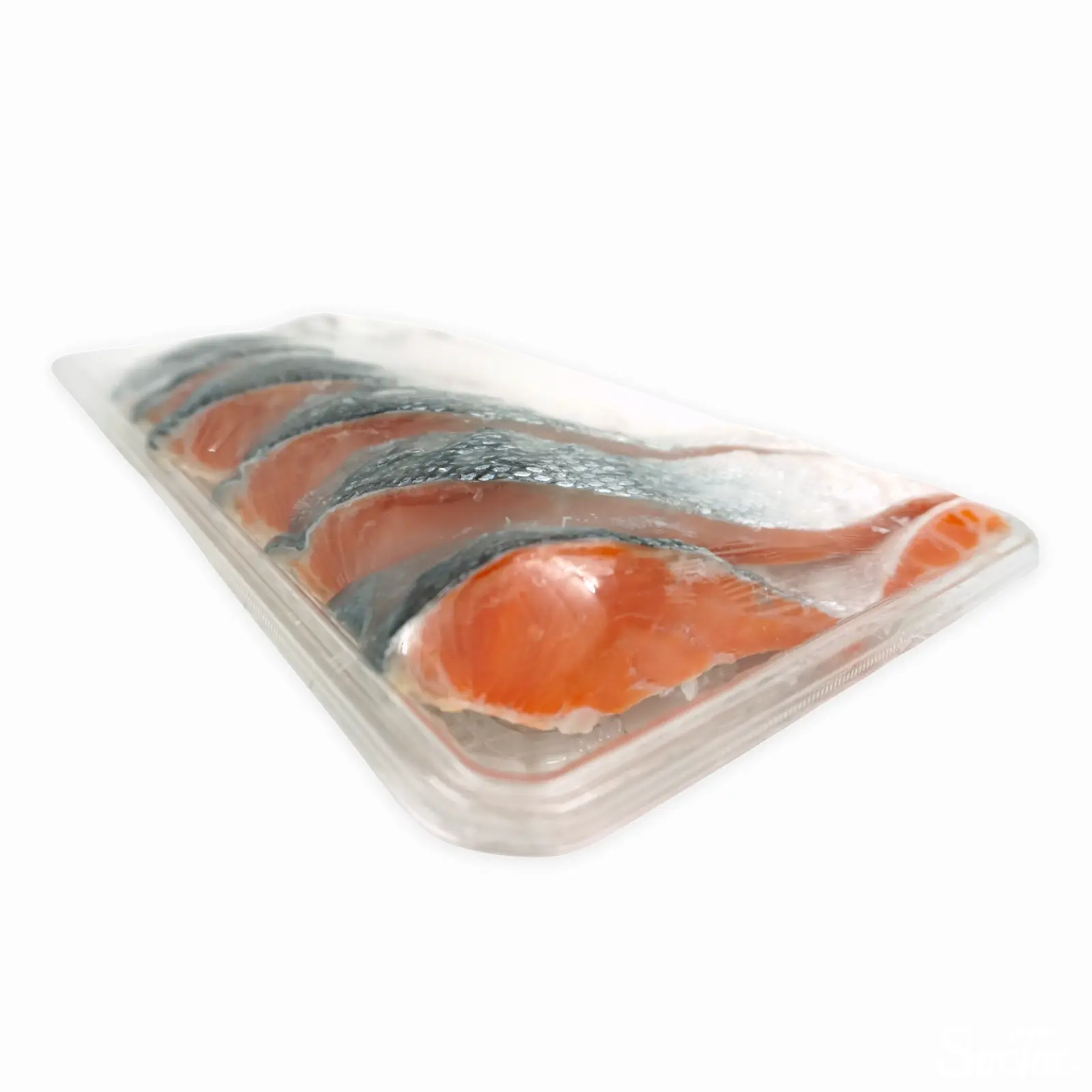 銀鮭9〜10枚の切り身が入ったパックです。大変肉厚に切られており、市販の鮭の切り身よりも分厚いものとなります。
