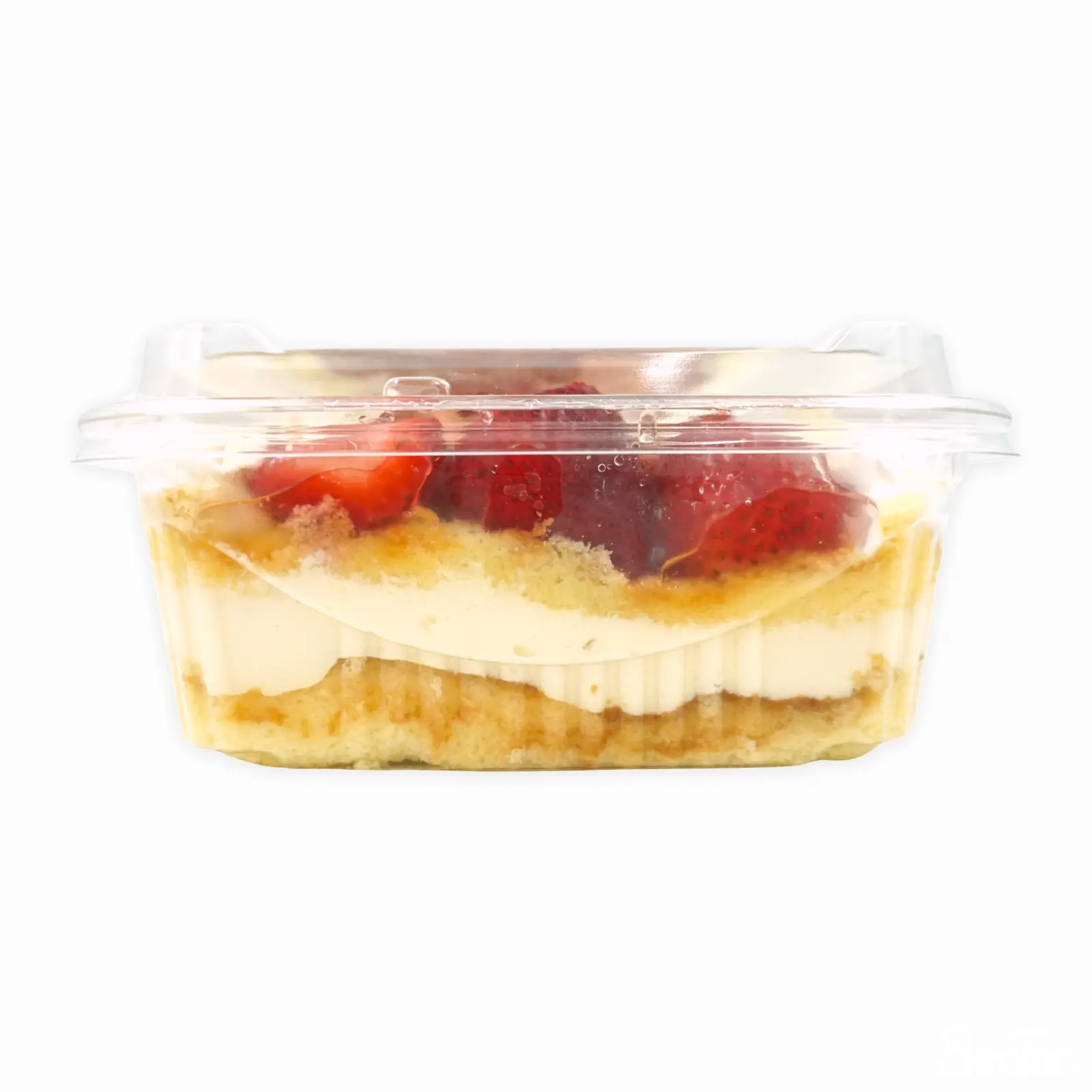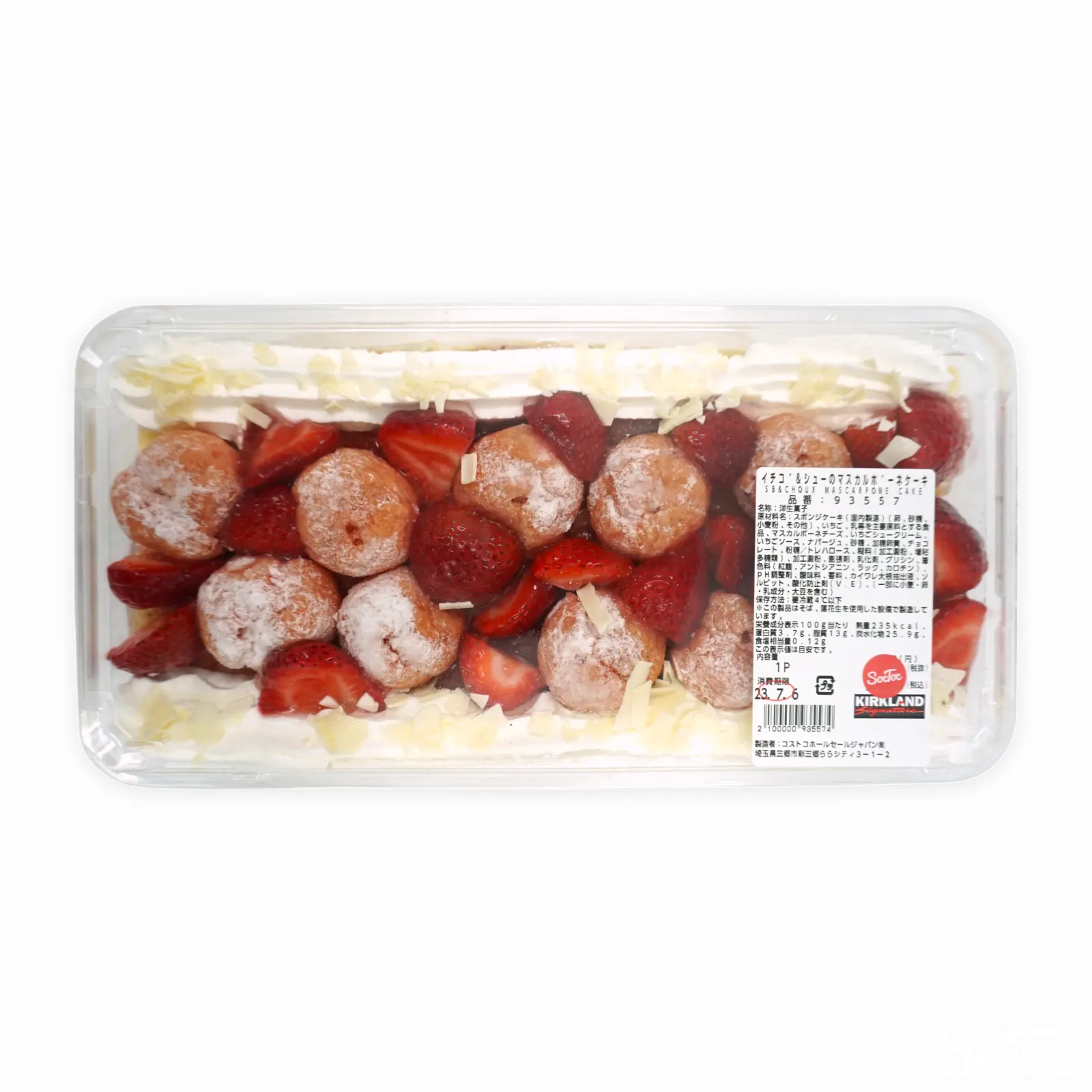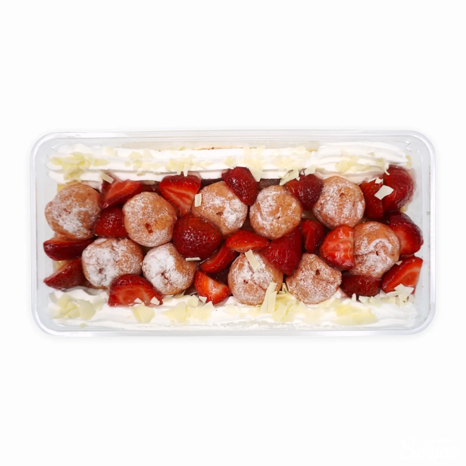 小さなシュークリームといちごがふんだんにトッピングされた、大判のストロベリーケーキです。スポンジの間にはマスカルポーネクリームが挟まれており、やや甘さ控えめの仕上がりです。
