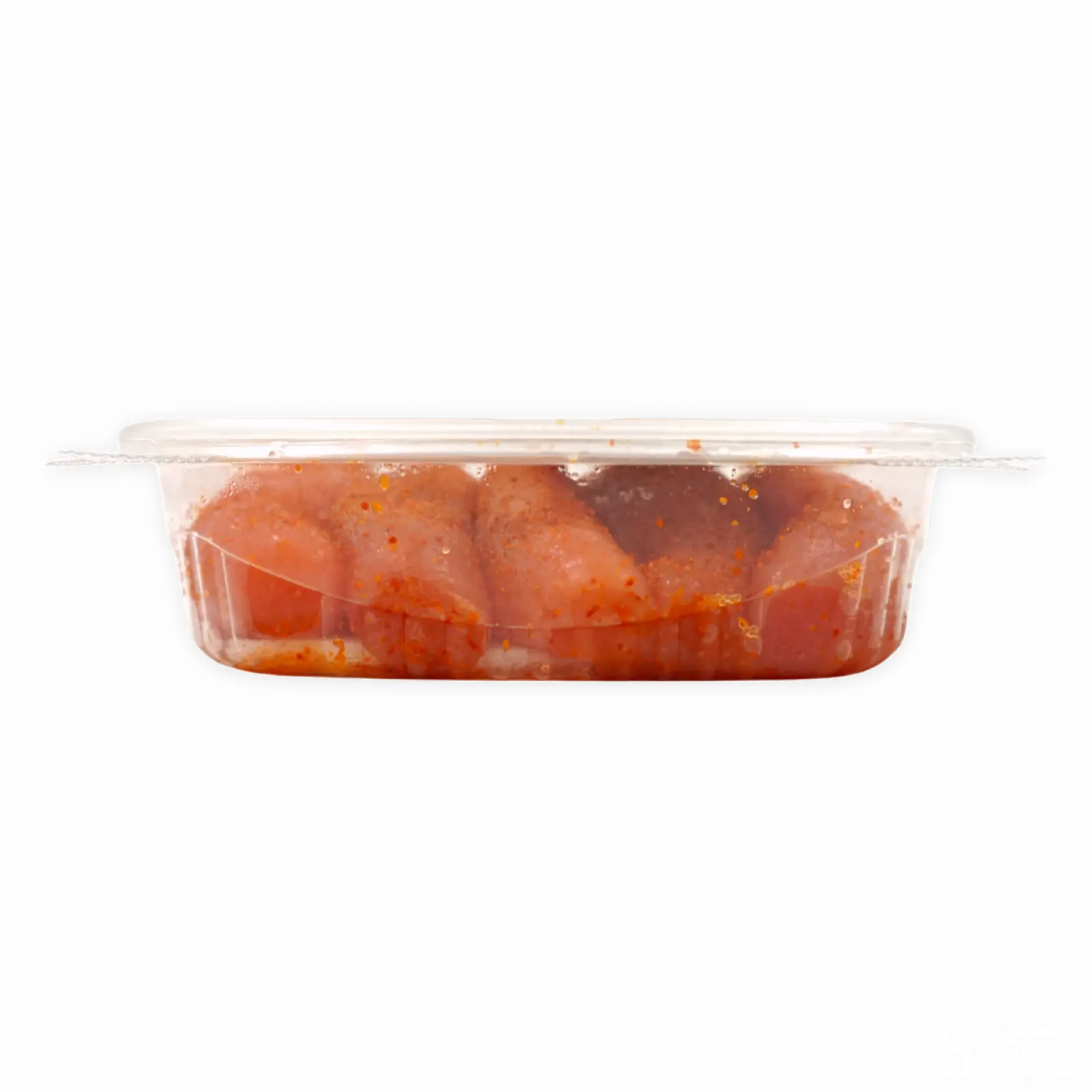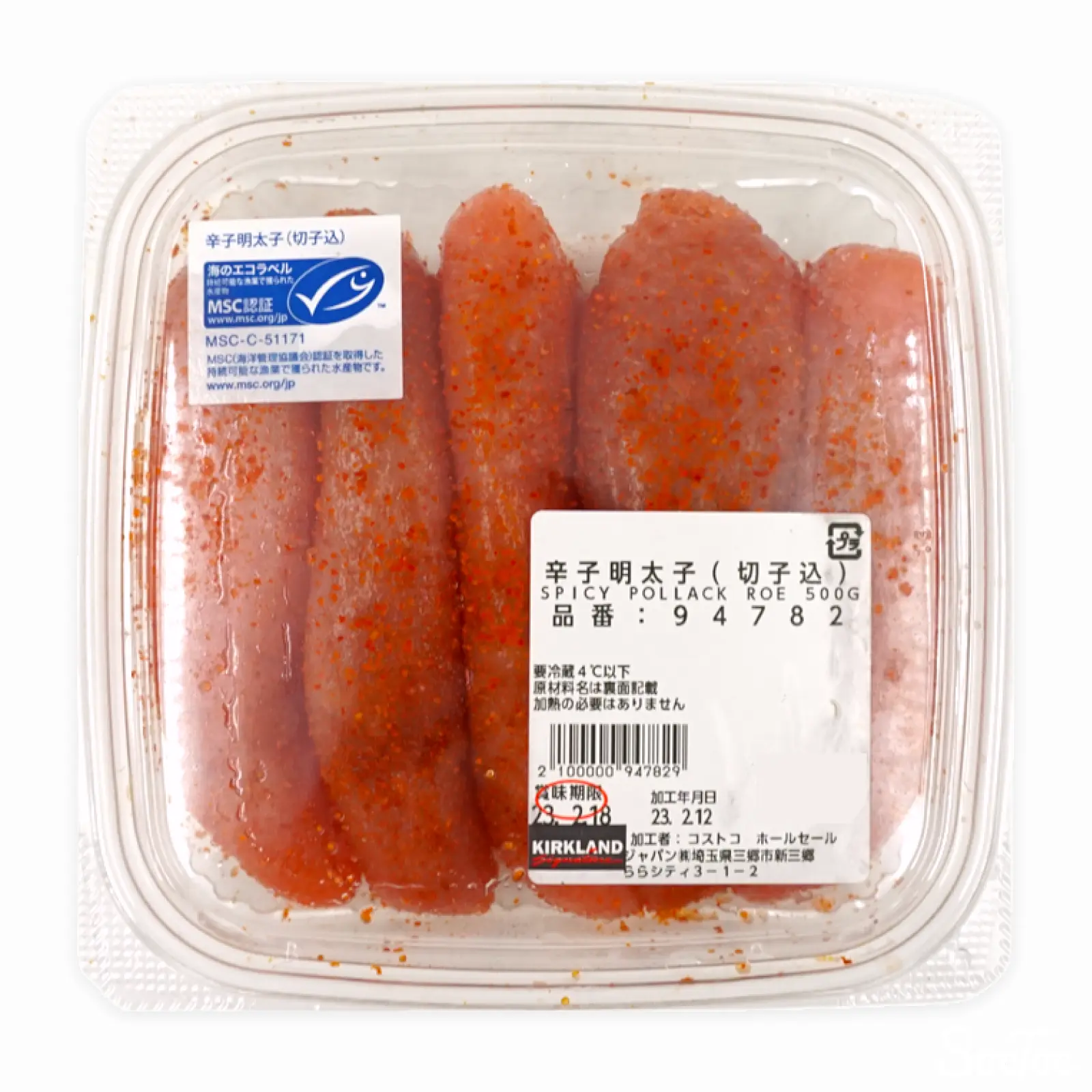 辛子明太子500gのパックです。太さが異なるため入っている本数にもばらつきがあります。冷凍されたものが店頭で解凍されながら販売されている状態となります。