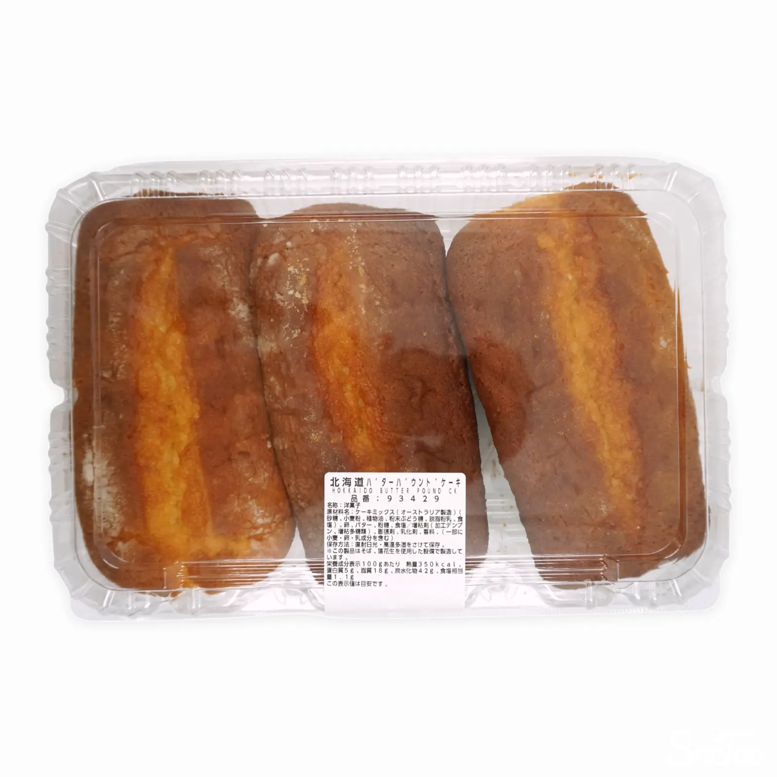 北海道バターを使用したパウンドケーキ3本のパックです。やや甘さ控えめでしっとりとしたケーキに仕上がっており、おやつや朝食にお召し上がりいただけます。
