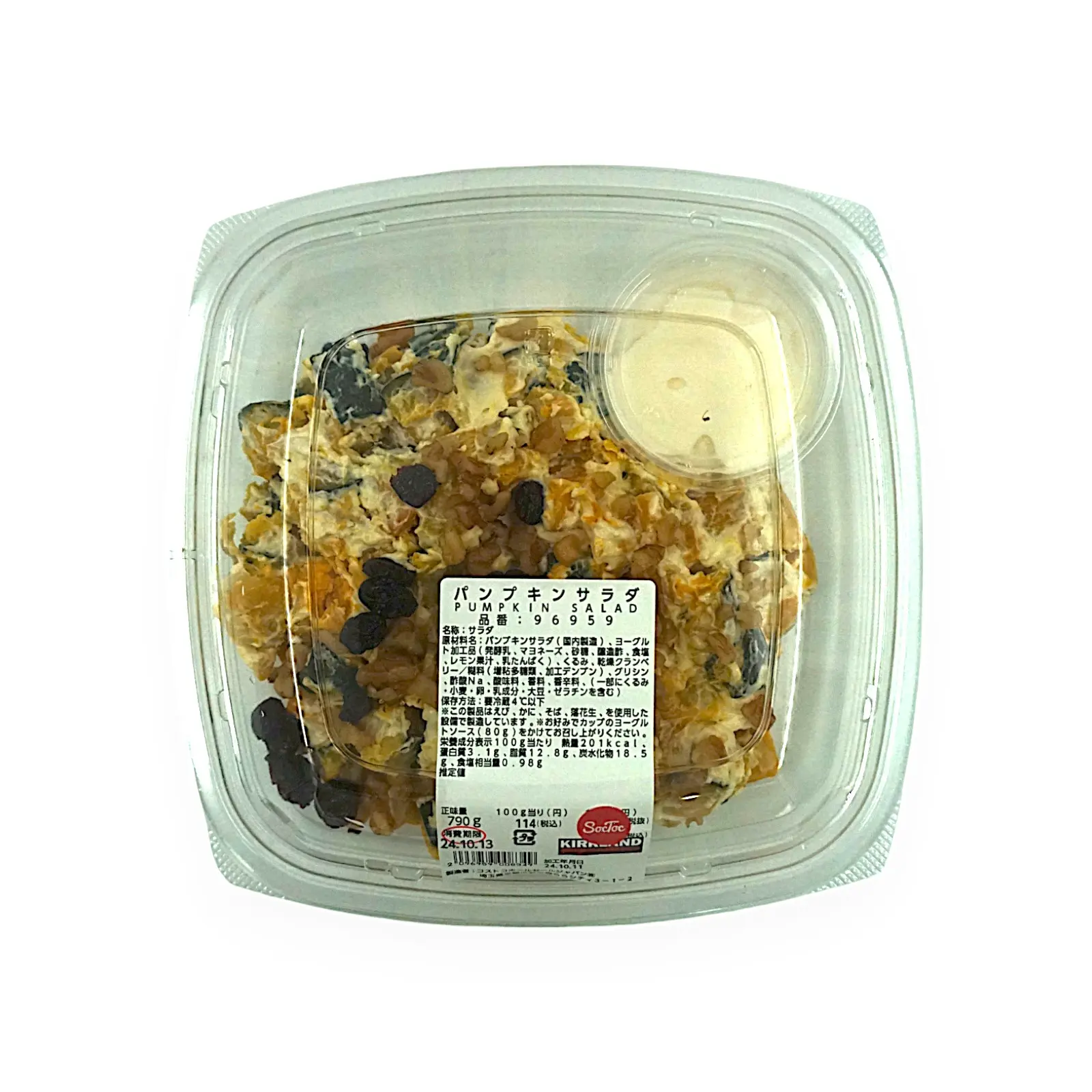 パンプキンサラダ(国内製造)、ヨーグルト加工品(発酵乳、マヨネーズ、砂糖、醸造酢、食塩、レモン果汁、乳たんぱく)、くるみ、乾燥クランベリー/粘料(増粘多糖類、、加工デンプン)グリシン、酢酸Na、酸味料、香料、香辛料、(一部にくるみ・小麦・卵・乳成分・大豆・ゼラチンを含む)
