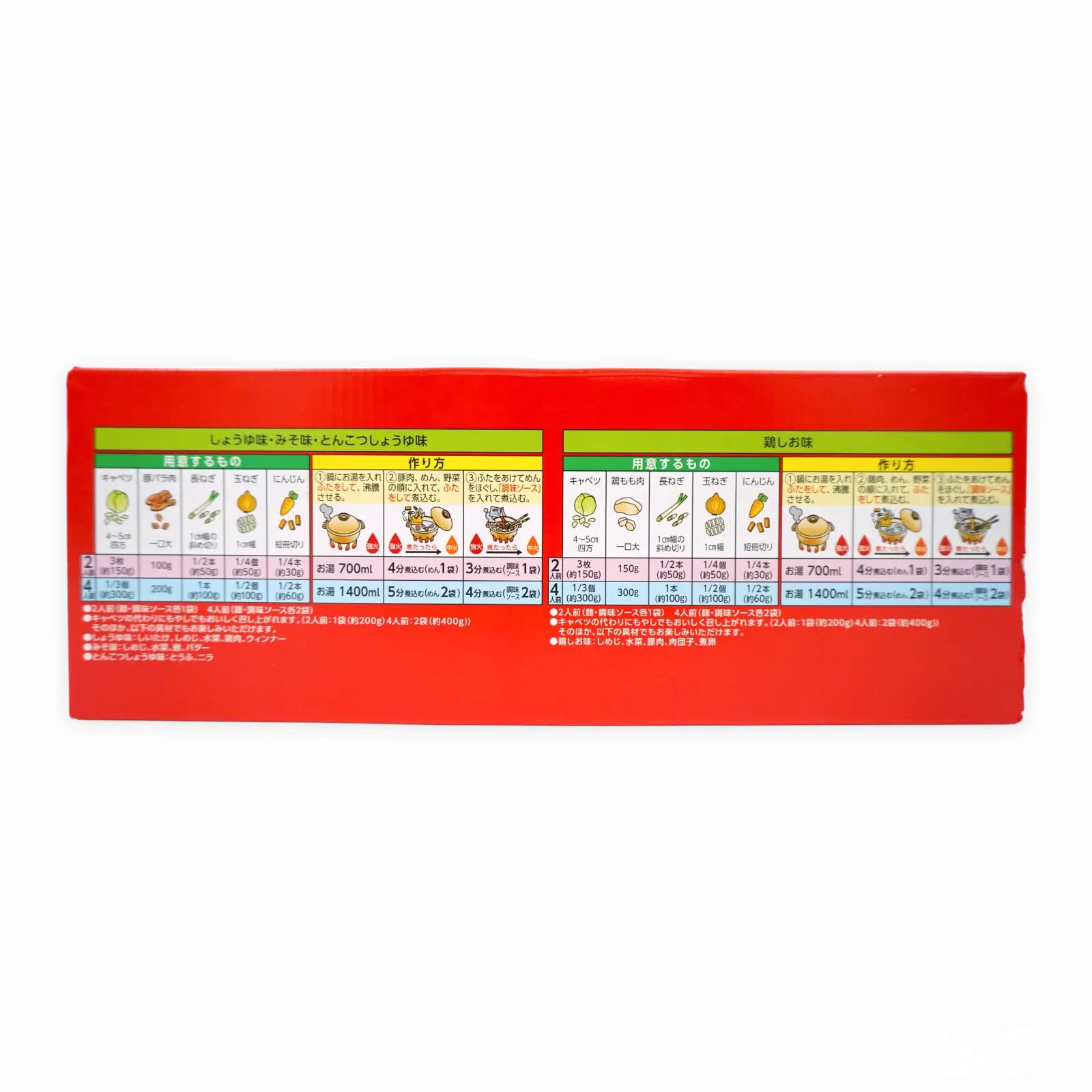 永谷園の煮込みラーメンです。醤油、鶏しお、みそ、とんこつしょうゆの4種類、2人前パックが2つずつで計16人前分入っています。たっぷりの野菜や卵などと一緒に煮込んでお召し上がりください。
