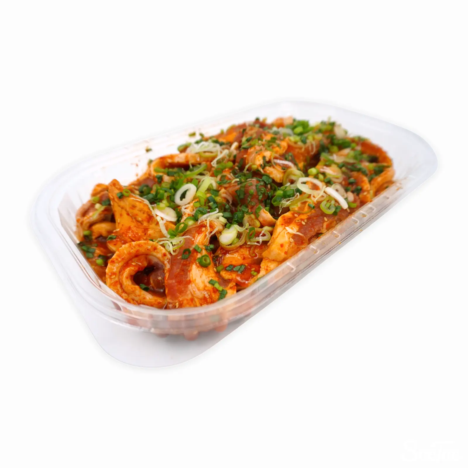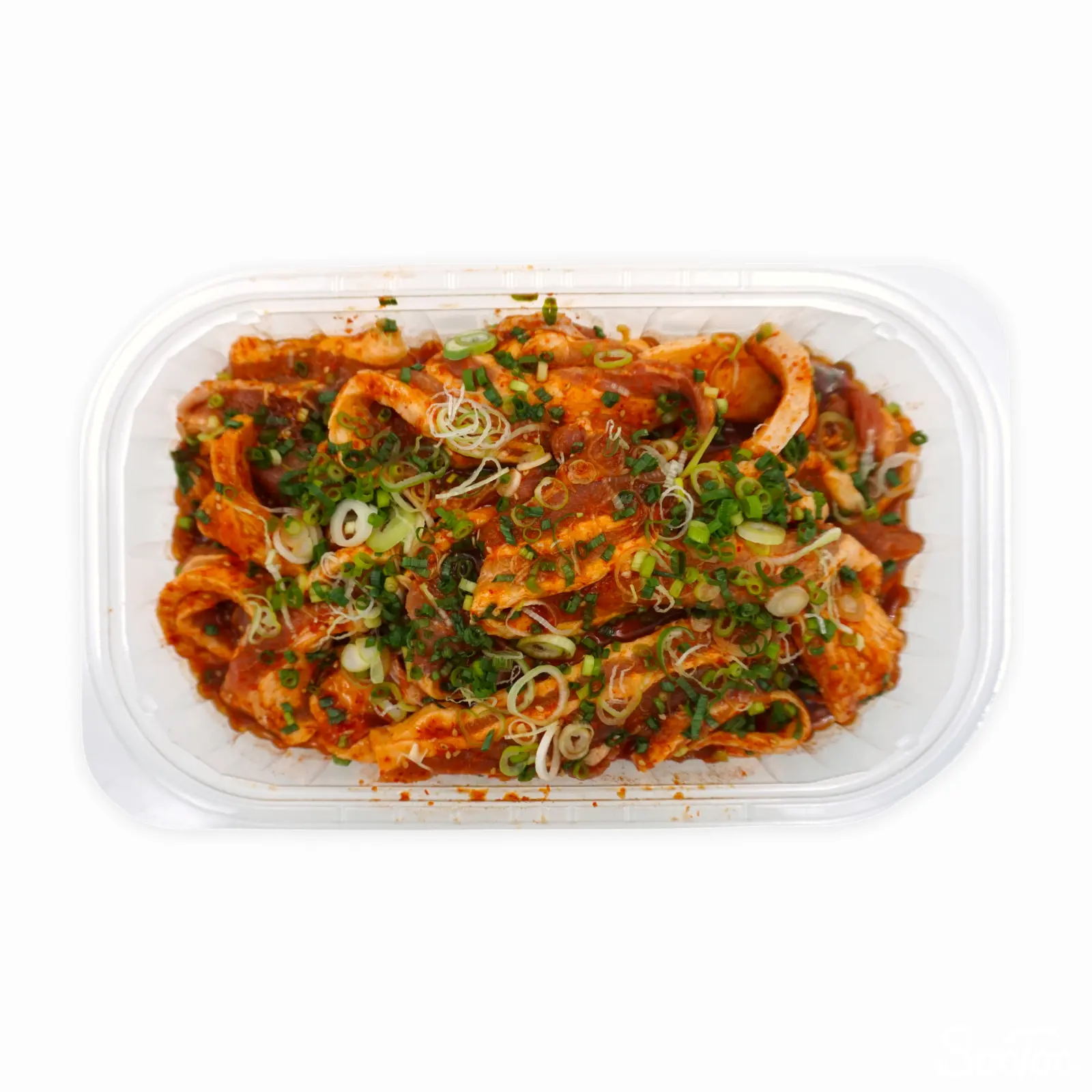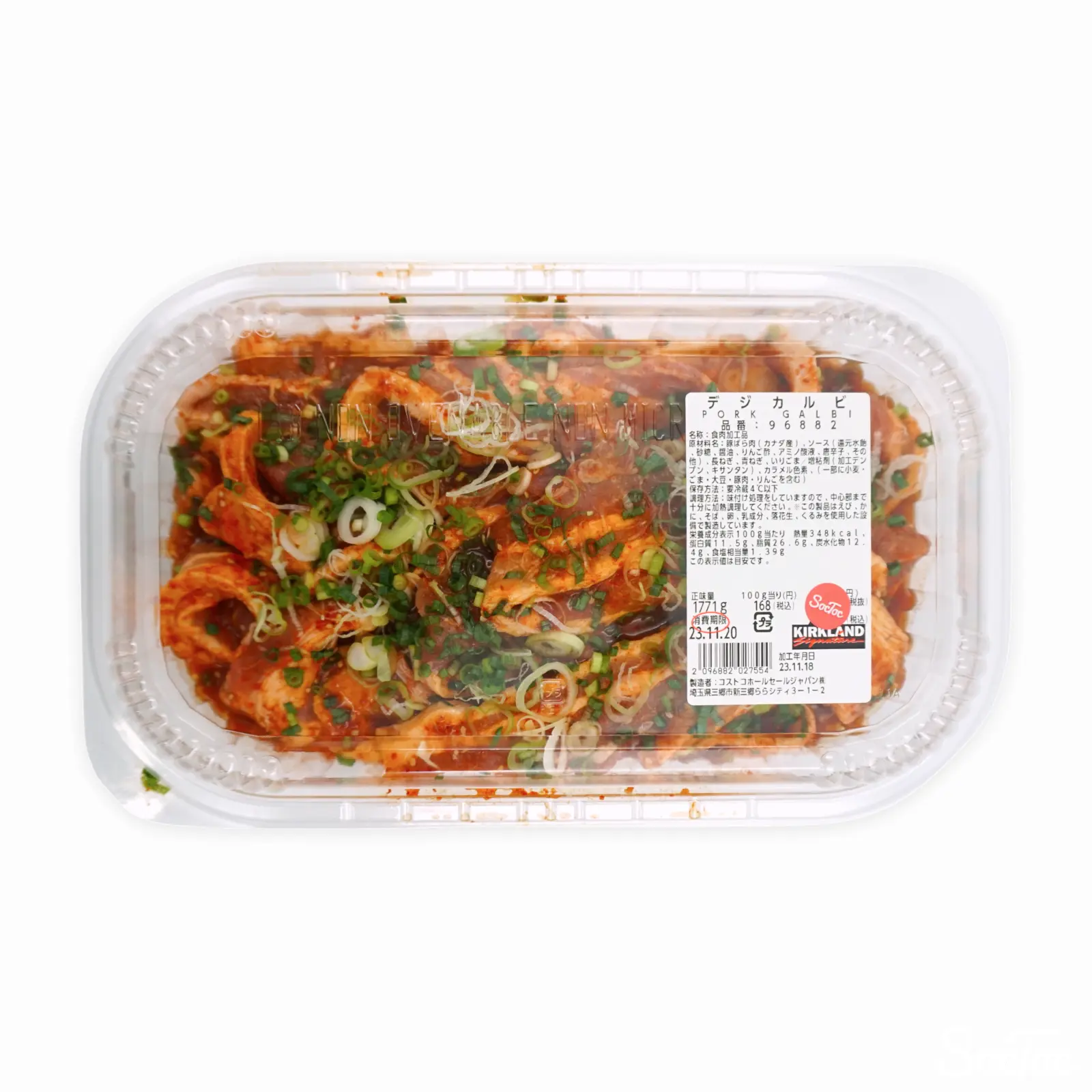 | 原材料名 | 豚ばら肉(カナダ産)、ソース(還元水飴、砂糖、醤油、りんご酢、アミノ酸液、唐辛子、 その他)、長ねぎ、青ねぎ、いりごま/増粘剤(加工デンプン、キサンタン)、カラメル色素、(一部に小麦・ ごま・大豆・豚肉・りんごを含む) ※この製品はえび、かに、そば、卵、乳成分、落花生、くるみを使用した設備で製造しています。 |
