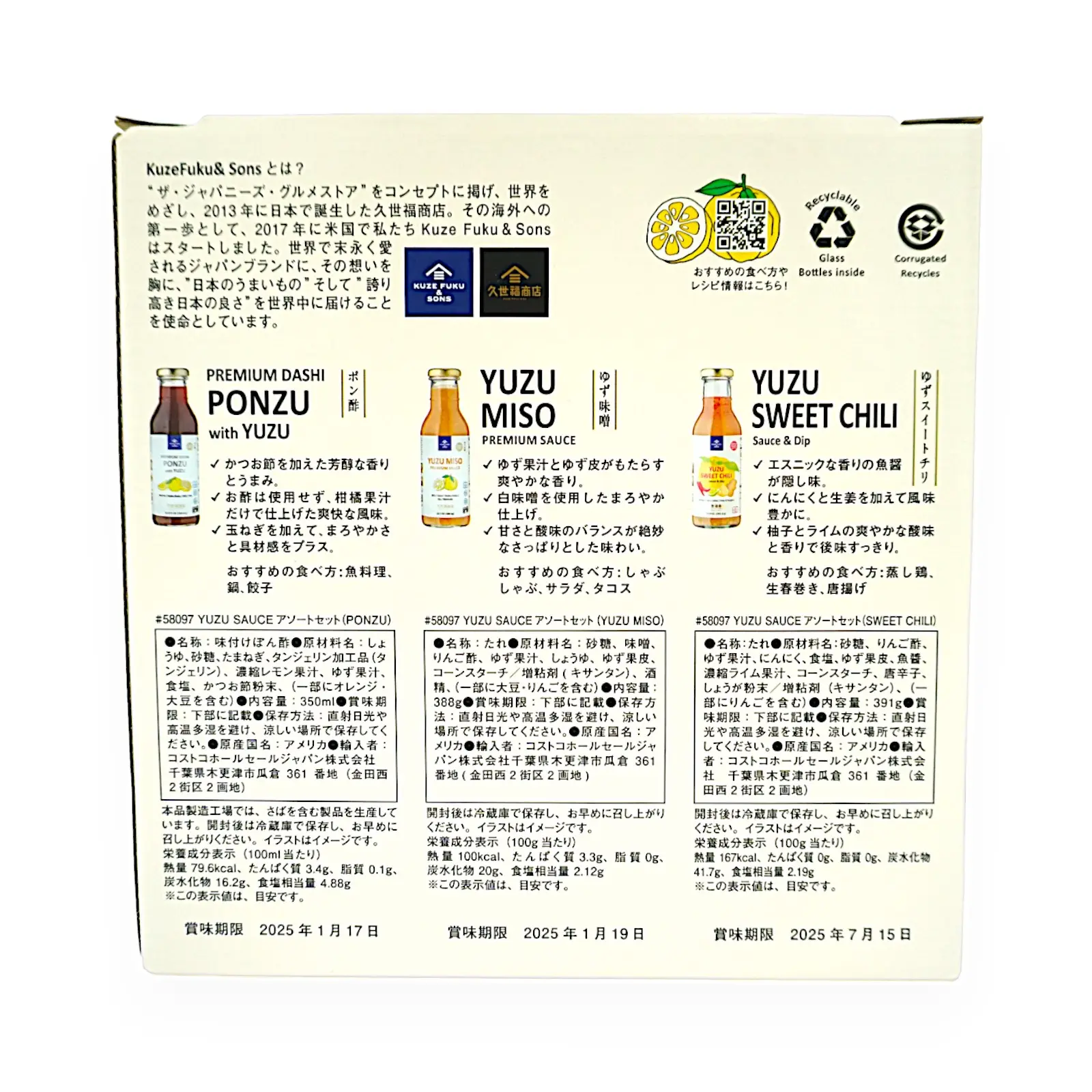 | 成分表示 | 【ポン酢】しょうゆ、砂糖、たまねぎ、タンジェリン加工品(タンジェリン)、濃縮レモン果汁、ゆず果汁、食塩、かつお節粉末、(一部にオレンジ・大豆を含む) 【味噌】砂糖、味噌、りんご酢、ゆず果汁、しょうゆ、ゆず果皮、コーンスターチ/増粘剤(キサンタン)、酒精、(一部に大豆・りんごを含む) 【スイートチリ】砂糖、りんご酢、ゆず果汁、にんにく、食塩、ゆず果皮、魚醬、濃縮ライム果汁、コーンスターチ、唐辛子、しょうが粉末/増粘剤(キサンタン)、(一部にりんごを含む) |