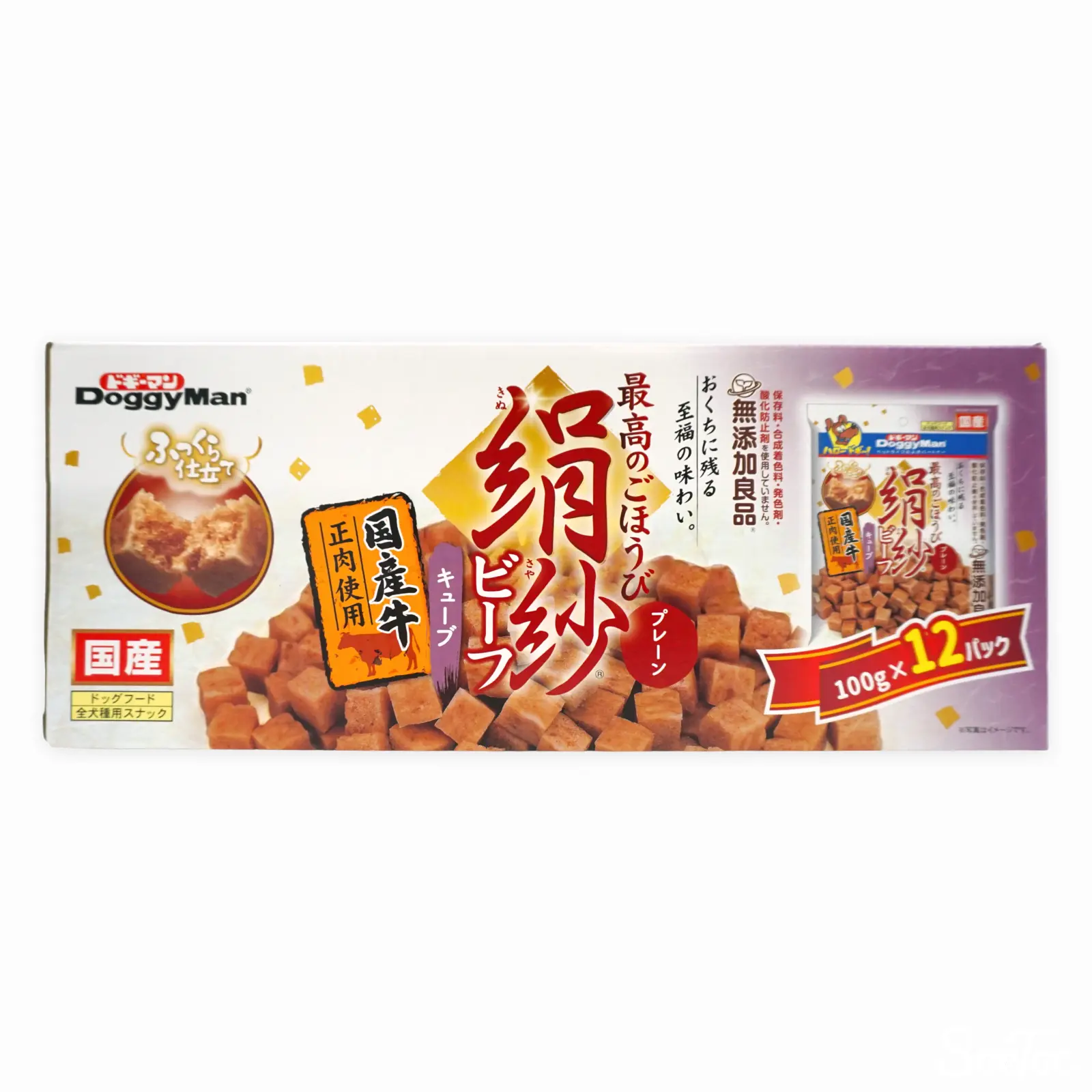 ※こちらの商品はペットフードです※ドギーマンの犬用おやつです。無添加で国産牛が使用されており、やわらかいキューブ状になっています。100g入りパックが12袋のセットになります。