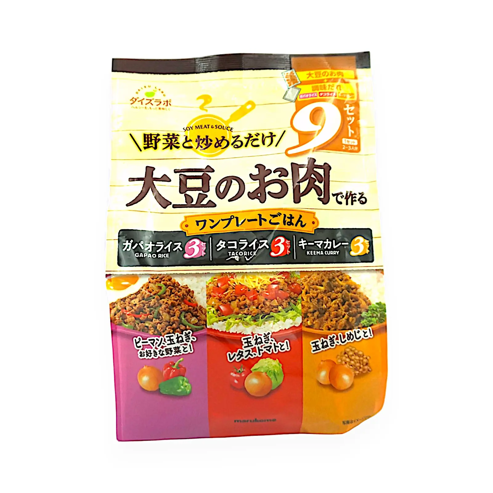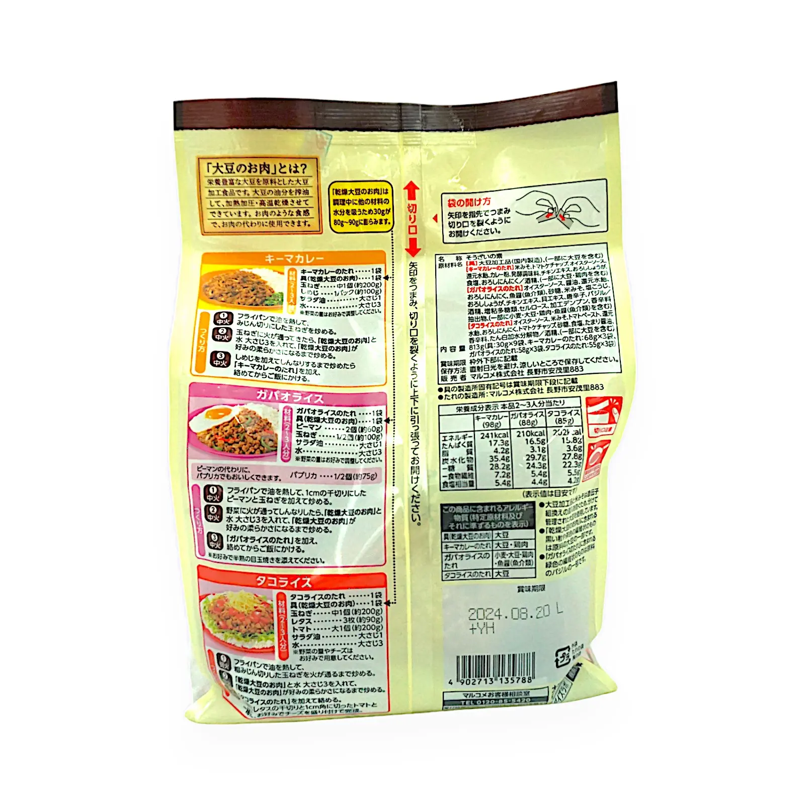 | 原材料名 | [具]大豆加工品(国内製造)、(一部に大豆を含む) [キーマカレーのたれ]米みそ、トマトケチャップ、オイスターソース、還元水飴、カレー粉、発酵調味料、チキンエキス、おろししょうが、食塩、おろしにんにく/酒精、(一部に大豆・鶏肉を含む) [ガパオライスのたれ]オイスターソース、醤油、還元水飴、おろしにんにく、魚醤(魚介類)、砂糖、米みそ、塩こうじ、おろししょうが、チキンエキス、貝エキス、唐辛子、バジル/酒精、増粘多糖類、セルロース、加エデンプン、香辛料抽出物、(一部に小麦・大豆・鶏肉・魚醤(魚介類)を含む) [タコライスのたれ]オイスターソース、米みそ、トマトペースト、還元水飴、おろしにんにく、トマトケチャップ、砂糖、食塩、たまり醤油、香辛料、たん白加水分解物/酒精、(一部に大豆を含む) |