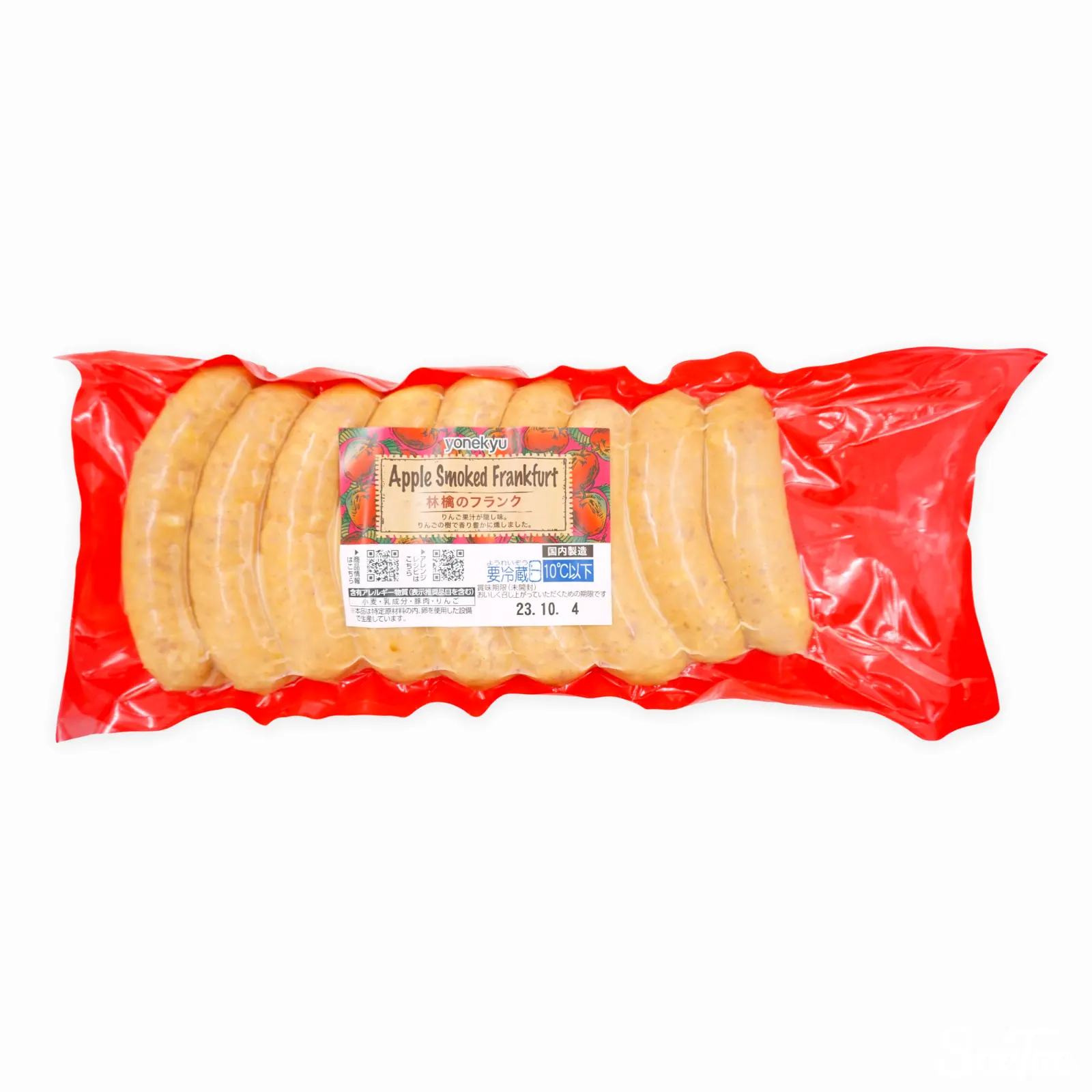 米久より、りんご果汁7%、りんごの樹でスモークしたフランクフルトです。9本程度837gのパックとなります。かなり太いため、加熱時は茹でていただき、その後お好みでフライパン等で焼き目をつけてお召し上がりください。