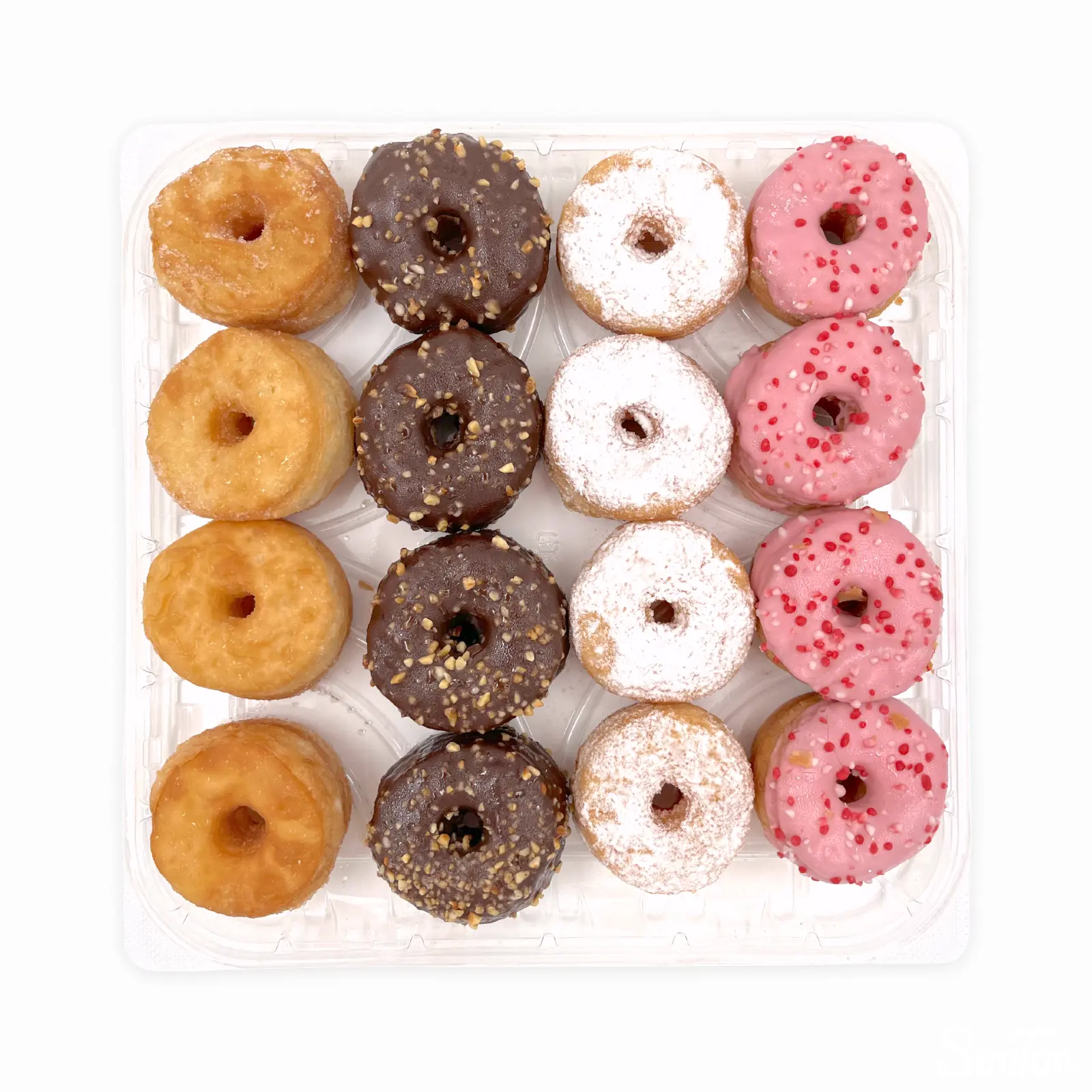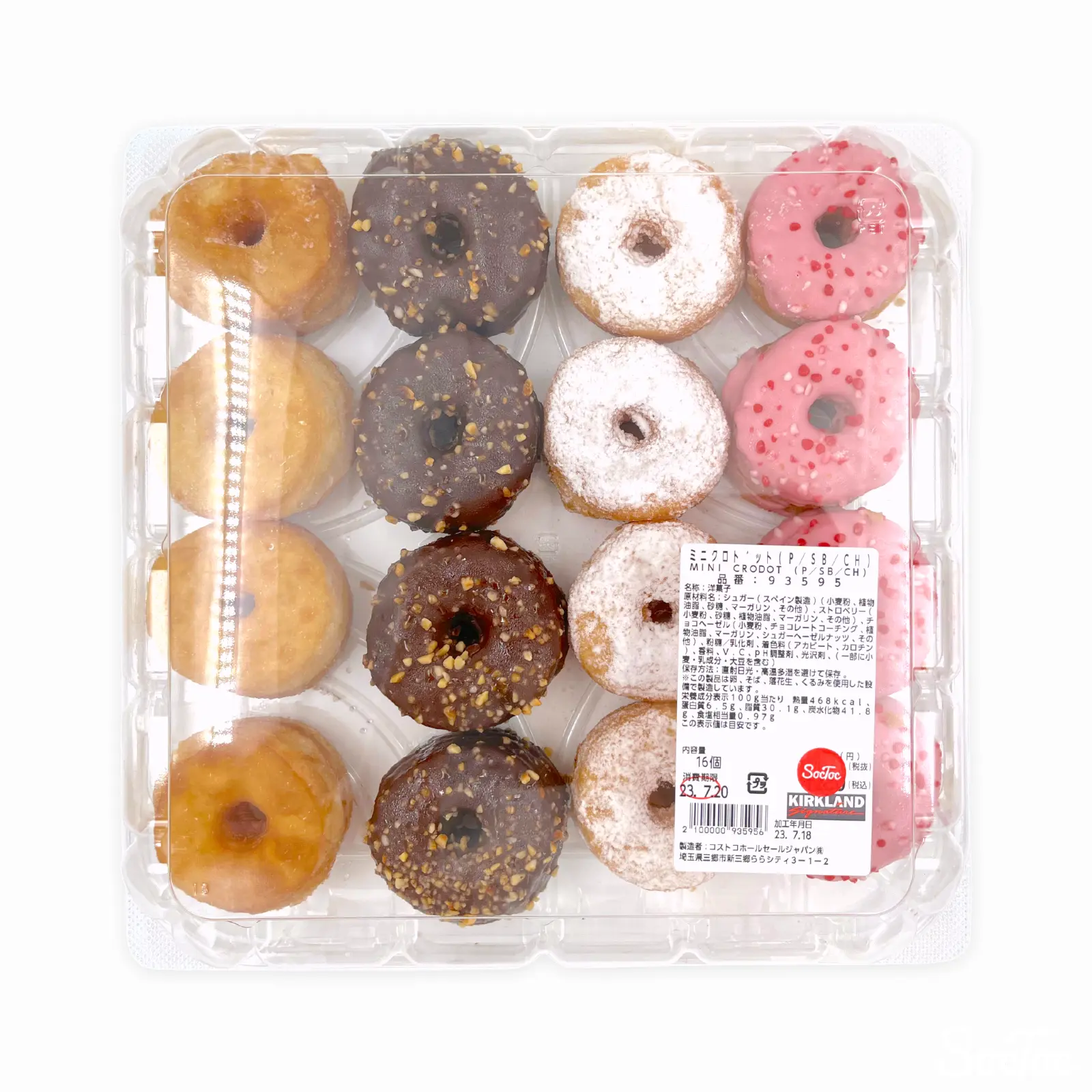 ベーカリーの人気商品、クロワッサンドーナツのプレーン&シュガー&ストロベリー&チョコヘーゼルのセットです。一つ5〜6cmほどの大きさのミニドーナツが4個ずつ入っています。