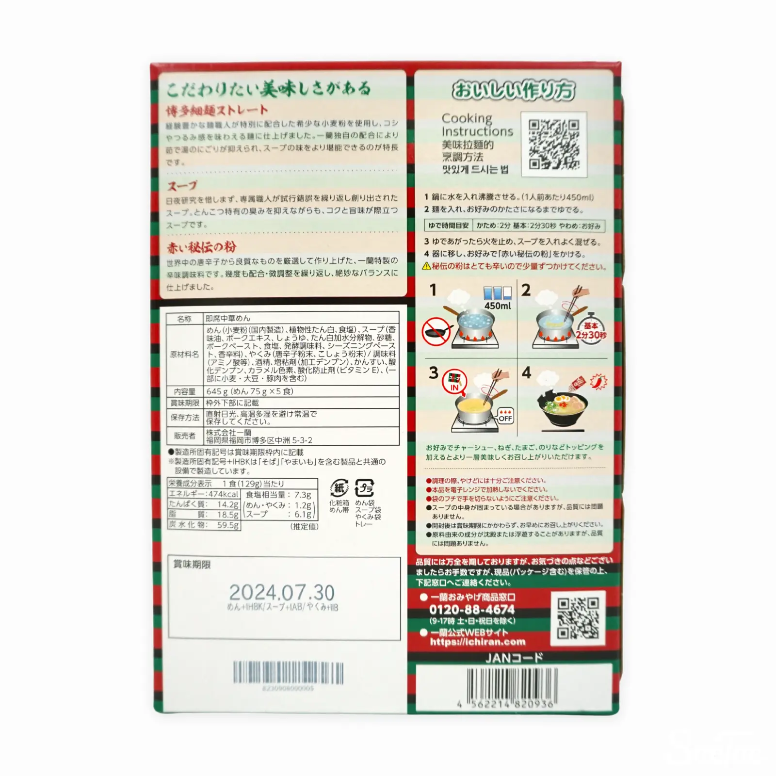 | 栄養成分表示 | 1食(129g)当たり エネルギー:474kcal、たんぱく質:14.2g、脂質:18.5g、炭水化物:59.5g、食塩相当量:7.3g(めん・やくみ:1.2g、スープ: 6.1 g) |