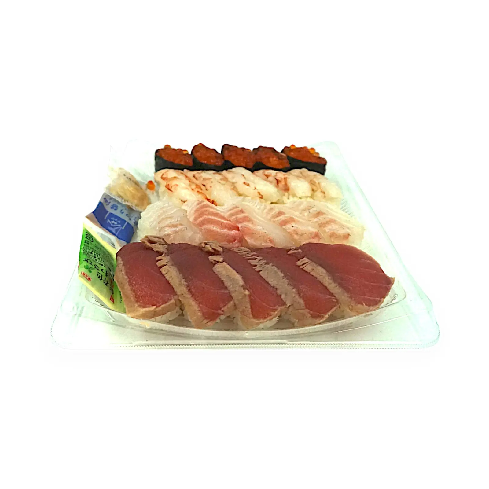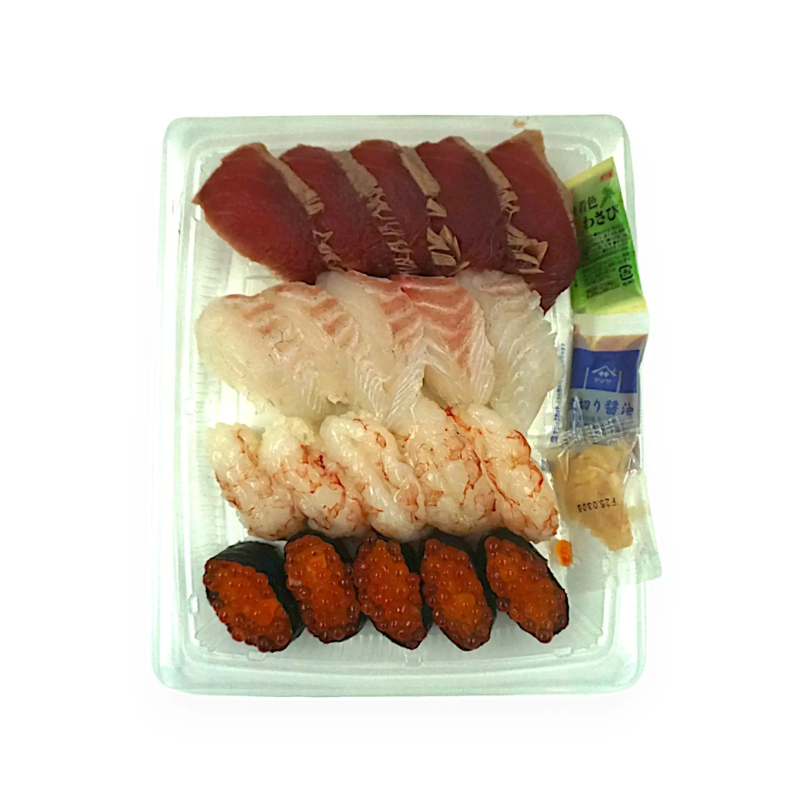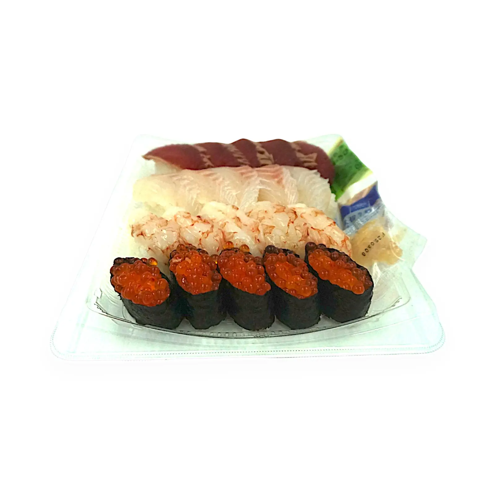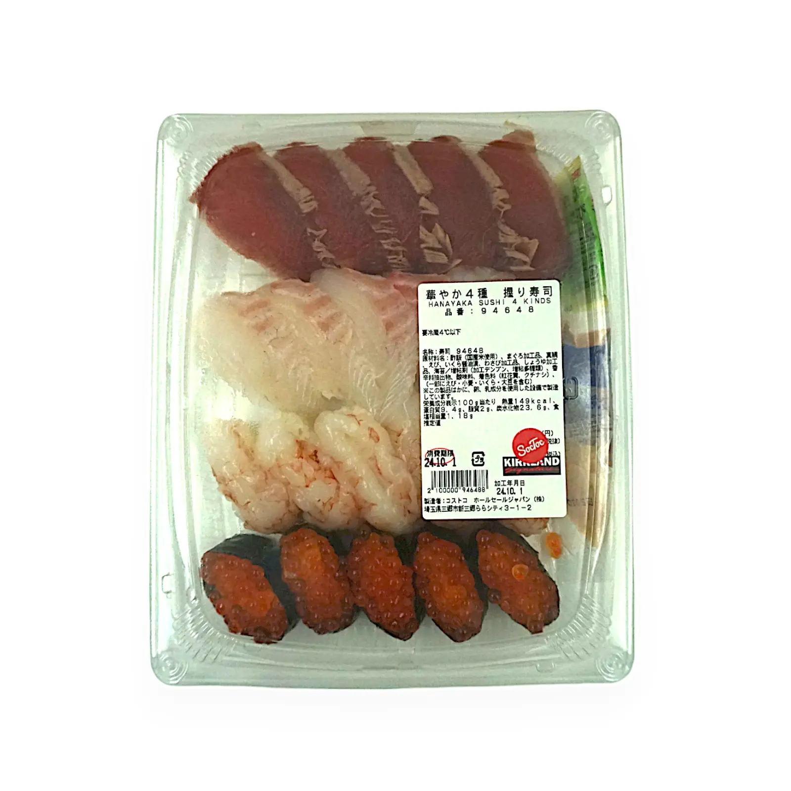 酢飯(国産米使用)、まぐろ加工品、真鯛、えび、いくら醤油漬、わさび加工品、しょうゆ加工品、海苔/香辛料抽出物、酸味料、増粘多糖類、着色料(紅花黄、クチナシ)、(一部にえび・小麦・いくら・大豆を含む)