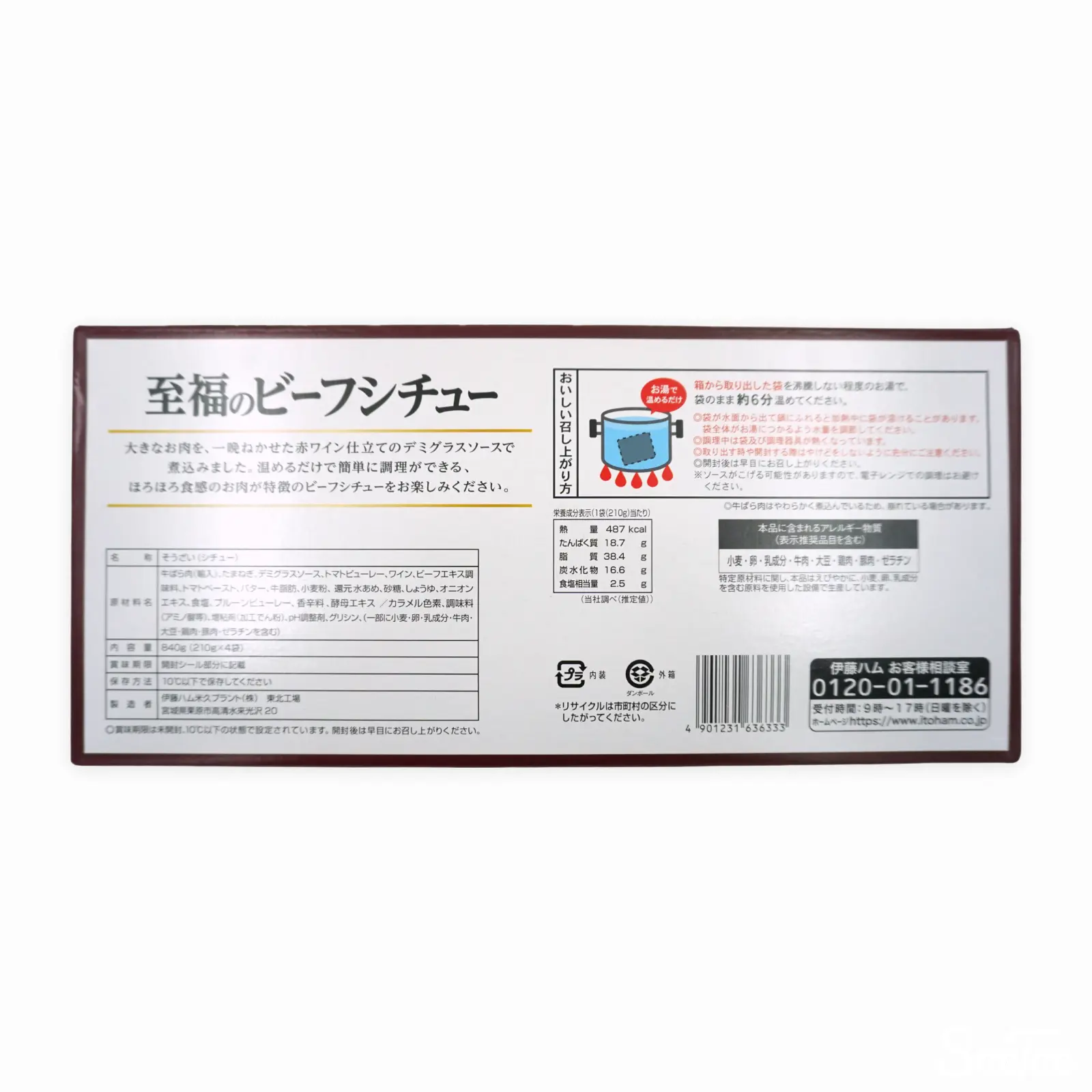 伊藤ハムより、ビーフシチューです。210g入りの一人分が4袋セットになっており、湯煎で温めて完成となります。バゲットなどと合わせてお召し上がりください。