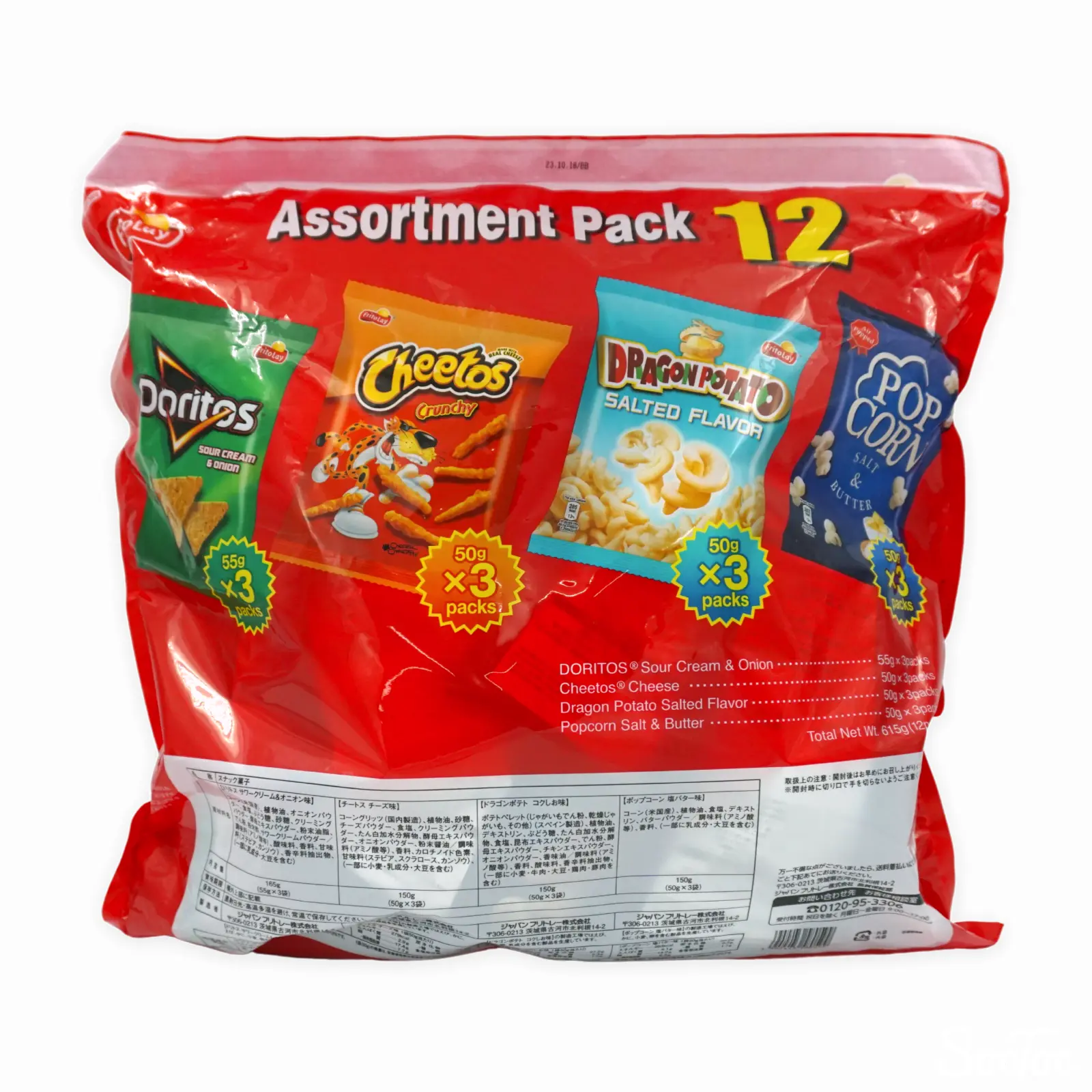 フリトレーのチップスのアソートパックです。Doritos サワークリーム&オニオン味、Cheetos チーズ味、ドラゴンポテト うすしお味、POP CORN 塩バター味がそれぞれ3袋ずつ、計12袋が入っています。
