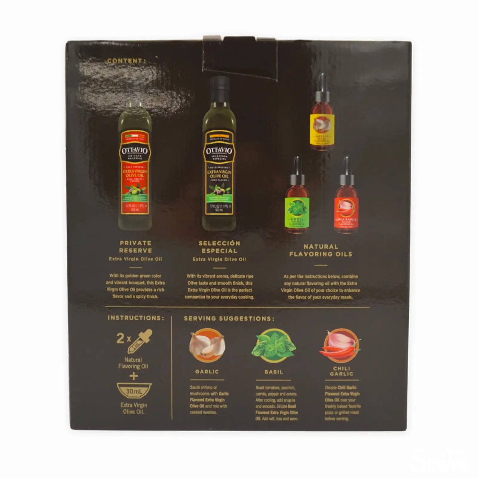 オッタビオより、オリーブオイルと香辛料のセットです。イタリア産エクストラバージンオリーブオイル、スペイン産エクストラバージンオリーブオイル、チリガーリック、ガーリック、バジルがそれぞれ1本ずつ入っています。