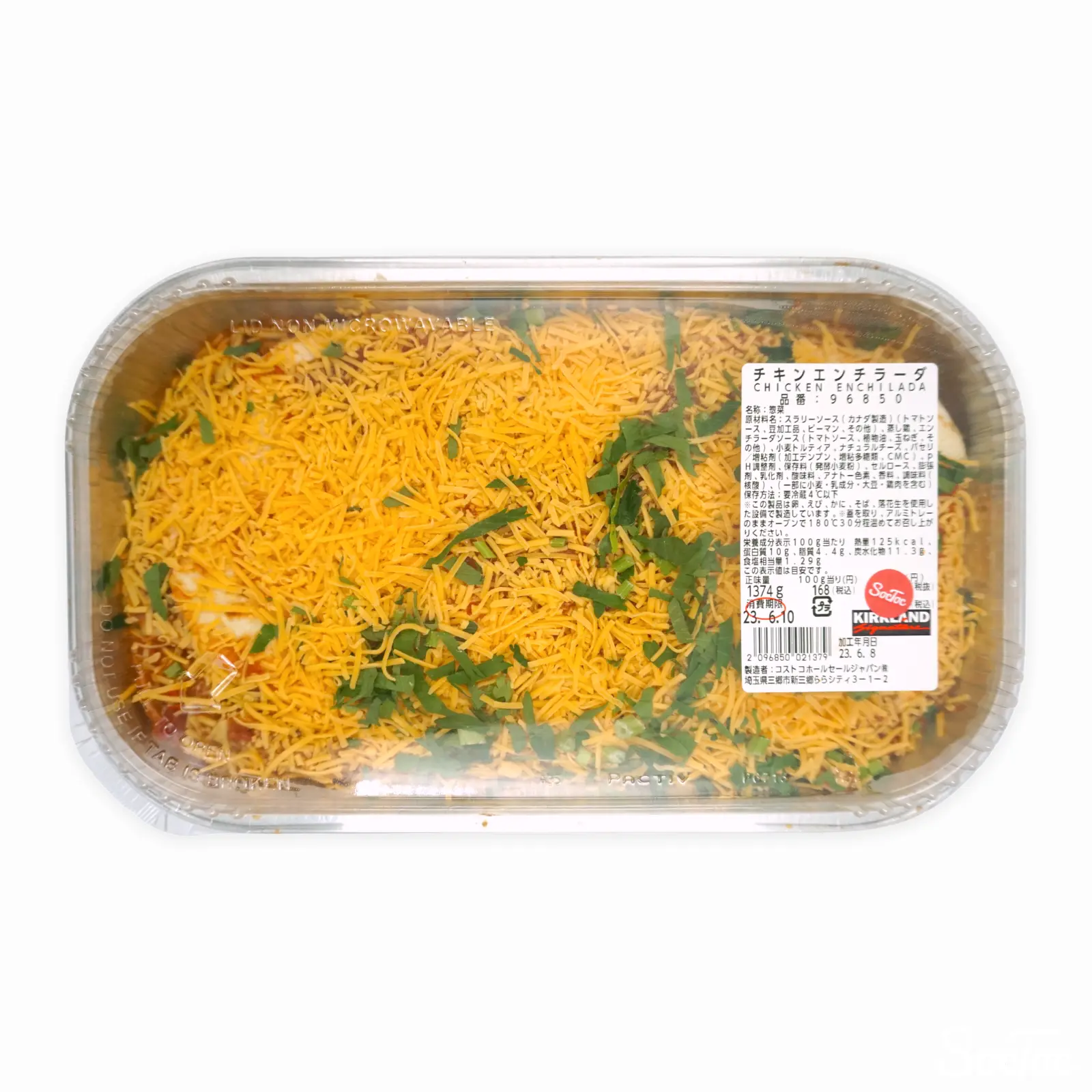 メキシコ料理のチキンエンチラーダです。蒸し鶏とピーマンなどの野菜にトルティーヤを乗せてあり、トマトをベースにしたエンチラーダソースにスラリーソースとたっぷりのチーズがかかっています。180度のオーブンで30分加熱して完成となります。