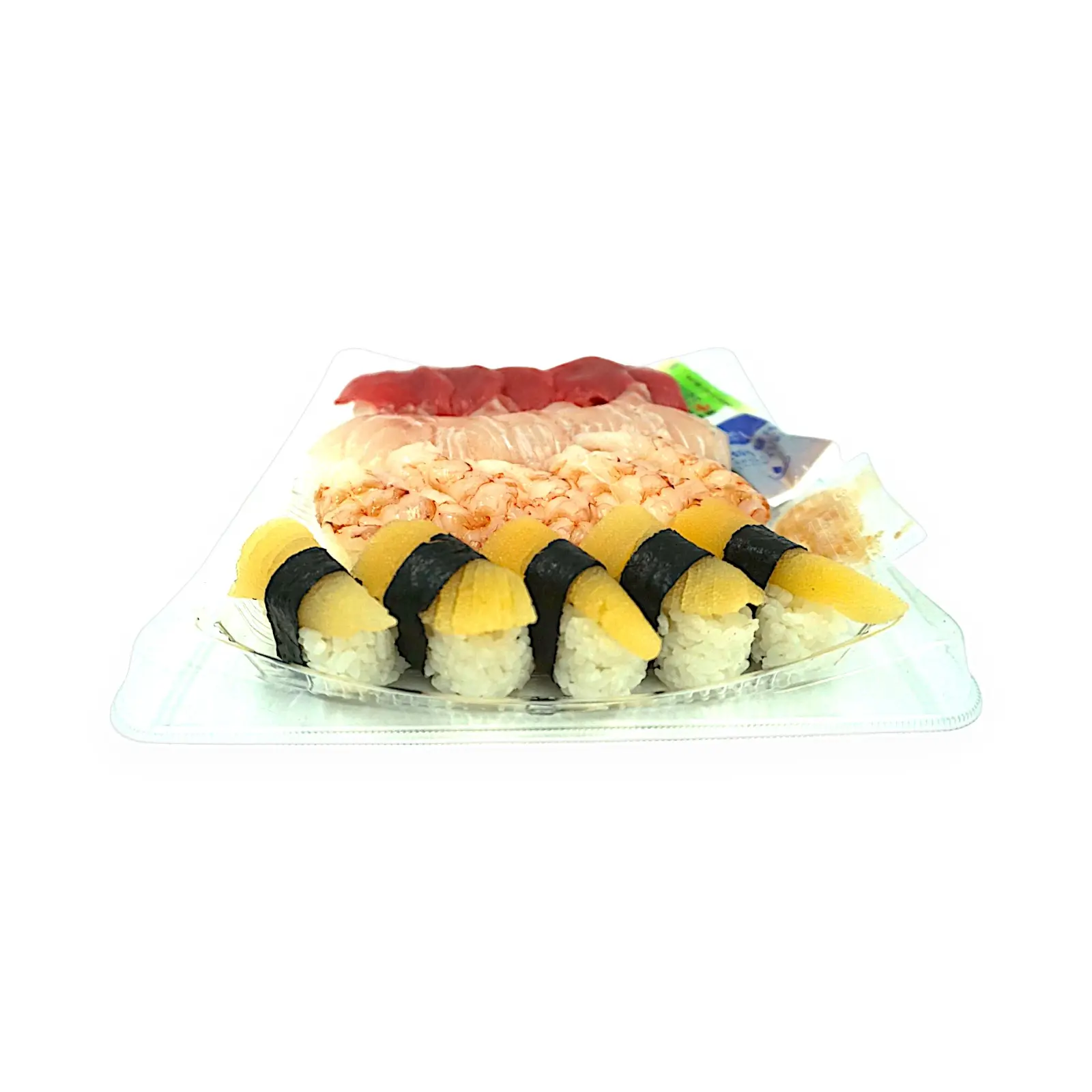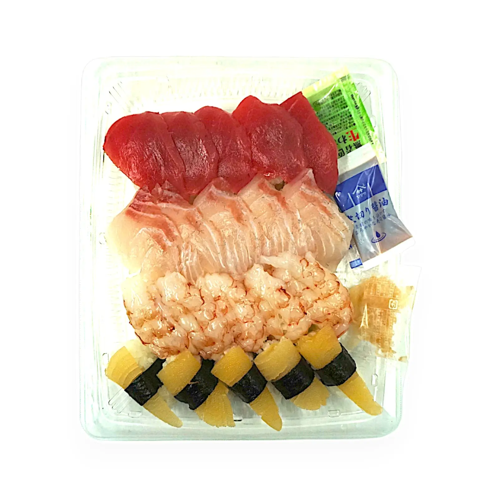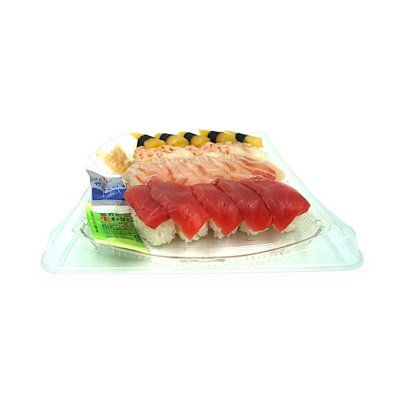 酢飯(国産米使用)、本まぐろ、真鯛、えび、味付数の子、わさび加工品、しょうゆ加工品、海苔/香辛料抽出物、酸味料、増粘多糖類、着色料(紅花賞、クチナシ)、(一部にえび・小麦・大豆を含む)