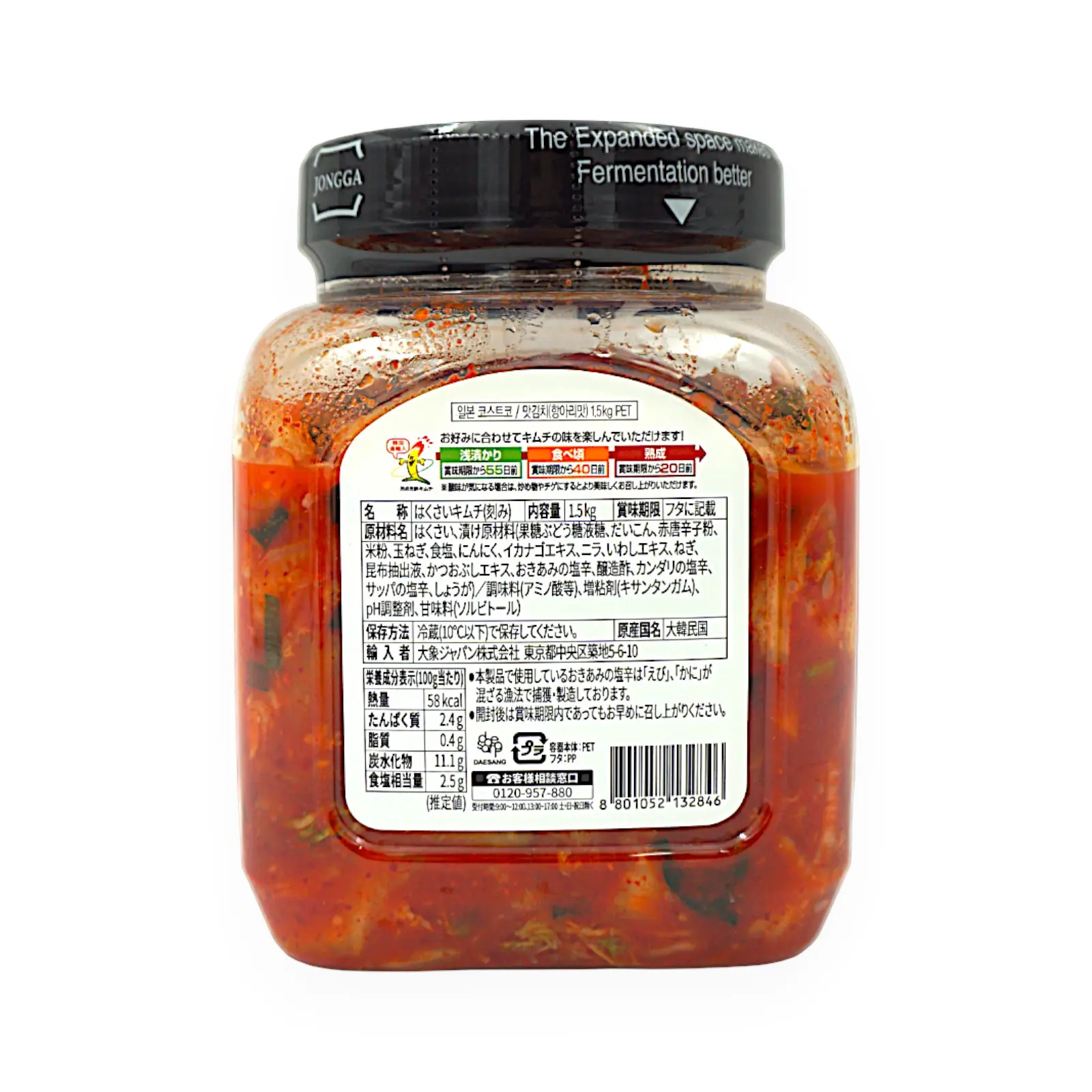 | 原材料名 | はくさい、漬け原材料(果糖ぶどう糖液糖、だいこん、赤唐辛子粉、米粉、玉ねぎ、食塩、にんにく、イカナゴエキス、ニラ、いわしエキス、ねぎ、昆布抽出液、かつおぶしエキス、おきあみの塩辛、醸造酢、カンダリの塩辛、サッパの塩辛、しょうが)/調味料(アミノ酸等)、増粘剤(キサンタンガム)、pH調整剤、甘味料(ソルビトール) |