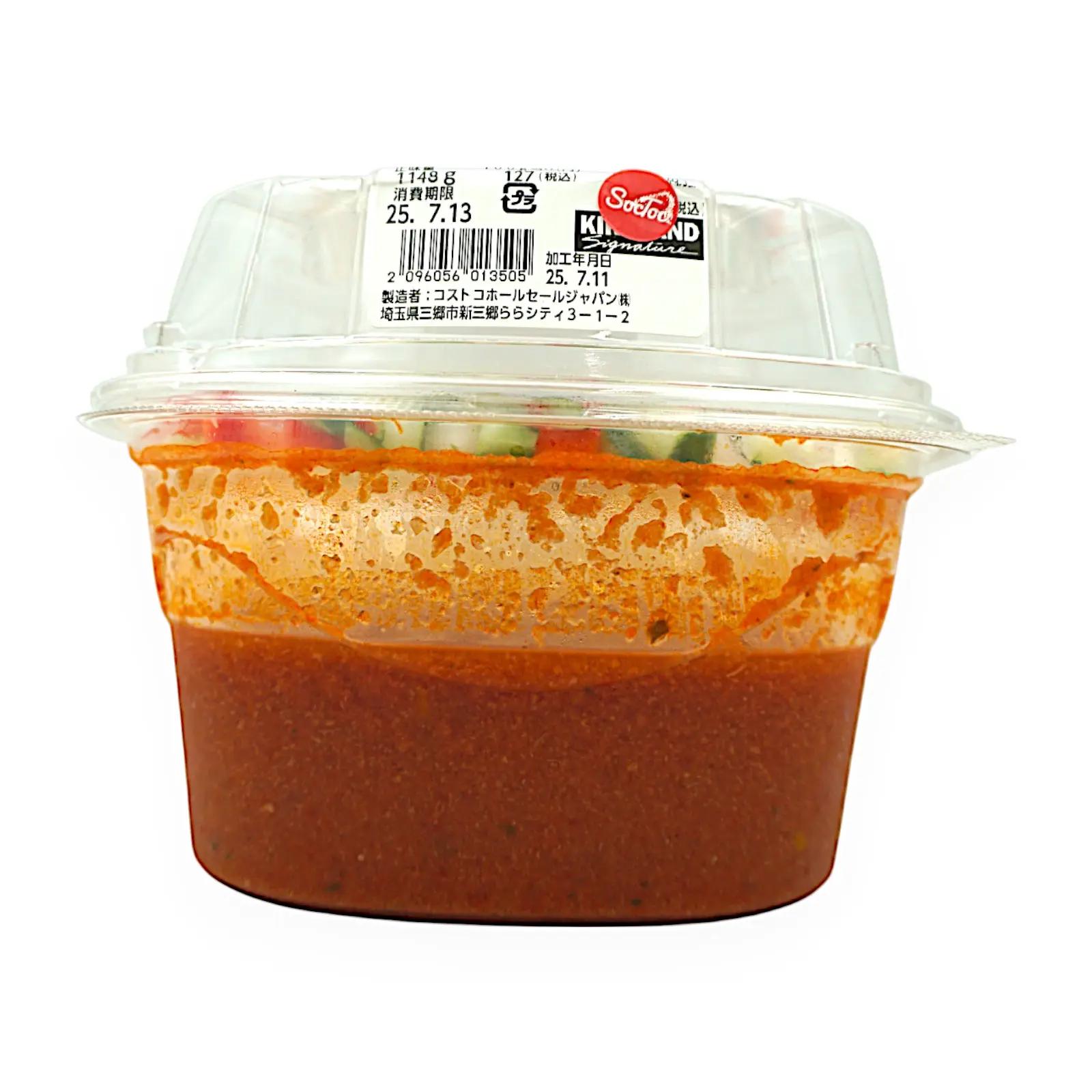 スープ(国内製造)(トマトビューレ、野菜(玉ねぎ、きゅうり、セロリ、赤ピーマン、黄ピーマン、にんにく)、パン粉、トマトケチャップ、オリーブ油、食塩、ゆず皮、白胡椒)、ガスパチョ用野菜ミックス(きゅうり、タマネギ、赤パプリカ)/イーストフード、V.C(一部に小麦を含む)
