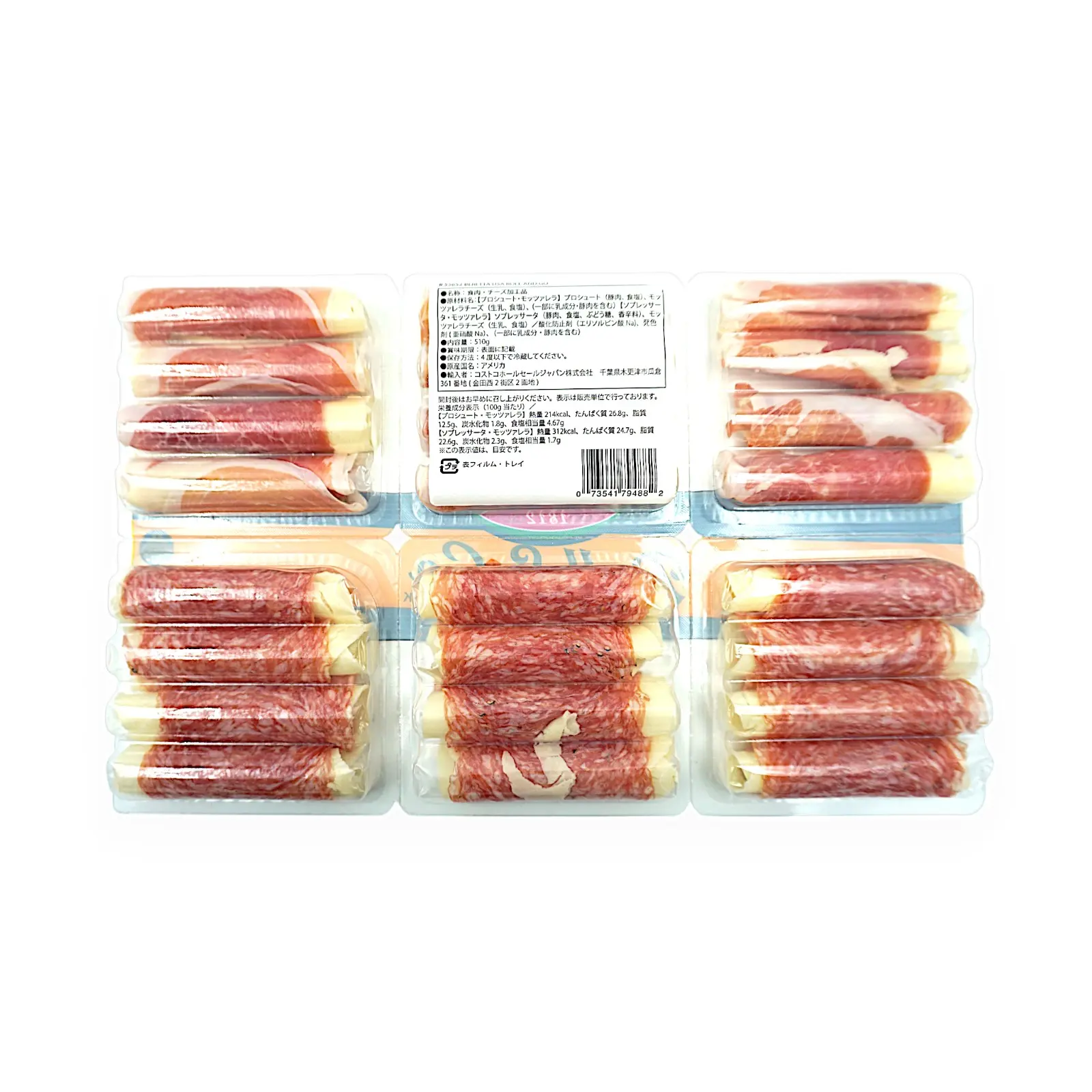 | 栄養成分表示 | 100g当たり 【プロシュート・モッツァレラ】熱量214kcal、たんぱく質26.8g、脂質12.5g、炭水化物1.8g、食塩相当量4.67g 【ソプレッサータ・モッツァレラ】熱量312kcal、たんぱく質24.7g、脂質22.6g、炭水化物2.3g、食塩相当量1.7g |
