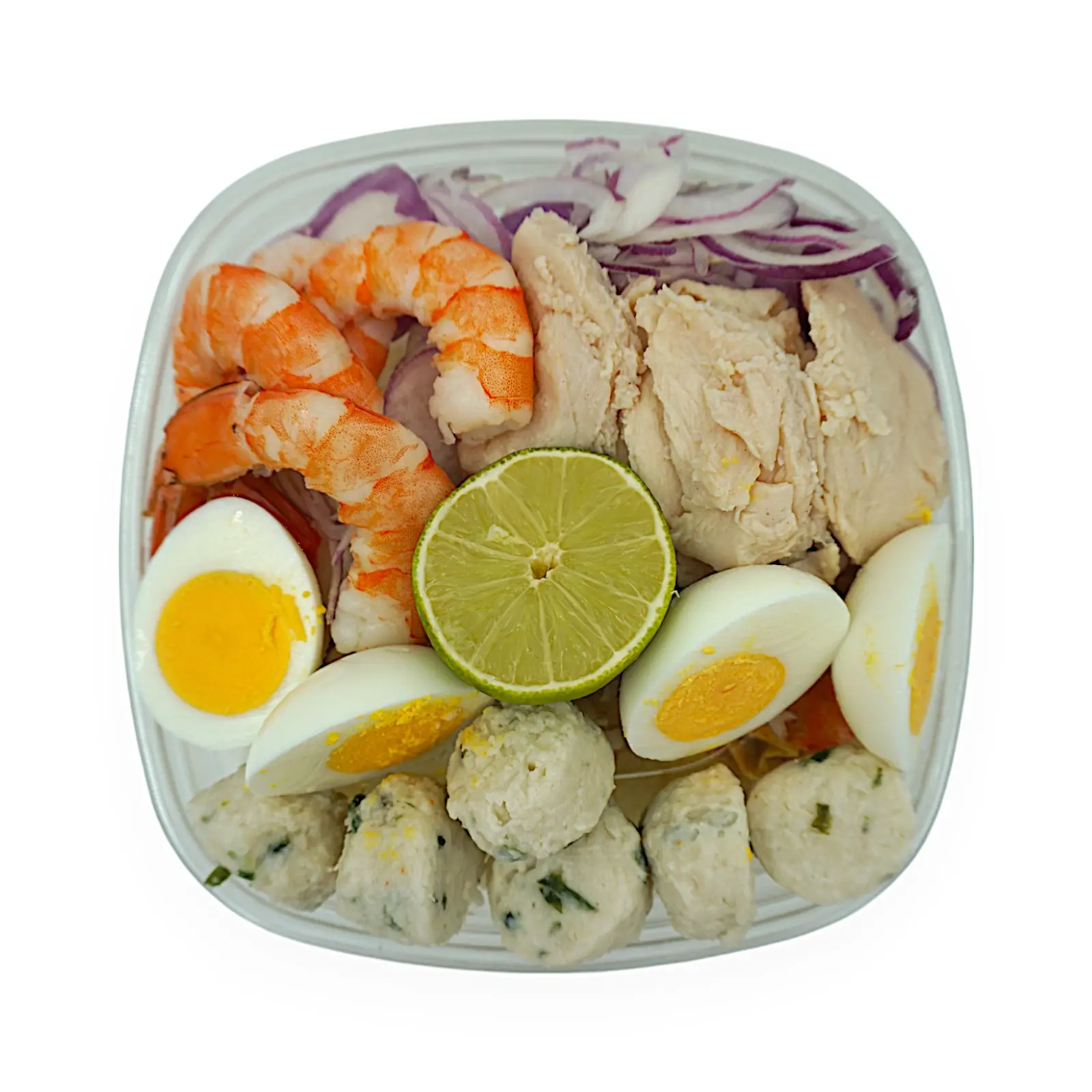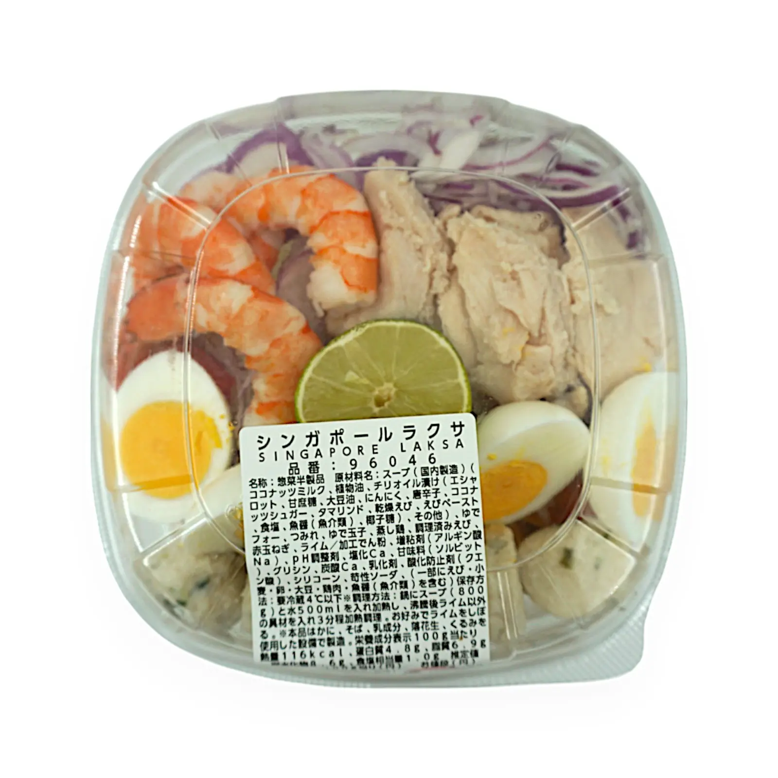 | 原材料名 | スープ(国内製造)(ココナッツミルク、植物油、チリオイル漬け(エシャロット、甘庶糖、大豆油、にんにく、唐辛子、ココナッツシュガー、タマリンド、乾燥えび、えびペースト、食塩、魚醤(魚介類)、椰子糖)、その他)、ゆでフォー、つみれ、ゆで玉子、蒸し鶏、鯛理済みえび、赤玉ねぎ、ライム/加工でん粉、増粘剤(アルギン酸Na)、pH調整剤、塩化Ca、甘味料(ソルビット)、グリシン、炭酸Ca、乳化剤、酸化防止剤(クエン酸)、シリコーン、苛性ソーダ、(一部にえび・小麦・卵・大豆・鶏肉・魚醤(魚介類)を含む) |