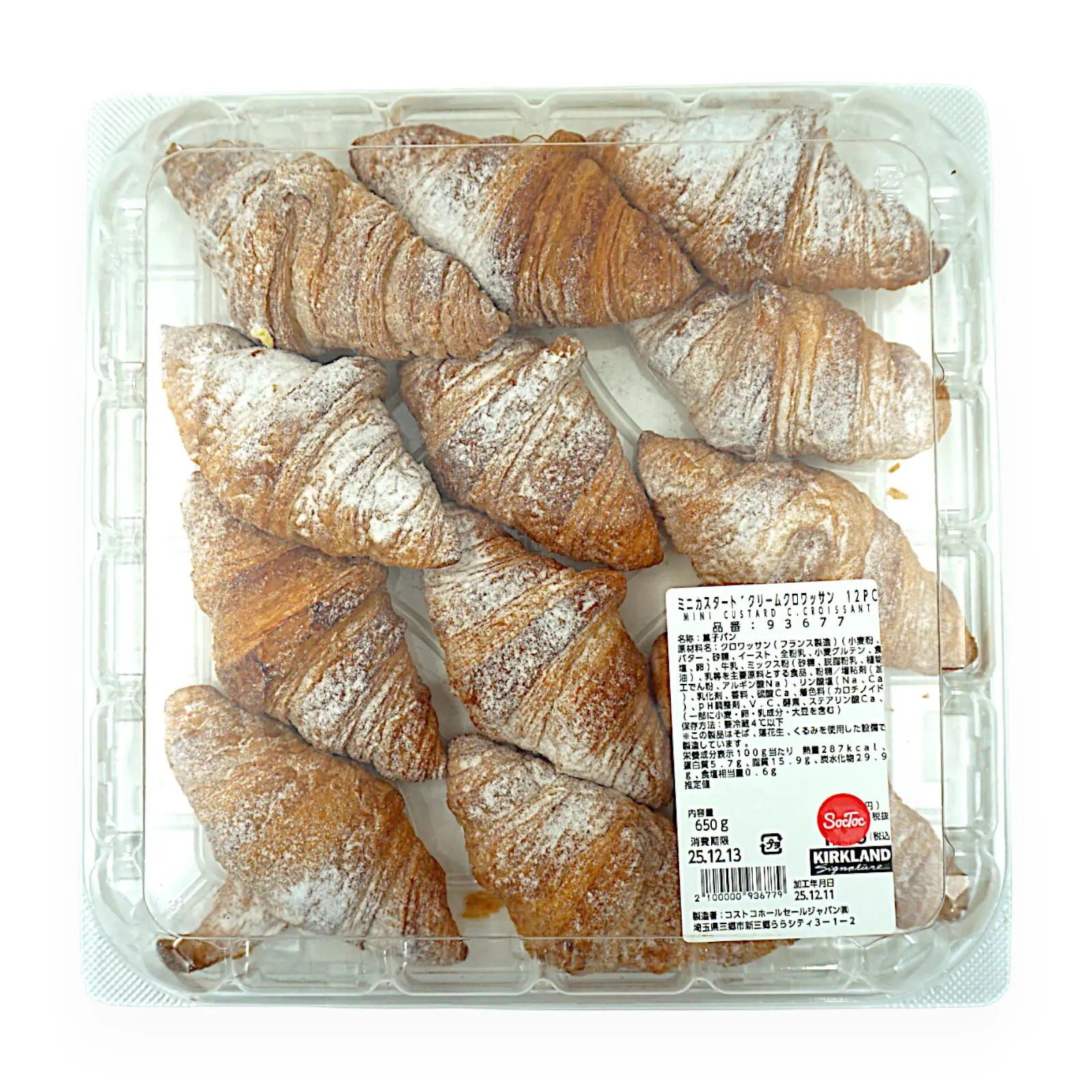 | 原材料名 | クロワッサン(フランス製造)(小麦粉、パター、砂糖、イースト、全粉乳、小麦グルテン、食塩、卵)、牛乳、ミックス粉(砂稲、脱脂粉乳、植物油)、乳等を主要原料とする食品、粉糖/増粘剤(加エでん粉、アルギン酸Na)、リン酸塩(Na、Ca)、乳化剤、香料、硫酸Ca、着色料(カロチノイド) 、pH調剤、V.C、酵素、ステアリン酸Ca、(一部に小麦・卵・乳成分・大豆を含む) |