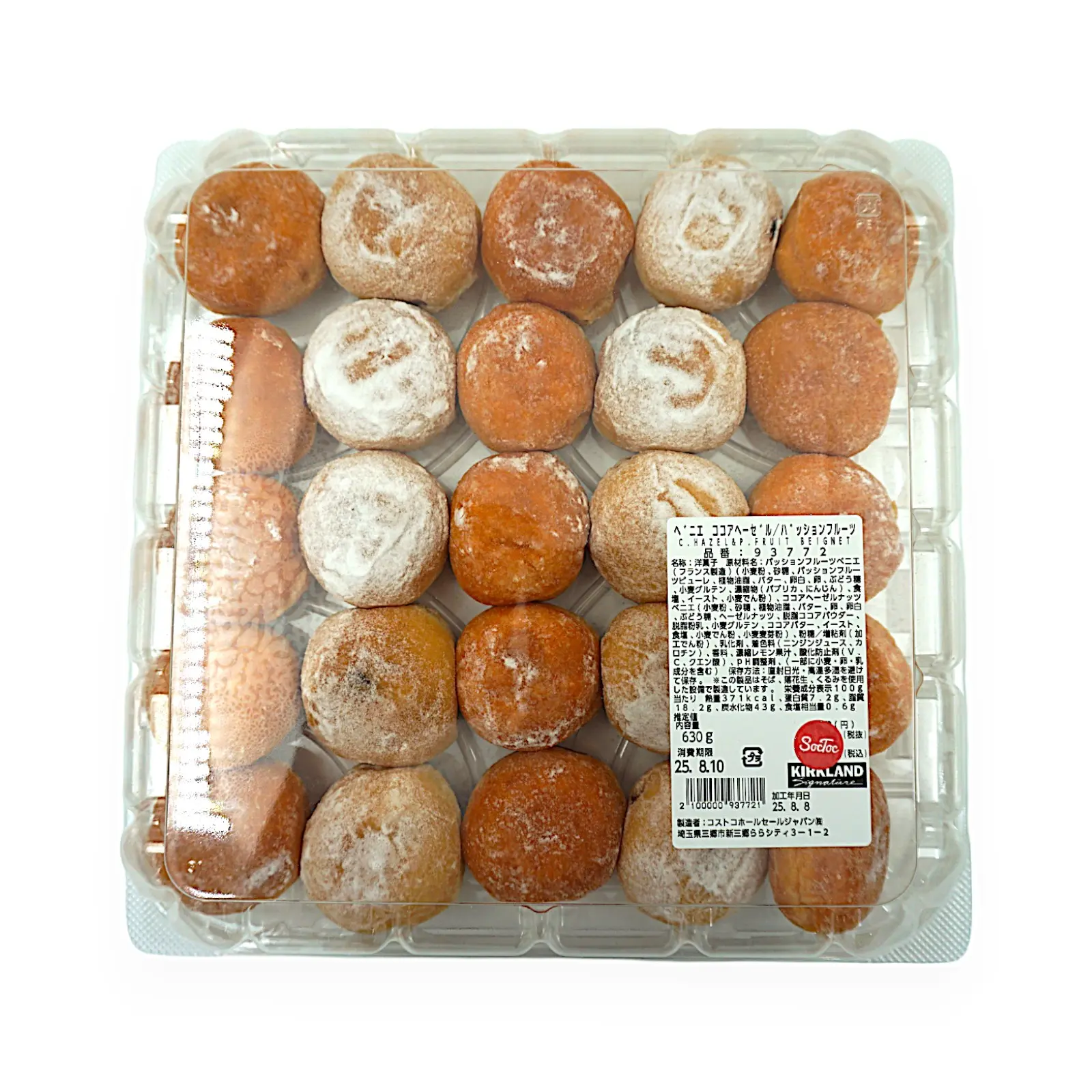 | 原材料名 | パッションフルーツベニエ(フランス製造)(小麦、砂糖、パッションフルーツピューレ、植物油脂、バター、卵白、卵、ぶどう糖、小麦グルテン、濃縮物(パプリカ、にんじん)、食塩、イースト、小麦でん粉)、ココアヘーゼルナッツベニエ(小麦粉、砂糖、植物油脂、バター、卵、卵白、ぶどう糖、ヘーゼルナッツ、脱脂ココアパウダー、脱脂粉乳、小麦グルテン、ココアバター、イースト、食塩、小麦でん粉、小麦芽粉)、粉糖/増粘剤(加工でん粉)、乳化剤、着色料(ニンジンジュース、カロチン)、香料、濃縮レモン果汁、酸化防止料(V.C、クエン酸)、pH調製剤。(一部に小麦・卵・乳成分を含む) |