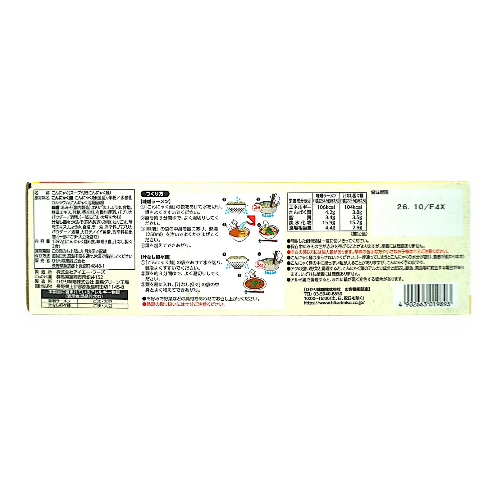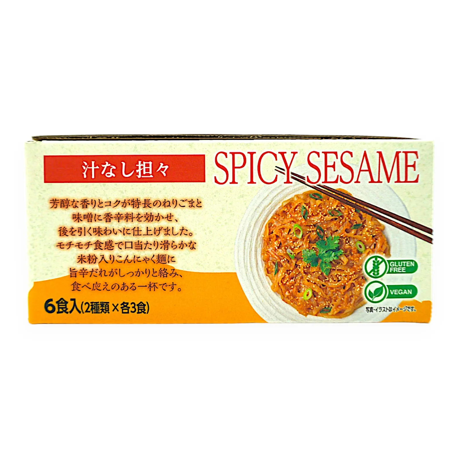 | 原材料名 | こんにゃく麺:こんにゃく粉(国産)、米粉/水酸化カルシウム(こんにゃく用凝固剤) 味噌:米みそ(国内製造)、ねりごま、しょうゆ、食塩、酵母エキス、砂糖、香辛料、有機料理酒、パプリカパウダー/酒精、(一部にごま・大豆を含む) 汁なし担々:米みそ(国内製造)、砂糖、ねりごま、酵母エキス、しょうゆ、食塩、ラー油、香辛料、パプリカパウダー/酒精、カロテノイド色素、香辛料抽出物、(一部にごま・大豆を含む) |