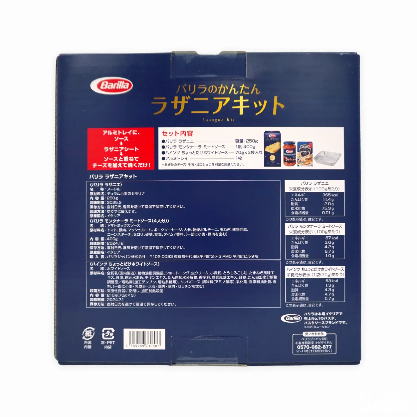 バリラのラザニアキットです。茹でずにそのまま使えるラザニア、ミートソース、ホワイトソースと焼き上げ用のアルミトレイが入っており、手元にはチーズ、牛乳、塩胡椒を用意するだけで手軽にラザニアをお作りいただけます。