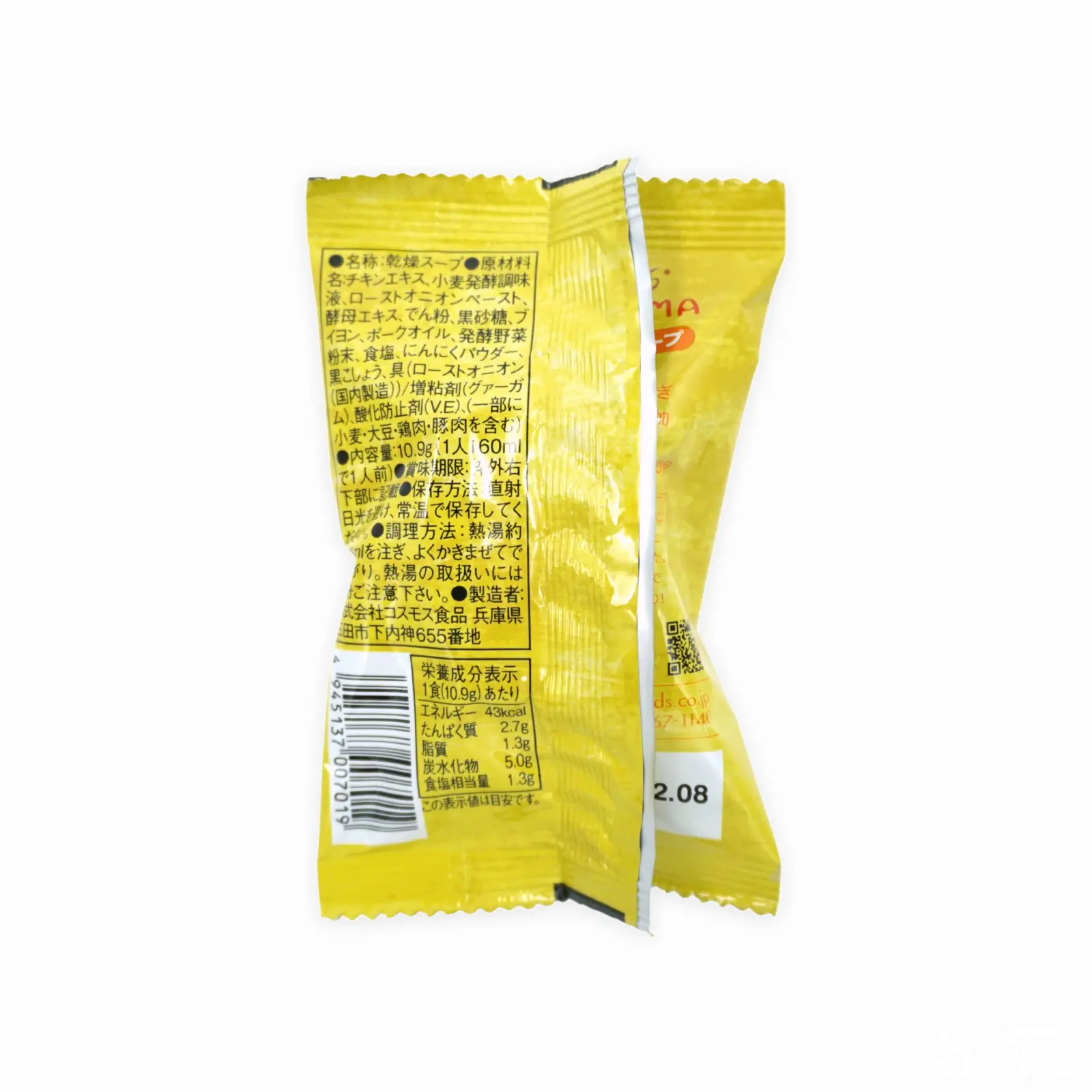 チキンエキス、小麦発酵調味液、ローストオニオンペースト、酵母エキス、でん粉、黒砂糖、ブイヨン、ポークオイル、発酵野菜粉末、食塩、にんにくパウダー、黒こしょう、具(ローストオニオン(国内製造)/増粘剤(グァーガム)、酸化防止剤(V.E)、(一部に小麦・大豆・鶏肉・豚肉を含む)