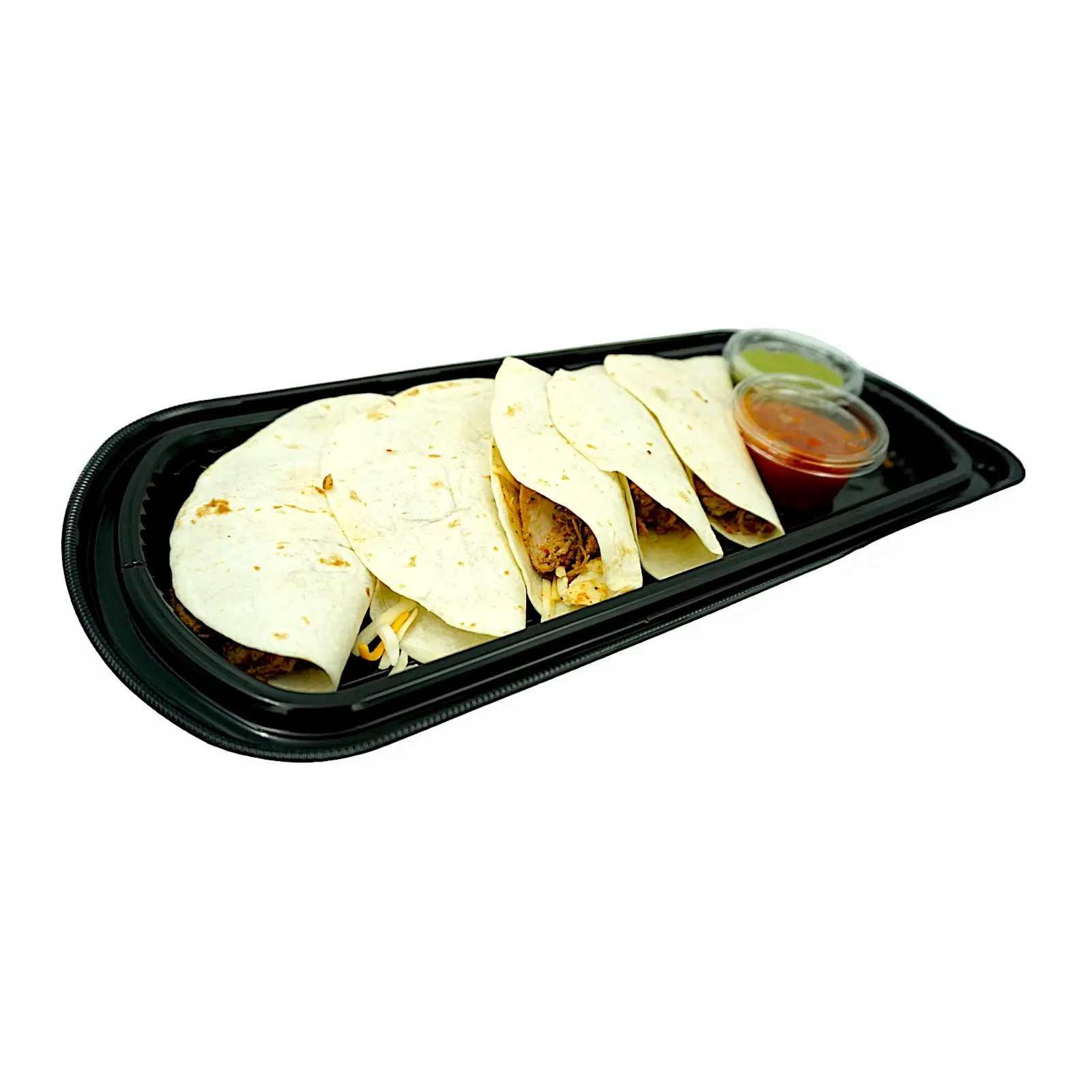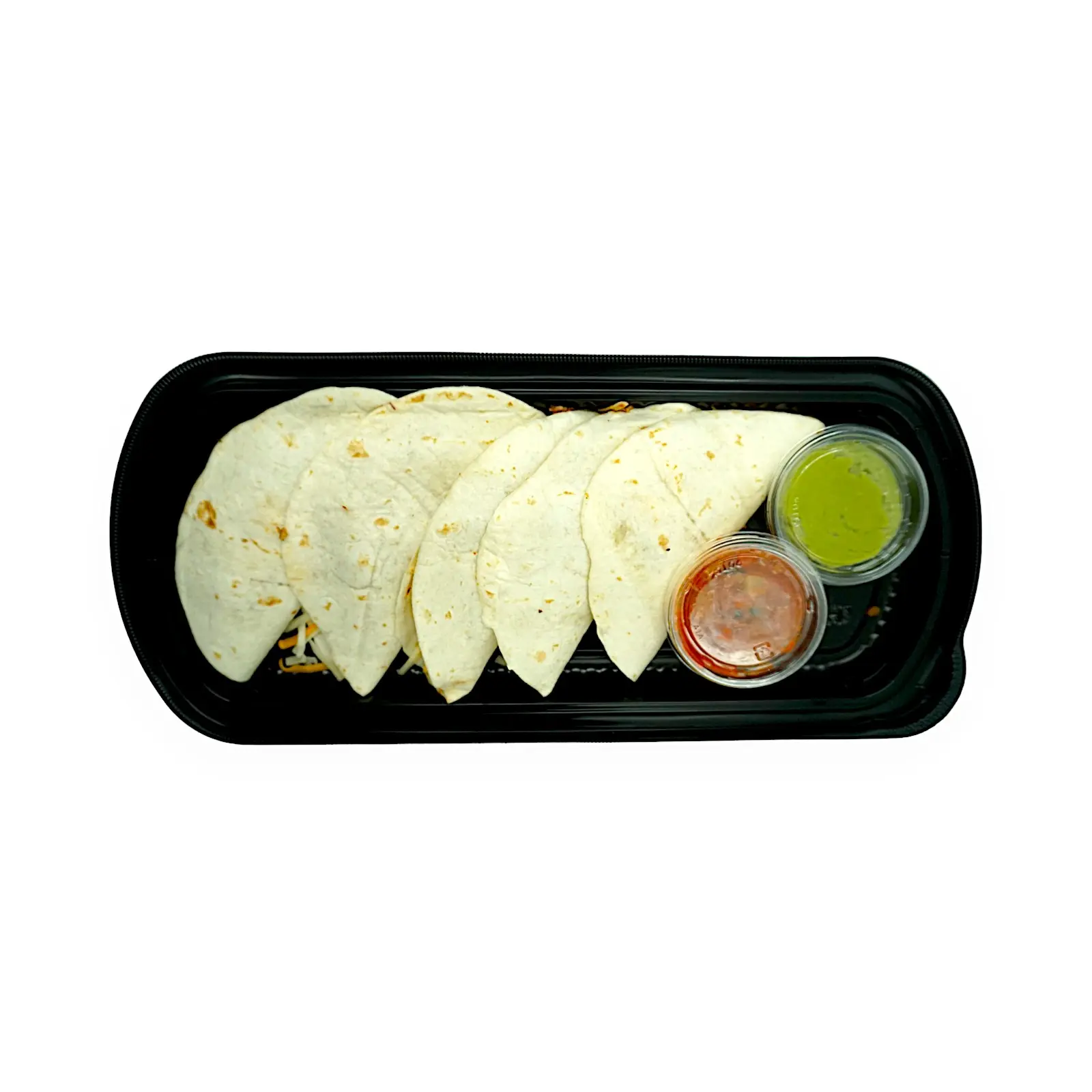 メキシコ料理のチキンケサディーヤ5つ入りのパックです。辛味は抑えめに作られており、別途アボカドペースト、サルサソースがついています。フライパンで両面を加熱して完成となります。