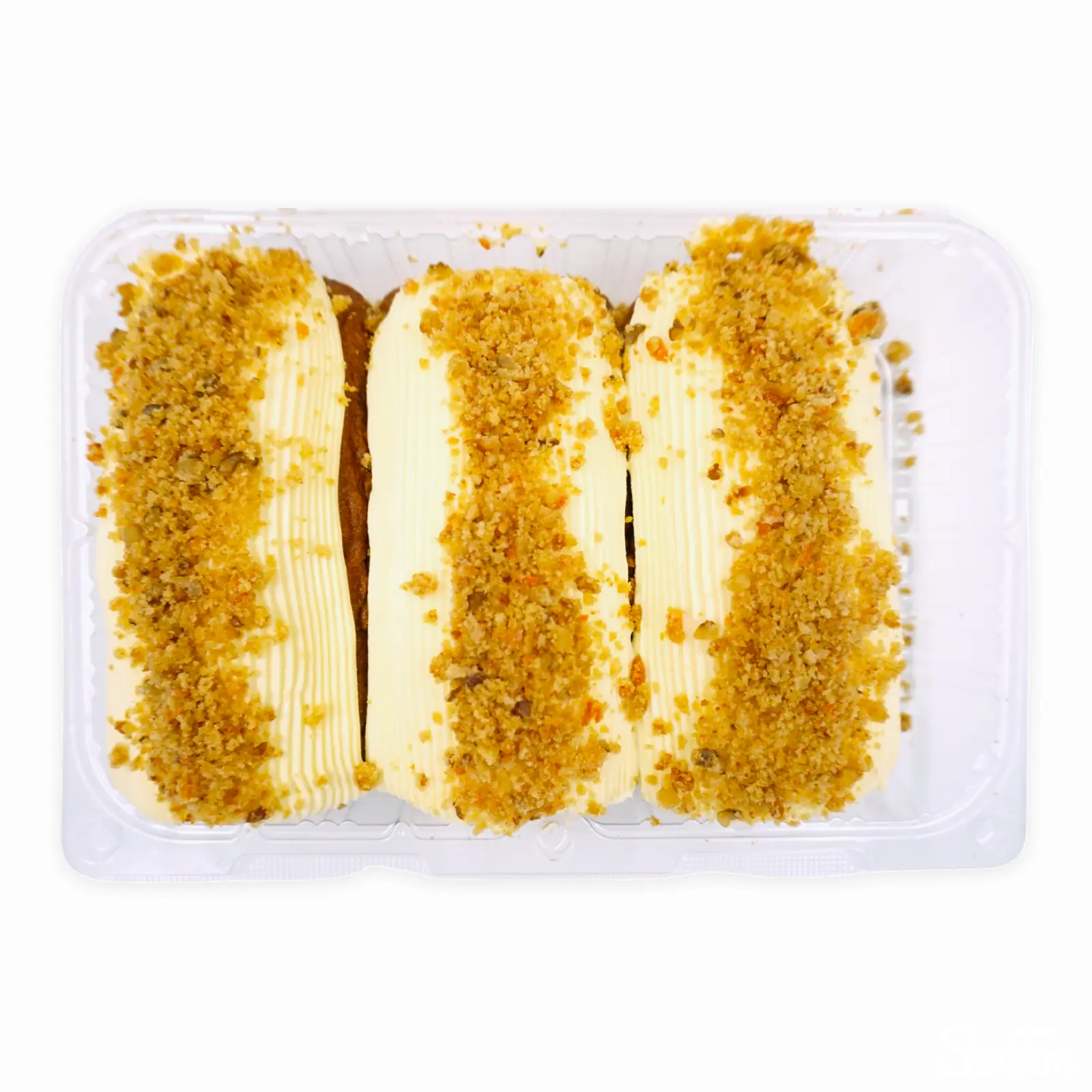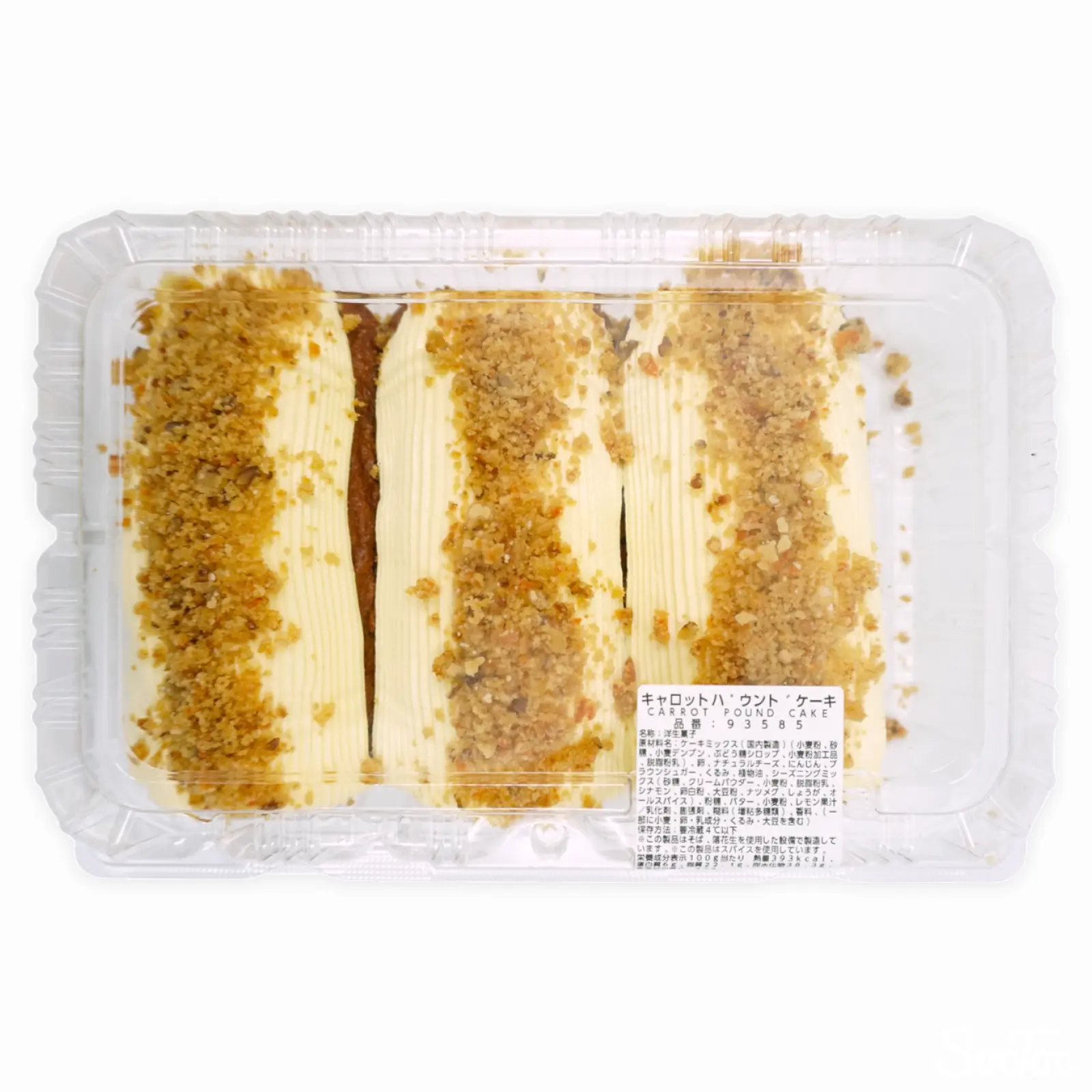 要冷蔵のキャロットケーキ3本のパックです。にんじんのほか、各種スパイスとたっぷりのくるみが練り込まれたパウンドケーキで、優しい甘さに仕上がっています。
