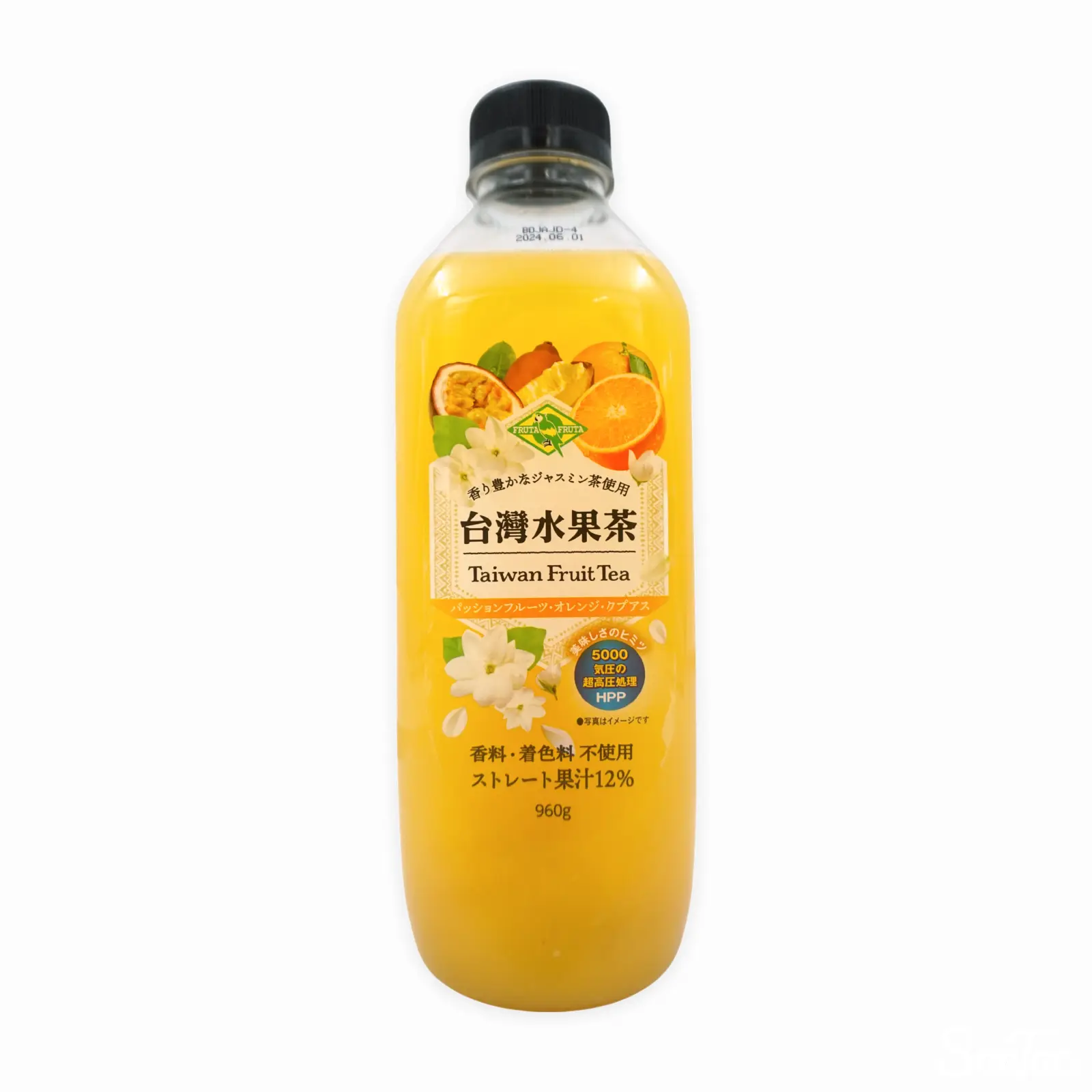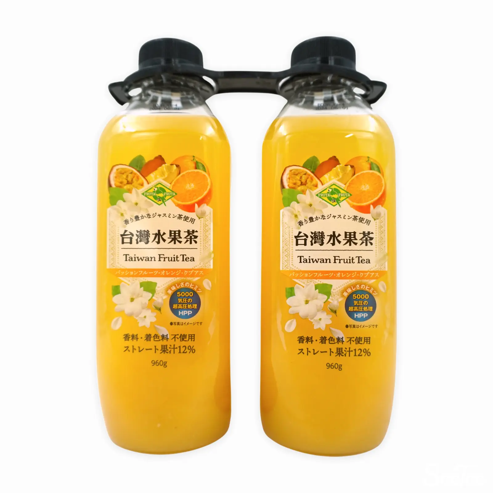 フルッタフルッタの台湾フルーツティー960g入りのボトル2本です。ジャスミンティーにパッションフルーツ、オレンジ、アマゾンフルーツのクプアス果汁が入っています。ストレート果汁12%で爽やかな甘さです。ホットでもおいしくお召し上がりいただけます。